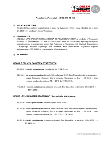Regulamin Płatności – BIEG NA 10 KM 1) OPŁATA STARTOWA Opłata startowa dotyczy uczestnictwa w biegu na dystansie 10 km , który odbędzie się w dniu 24.04.2016 r. na ulicach miasta Warszawy. 2) ORGANIZATOR AGENCJA LIVE SPÓŁKA Z OGRANICZONĄ ODPOWIEDZIALNOŚCIĄ, z siedzibą w Warszawie (01-882), ul. Żeromskiego 17C, NIP 521-32-21-905, REGON 015291980) wpisaną do rejestru przedsiębiorców prowadzonego przez Sąd Rejonowy w Warszawie XIII Wydział Gospodarczy – Krajowego Rejestru Sądowego pod numerem KRS 0000134061. Wysokość kapitału podstawowego: 100 000,00 zł – zwana dalej „Organizatorem”. 3) PŁATNOŚCI OPCJA Z PEŁNYM PAKIETEM STARTOWYM 69,00 zł – stawka podstawowa obowiązuje do 17.04.2016 r. 59,00 zł – stawka promocyjna dla osób, które ukończą XXVII Bieg Niepodległości organizowany przez Stołeczne Centrum Sportu Aktywna Warszawa w dniu 11.11.2015 r. oraz wniosą opłatę w terminie od 12.11.2015 do 17.04.2016 r. 110,00 zł – stawka podstawowa opłacana w kasach Biur Zawodów w terminie: 21.04.2016 r. – 23.04.2016 r. OPCJA „TYLKO NUMER STARTOWY” ( bez pakietu startowego) 49,00 zł – stawka podstawowa obowiązuje do 17.04.2016 r. 42,00 zł – stawka promocyjna dla osób, które ukończą XXVII Bieg Niepodległości organizowany przez Stołeczne Centrum Sportu Aktywna Warszawa w dniu 11.11.2015 r. oraz wniosą opłatę w terminie od 12.11.2015 do 17.04.2016 r. 60,00 zł- stawka podstawowa opłacana w kasach Biur Zawodów w terminie: 21.04.2016 r. – 23.04.2016 r. OPŁATA ZA PASTA PARTY: 15,00 zł / za 1 os. – stawka podstawowa obowiązuje do 01.04.2016 r., 4) FORMY DOKONYWANIA PŁATNOŚCI Płatności krajowe: A. Kartą kredytową lub e-przelewem (do dnia 17.04.2016 r.) Rozliczenia transakcji kartą kredytową i e-przelewem przeprowadzane są za pośrednictwem Centrum Rozliczeniowego Dotpay.pl. Przekierowanie do płatności następuje bezpośrednio ze strony internetowej www.orlenmarathon.pl. Wykonana płatność automatycznie przypisuję się na konto Zawodnika. B. Przelewem bankowym lub przekazem pocztowym na konto Centrum Rozliczeniowego Dotpay.pl (do dnia 17.04.2016 r.) Jeśli po wybraniu metody płatności Dotpay nie znajdziesz wśród dostępnych kanałów swojego banku wybierz przekaz / przelew bankowy, a po wyświetleniu instrukcji zaloguj się do swojego banku on-line lub udaj się na pocztę i dokonaj płatności. UWAGA: płatności, które w opisie transakcji nie będą zawierały numeru transakcji wygenerowanego przez Dotpay, nie zostaną zidentyfikowane i przypisane do konta Uczestnika. W razie pytań dotyczących metod / sposobów płatności prosimy o kontakt z Biurem Obsługi Klienta Dotpay pod adresem: e-mail:[email protected] tel. +48 12 688 26 00 C. Gotówką w Biurach Zawodów: o lokalizacji Organizator poinformuje uczestników za pośrednictwem strony internetowej www.orlenmarathon.pl. Płatności zagraniczne: A. Kartą kredytową lub kartą debetową (do dnia 17.04.2016 r.) Rozliczenia transakcji kartą kredytową i debetową przeprowadzane są za pośrednictwem Centrum Rozliczeniowego Dotpay.pl. Przekierowanie do płatności następuje bezpośrednio ze strony internetowej www.orlenmarathon.pl. Wykonana płatność automatycznie przypisuję się na konto Zawodnika. B. Gotówką w Biurach Zawodów: o lokalizacji Organizator poinformuje uczestników za pośrednictwem strony internetowej www.orlenmarathon.pl. 5) DZIEŃ WPŁATY Za dzień wpłaty uznaje się dzień wpływu środków na konto Centrum Rozliczeniowego Dotpay.pl W przypadku wniesienia opłaty startowej w niewystarczającej wysokości (np. w wyniku przekroczenia terminu wpłaty określonego w niniejszym regulaminie) Uczestnik jest zobowiązany do dopłacenia różnicy do wysokości kwoty, jaką winien on był wnieść zgodnie z terminem, w jakim dokonywał swojej ostatniej wpłaty. Każdy Uczestnik zobowiązany jest do sprawdzenia statusu swojej płatności poprzez zalogowanie się na konto. 6) FAKTURY Każdy Uczestnik otrzyma fakturę VAT. Faktura zostanie wygenerowana automatycznie po odnotowaniu wpłaty na koncie Zawodnika i przesłana na adres e-mail podany w zgłoszeniu rejestracyjnym. Nie ma możliwości wystawiania faktur zbiorczych. W celu otrzymania faktury na dane inne niż Uczestnika (np. firmy) należy obowiązkowo wypełnić w formularzu rejestracyjnym pola „dane do faktury”.Wystawione faktury nie podlegają ponownej edycji. 7) ZWROTY W przypadku rezygnacji z biegu, opłata raz uiszczona nie podlega zwrotowi. 8) AKCEPTACJA REGULAMINÓW Poprzez dokonanie opłaty Uczestnik potwierdza, że zapoznał się z niniejszym regulaminem oraz Regulaminem Biegu na 10 km zamieszczonym na stronie i zobowiązuje się do ich przestrzegania. Komitet Organizacyjny ma prawo dokonania zmiany Regulaminu, o ile nie wpłynie to na pogorszenie sytuacji Uczestników, w szczególności w zakresie praw nabytych na podstawie Regulaminu. Ewentualne późniejsze zmiany Regulaminu obowiązują do daty ich publikacji na Stronie Internetowej. Organizator