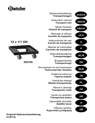 12 x 1/1 GN Gebrauchsanleitung Transportwagen D/A/CH Instruction manual Transport cart GB/UK Mode d’emploi Chariot de transport F/B/CH Manuale di utilizzo Carrello da trasporto I/CH Instrucciones de uso Carrito de transporte E Manual de instruções Carrinho de transporte P Gebruiksaanwijzing Transportwagen Brugsanvisning Transportvogn 300105 Инструкция по эксплуатации Tранспортная тележка DK RUS Kullanma kılavuzu Taşıma arabası TR Instrukcja obsługi Wózek transportowy PL Návod k obsłużę Transportní vozík CZ Upute za upotrebu Transportna kolica HR Használati útmutató Szállító kocsi H Οδηγίες χρήσης Καροτσάκι µεταφοράς Original-Gebrauchsanleitung V1/0116 NL/B GR NL/B Technische gegevens --------------------------------------------------------------------------------------------------------------------Benaming: • Transportwagen 12 x 1/1 GN voor Bartscher thermische transport-container 12 x 1/1 GN, Art.-Nr. 300104 Art.-Nr.: Materiaal: Uitvoering: • 300105 • Kunststof • Wielen Ø 95 mm, 2 vaste wielen, 2 zwenkwielen met remmen Afmetingen: • Binnenafmetingen frame: B 490 x D 665 x H 25 mm; transportwagen: B 550 x D 725 x H 190 mm Draagvermogen: • 200 kg • 6,4 kg Gewicht: --------------------------------------------------------------------------------------------------------------------- Gebruik • Pak de transportwagen uit en verwijder al het verpakkingsmateriaal. • Beveilig de transportwagen met de vastzetters van de stuurwielen voordat je de thermische transport-container op het raam zet, beveilig de thermische transport-container indien nodig tegen kantelen. • Het draagvermogen van 200 kg maakt het transport van meerdere thermische transportcontainers mogelijk. • Ga na of de thermische transport-containers correct zijn geplaatst, maak de vastzetters van de stuurwielen los en zet dan de transportwagen in beweging. Om dit gemakkelijker te maken, kan je de ingewerkte handvaten van de thermische transport-container gebruiken. • Maak de transportwagen met een zachte, vochtige doek en een mild reinigingsmiddel schoon. Gebruik nooit schurende schoonmaakmiddelen die het oppervlak zouden kunnen krassen. Bartscher GmbH Franz-Kleine-Str. 28 D-33154 Salzkotten Duitsland Tel.: +49 (0) 5258 971-0 Fax: +49 (0) 5258 971-120 -7-