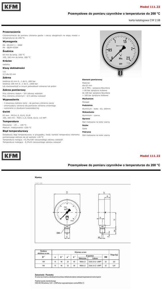 Model 111.22 Przemysłowe do pomiaru czynników o temperaturze do 200 °C karta katalogowa CW 2.08 Przeznaczenia Ciśnieniomierze do pomiaru ciśnienia gazów i cieczy obojętnych na stopy miedzi o temperaturze do 200 °C. Wymagania PN - EN 837-1 : 2000 PN - 88/M-42304 Średnice 63 mm do temp. 150 °C 100, 160 mm do temp. 200 °C Króciec radialny Klasy dokładności 1,6 2,5 dla 63 mm Zakres Element pomiarowy średnica 63 mm 0...1 do 0...600 bar średnica 100 mm 0...1 do 0...1000 bar lub równowartość w innych jednostkach ciśnienia lub próżni Materiał: dla 63 mm do 6 MPa - sprężyna Bourdona > 60 bar sprężyna śrubowa do 100 bar sprężyna Bourdona > 100 bar śprężyna śróbowa Zakres pomiarowy Przy ciśnieniu stałym - 3/4 zakresu wskazań Przy ciśnieniu zmiennym - 2/3 zakresu wskazań Mechanizm Wyposażenie Mosiądz - 3 otworowy kołnierz tylny - do pomiaru ciśnienia cieczy - amortyzatory ciśnienia dla pomiarów ciśnienia zmiennego - wykonanie w obudowie kwasoodpornej Podzielnia Aluminium - biała - 63, 100mm Gwint Wskazówka 63 mm - M12x1,5, G1/4, G1/8 100, 160 mm - M20 x 1,5; G3/8; G1/2; 1/2 NPT Aluminium - czarna Oprawa Temperatura Stal malowana na kolor czarny Otoczenie: - 25 ... +60 °C Medium: maksymalnie +200 °C Szyba Szkło Błąd temperaturowy Pokrywa Dodatkowy błąd temperaturowy w przypadku, kiedy wartość temperatury elementu pomiarowego odchyla się od wartości +20 °C Temperatura rosnąca: +0,3%/10K rzeczywistego zakresu wskazań Temperatura malejąca: -0,3%/K rzeczywistego zakresu wskazań Stal malowana na kolor czarny Model 111.22 Przemysłowe do pomiaru czynników o temperaturze do 200 °C