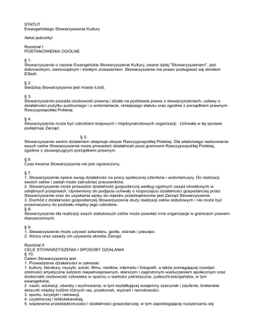 STATUT Ewangelickiego Stowarzyszenia Kultury /tekst jednolity/ Rozdział I POSTANOWIENIA OGÓLNE § 1. Stowarzyszenie o nazwie Ewangelickie Stowarzyszenie Kultury, zwane dalej "Stowarzyszeniem", jest dobrowolnym, samorządnym i trwałym zrzeszeniem. Stowarzyszenie ma prawo posługiwać się skrótem EStoK. § 2. Siedzibą Stowarzyszenia jest miasto Łódź. § 3. Stowarzyszenie posiada osobowość prawną i działa na podstawie prawa o stowarzyszeniach, ustawy o działalności pożytku publicznego i o wolontariacie, niniejszego statutu oraz zgodnie z porządkiem prawnym Rzeczypospolitej Polskiej. § 4. Stowarzyszenie może być członkiem krajowych i międzynarodowych organizacji. Uchwałę w tej sprawie podejmuje Zarząd. § 5. Stowarzyszenie swoim działaniem obejmuje obszar Rzeczypospolitej Polskiej. Dla właściwego realizowania swych celów Stowarzyszenie może prowadzić działalność poza granicami Rzeczypospolitej Polskiej, zgodnie z obowiązującym porządkiem prawnym. § 6. Czas trwania Stowarzyszenia nie jest ograniczony. § 7. 1. Stowarzyszenie opiera swoją działalność na pracy społecznej członków i wolontariuszy. Do realizacji swoich celów i zadań może zatrudniać pracowników. 2. Stowarzyszenie może prowadzić działalność gospodarczą według ogólnych zasad określonych w odrębnych przepisach. Uprawniony do podjęcia uchwały o rozpoczęciu działalności gospodarczej przez Stowarzyszenie oraz do uzyskania wpisu do rejestru przedsiębiorców jest Zarząd Stowarzyszenia. 3. Dochód z działalności gospodarczej Stowarzyszenia służy realizacji celów statutowych i nie może być przeznaczony do podziału między jego członków. § 8. Stowarzyszenie dla realizacji swych statutowych celów może powołać inne organizacje w granicach prawem dopuszczonych. § 9. 1. Stowarzyszenie może używać sztandaru, godła, odznak i pieczęci. 2. Wzory oraz zasady ich używania określa Zarząd. Rozdział II CELE STOWARZYSZENIA I SPOSOBY DZIAŁANIA § 10. Celem Stowarzyszenia jest: 1. Prowadzenie działalności w zakresie: 1. kultury, literatury, muzyki, sztuki, filmu, mediów, internetu i fotografii, a także pomagającej rozwijać zdolności artystyczne ludziom niepełnosprawnym, starszym i zagrożonym wykluczeniem społecznym oraz doskonalić osobowość człowieka w oparciu o wartości patriotyczne, judeochrześcijańskie, w tym ewangelickie, 2. nauki, edukacji, oświaty i wychowania, w tym kształtującej wzajemny szacunek i zaufanie, braterskie stosunki między ludźmi różnych ras, przekonań, wyznań i narodowości, 3. sportu, turystyki i rekreacji, 4. czytelniczej i bibliotekarskiej, 5. wspierania przedsiębiorczości i działalności gospodarczej, w tym zapobiegającej rozszerzaniu się patologii społecznej, także wśród osób niepełnosprawnych lub zagrożonych wykluczeniem społecznym, poprzez tworzenie dla nich nowych miejsc pracy, odpowiadających zapotrzebowaniu społecznemu i ich zdolnościom i umiejętnościom, 6. integracji europejskiej oraz rozwijania kontaktów i współpracy między społeczeństwami, 7. realizacji programów aktywizacji zawodowej osób uzależnionych, biednych, bezrobotnych lub zagrożonych bezrobociem, w tym opuszczających zakłady karne, 8. udzielania pomocy prawnej, psychologicznej i materialnej, 9. wspierania działań na rzecz wolności religijnej, wolności wypowiedzi artystycznej, wolności słowa oraz prawa do uprawiania krytyki społecznej, kulturalnej, artystycznej, politycznej i naukowej we wszystkich możliwych formach na całym świecie. 2. Wszechstronna pomoc osobom związanym z kulturą, historią, mediami lub nauką poprzez: 1. wspieranie i organizowanie dodatkowych form spędzania wolnego czasu, w tym poprzez turystykę krajową i zagraniczną oraz promocja życia bez alkoholu i narkotyków, 2. poradnictwo prawne, socjalne, terapeutyczne dla wszystkich potrzebujących takiej pomocy, 3. podnoszenie kwalifikacji zawodowych, 4. tworzeniu bazy i zaplecza materialnego na rzecz osób niepełnosprawnych, 5. wszelką pomoc materialną, intelektualną, finansową i opiekuńczo-socjalną. 3. Działanie na rzecz kultury judeochrześcijańskiej, w tym katolickiej, ewangelickiej lub prawosławnej oraz tolerancji, wolności słowa i wyznania poprzez: 1. wspieranie działań w tym obszarze w Polsce i na świecie, w tym w krajach, w których ta wolność jest zakazana lub ograniczana, 2. organizowanie koleżeńskiej samopomocy oraz wspieranie podwyższania kwalifikacji osób szanujących przesłanie Ewangelii i dekalogu, 3. przybliżanie obywatelom wiedzy o wkładzie chrześcijaństwa i reformacji w kulturę, rozwój stosunków społecznych i tolerancji oraz wolność słowa i wyznania w Polsce, Europie i na świecie, 4. integrację środowisk związanych z kulturą i historią ewangelicką w kraju i za granicą, 5. poszukiwanie, zbieranie, gromadzenie, opracowywanie, upamiętnianie i upowszechnianie różnego rodzaju świadectw historycznych, muzycznych, fotograficznych, filmowych i literackich, 6. reprezentowanie poglądów, stanowisk lub postaw obywateli oraz zainteresowanych środowisk i instytucji w sprawach dotyczących kultury wszelkich wspólnot ewangelickich, 7. monitorowanie instytucji państwowych, publicznych, społecznych i kościelnych pod kątem ich działania w obszarze kultury ewangelickiej, tolerancji, wolności słowa i wyznania. 4. Ochrona dóbr i świadectw historii kultury judeochrześcijańskiej, w tym przede wszystkim ewangelickiej poprzez: 1. opiekę, ochronę i odnowę miejsc, budynków i przedmiotów, 2. popularyzację konieczności renowacji rzeczowych świadectw historii i kultury judeochrześcijańskiej, w tym przede wszystkim ewangelickiej w Polsce i na świecie oraz pozyskiwanie na nią środków i prowadzenie działań konserwatorskich, remontowych i adaptacyjnych, 3. tworzenie ośrodków kultury zainteresowanych wspólnot ewangelickich, miejsc pamięci, galerii oraz mobilnych punktów informa