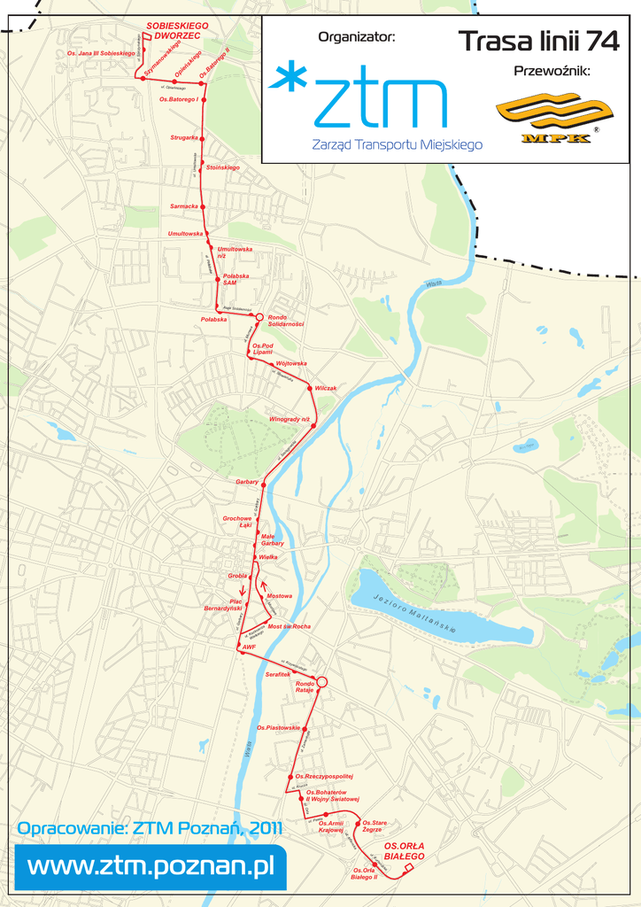 ul. Stróżyńskiego Trasa linii 74 Organizator: Sz ym an ow sk ie go O pi eń sk ie go O s. B at or eg o II Os. Jana III Sobieskiego SOBIESKIEGO DWORZEC Przewoźnik: ul. Opieńskiego Os.Batorego I R ul. Umultowska Strugarka Stoińskiego Sarmacka Umultowska oł ul. P Umultowska n/ż a absk Połabska SAM WARTA Warta Aleje Solidarn ości Rondo Solidarności ul. Mu ra wa Połabska Os.Pod Lipami Wójtowska ul. Sło wia ńsk a A WART Wilczak Główna go lą dank Kajk a ul .S ze a Staw a Bog bin ws Cy ka Winogrady n/ż Grochowe Łąki ul. Garba ry Garbary Małe Garbary Wielka Grobla Je Mostowa ul. Plac Bernardyński a w sto Mo ul. G arba ry ka zi za ier zim o Ka ieg ul. ielk W or r kla Sz o M al Most św.Rocha ta ńs k ie AWF ul. K rzyw Serafitek ous tego Rondo Rataje Pia śn ica Cy men ul. Z a Warta hofa Os.Piastowskie Os.Rzeczypospolitej cza ul. Kru Os.Bohaterów II Wojny Światowej rla ul. O a Os.Stare Żegrze Os.Armii Krajowej Infl a ck an OS.ORŁA BIAŁEGO la ur .K ul nd a Os.Orła Białego II a zk www.ztm.poznan.pl Piaśnic ul. Pawi ul. Opracowanie: ZTM Poznań, 2011 bin a