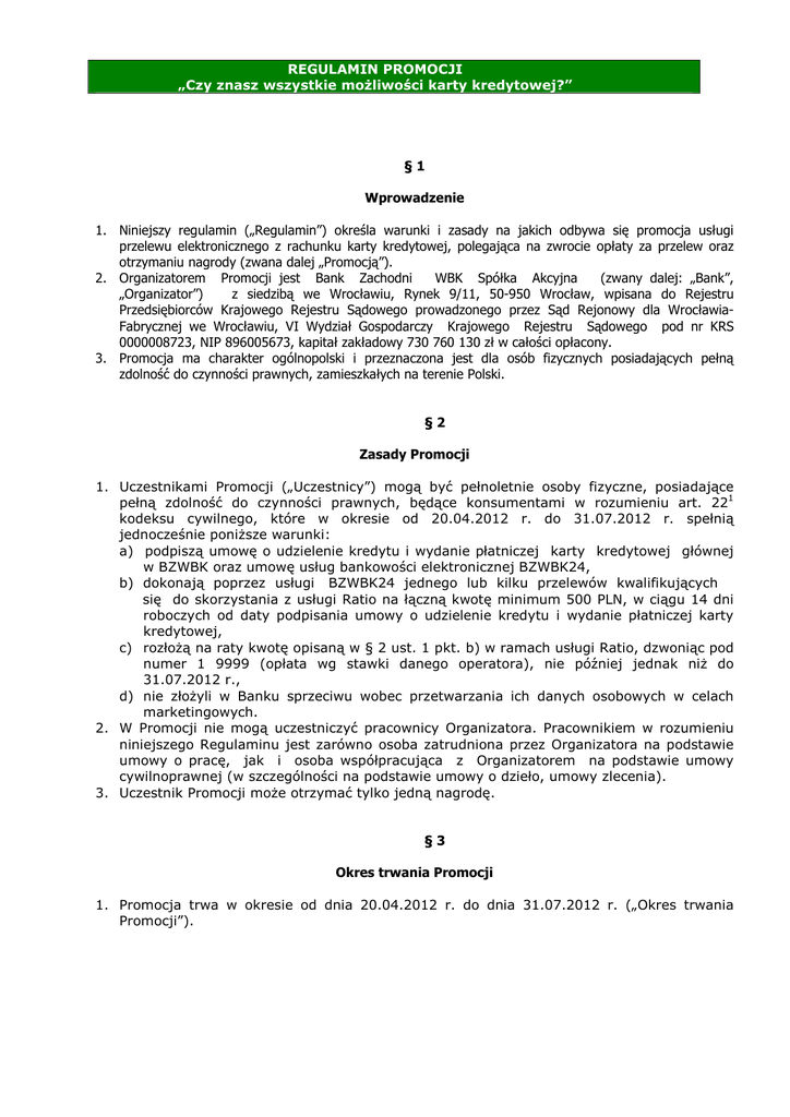 REGULAMIN PROMOCJI „Czy znasz wszystkie moŜliwości karty kredytowej?” §1 Wprowadzenie 1. Niniejszy regulamin („Regulamin”) określa warunki i zasady na jakich odbywa się promocja usługi przelewu elektronicznego z rachunku karty kredytowej, polegająca na zwrocie opłaty za przelew oraz otrzymaniu nagrody (zwana dalej „Promocją”). 2. Organizatorem Promocji jest Bank Zachodni WBK Spółka Akcyjna (zwany dalej: „Bank”, „Organizator”) z siedzibą we Wrocławiu, Rynek 9/11, 50-950 Wrocław, wpisana do Rejestru Przedsiębiorców Krajowego Rejestru Sądowego prowadzonego przez Sąd Rejonowy dla WrocławiaFabrycznej we Wrocławiu, VI Wydział Gospodarczy Krajowego Rejestru Sądowego pod nr KRS 0000008723, NIP 896005673, kapitał zakładowy 730 760 130 zł w całości opłacony. 3. Promocja ma charakter ogólnopolski i przeznaczona jest dla osób fizycznych posiadających pełną zdolność do czynności prawnych, zamieszkałych na terenie Polski. §2 Zasady Promocji 1. Uczestnikami Promocji („Uczestnicy”) mogą być pełnoletnie osoby fizyczne, posiadające pełną zdolność do czynności prawnych, będące konsumentami w rozumieniu art. 221 kodeksu cywilnego, które w okresie od 20.04.2012 r. do 31.07.2012 r. spełnią jednocześnie poniŜsze warunki: a) podpiszą umowę o udzielenie kredytu i wydanie płatniczej karty kredytowej głównej w BZWBK oraz umowę usług bankowości elektronicznej BZWBK24, b) dokonają poprzez usługi BZWBK24 jednego lub kilku przelewów kwalifikujących się do skorzystania z usługi Ratio na łączną kwotę minimum 500 PLN, w ciągu 14 dni roboczych od daty podpisania umowy o udzielenie kredytu i wydanie płatniczej karty kredytowej, c) rozłoŜą na raty kwotę opisaną w § 2 ust. 1 pkt. b) w ramach usługi Ratio, dzwoniąc pod numer 1 9999 (opłata wg stawki danego operatora), nie później jednak niŜ do 31.07.2012 r., d) nie złoŜyli w Banku sprzeciwu wobec przetwarzania ich danych osobowych w celach marketingowych. 2. W Promocji nie mogą uczestniczyć pracownicy Organizatora. Pracownikiem w rozumieniu niniejszego Regulaminu jest zarówno osoba zatrudniona przez Organizatora na podstawie umowy o pracę, jak i osoba współpracująca z Organizatorem na podstawie umowy cywilnoprawnej (w szczególności na podstawie umowy o dzieło, umowy zlecenia). 3. Uczestnik Promocji moŜe otrzymać tylko jedną nagrodę. §3 Okres trwania Promocji 1. Promocja trwa w okresie od dnia 20.04.2012 r. do dnia 31.07.2012 r. („Okres trwania Promocji”). §4 Nagrody 1. Wszyscy Uczestnicy, którzy spełnią warunki Promocji określone w § 2 ust. 1 oraz dokonają w okresie do 30.09.2012 r. spłaty pierwszej raty usługi Ratio otrzymają: a) zwrot opłaty za jeden lub kilka przelewów, o których mowa w § 2 ust.1 pkt b) niniejszego Regulaminu. Kwota zwrotu zostanie ustalona na podstawie wysokości opłaty za przelew obowiązującej w Taryfie Opłat i Prowizji w dniu księgowania przelewu w systemie rozliczeniowym Banku, b) skórzane etui na kartę kredytową, którego zdjęcie jest umieszczone na stronie www.bzwbk.pl/Ratio-etui 2. Sposób przekazania nagród Uczestnikom Promocji jest następujący: a) nagroda określona w § 4 ust. 1 pkt a) zostanie zaksięgowana na rachunku karty kredytowej na pierwszym zestawieniu transakcji następującym po spłacie pierwszej kwoty raty w ramach usługi Ratio, b) nagroda określona w § 4 ust. 1 pkt b) zostanie wysłana na adres korespondencyjny wskazany we wniosku o kredytową, nie później niŜ do 15-go dnia miesiąca następującego po dacie zaksięgowania w systemie rozliczeniowym banku, spłaty pierwszej raty usługi Ratio. 3. Uczestnik Promocji nie moŜe domagać się zmiany nagrody na inną. 4. Wartość nagrody w sprzedaŜy premiowej jest zwolniona z podatku dochodowego od osób fizycznych na podstawie art. 21 ust.1 pkt 68 ustawy z dnia 26 lipca 1991 r. o podatku dochodowym od osób fizycznych (Dz.U. z 2010 r. Nr 51, poz. 307 z późn. zm.). §5 Reklamacje 1. 2. 3. Reklamacje moŜna składać w placówkach Banku, za pośrednictwem Centrum Bankowości Telefonicznej i Elektronicznej pod numerem telefonu 1 9999 (opłata wg stawki danego operatora) lub kierować listownie na adres: Centrum Bankowości Telefonicznej i Elektronicznej, ul. Chlebowa 4/8, 61-003 Poznań, z dopiskiem „Czy znasz wszystkie moŜliwości karty kredytowej?”. Reklamacje powinny zawierać imię, nazwisko i dokładny adres do korespondencji Uczestnika, jak równieŜ opis i wskazanie przyczyny reklamacji. Organizator rozpatrzy reklamację oraz powiadomi o jej rozstrzygnięciu w formie pisemnej, wysyłając odpowiedź na adres podany przez Uczestnika w ciągu 14 dni od daty jej otrzymania. §6 Postanowienia końcowe 1. 2. 3. 4. 5. 6. 7. Regulamin Promocji będzie dostępny w siedzibie Organizatora oraz pod adresem: www.bzwbk.pl/Ratio-etui w okresie trwania Promocji. Organizator jest odpowiedzialny za przeprowadzenie Promocji i jej prawidłowy przebieg. W sprawach nieprzewidzianych w niniejszym Regulaminie zastosowanie mają powszechnie obowiązujące przepisy prawa. Bank Zachodni WBK S.A. z siedzibą we Wrocławiu (50-950), Rynek 9/11, jako Organizator i administrator danych osobowych Uczestników Promocji zbiera dane Uczestników na zasadzie dobrowolności i będzie je przetwarzał w celu przeprowadzenia Promocji i doręczenia nagród. Uczestnikom przysługuje prawo dostępu do danych oraz prawo ich poprawiania. Właściwym dla Banku organem nadzoru jest Komisja Nadzoru Finansowego. Uczestnik Promocji moŜe zwrócić się o bezpłatną pomoc prawną do Miejskich lub Powiatowych Rzeczników Konsumenta. Spory pomiędzy Uczestnikiem a Organizatorem mogą być rozstrzygane polubownie przed Arbitrem Bankowym przy Związku Banków Polskich, o ile wartość przedmiotu sporu nie jest wyŜsza niŜ 8000 zł.