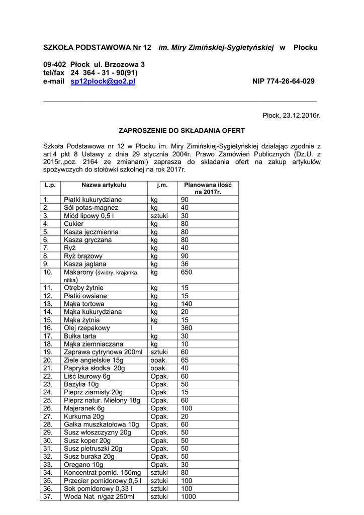 SZKOŁA PODSTAWOWA Nr 12 im. Miry Zimińskiej-Sygietyńskiej w 09-402 Płock ul. Brzozowa 3 tel/fax 24 364 - 31 - 90(91) e-mail [email protected] Płocku NIP 774-26-64-029 ___________________________________________________________________ Płock, 23.12.2016r. ZAPROSZENIE DO SKŁADANIA OFERT Szkoła Podstawowa nr 12 w Płocku im. Miry Zimińskiej-Sygietyńskiej działając zgodnie z art.4 pkt 8 Ustawy z dnia 29 stycznia 2004r. Prawo Zamówień Publicznych (Dz.U. z 2015r.,poz. 2164 ze zmianami) zaprasza do składania ofert na zakup artykułów spożywczych do stołówki szkolnej na rok 2017r. L.p. 1. 2. 3. 4. 5. 6. 7. 8. 9. 10. 11. 12. 13. 14. 15. 16. 17. 18. 19. 20. 21. 22. 23. 24. 25. 26. 27. 28. 29. 30. 31. 32. 33. 34. 35. 36. 37. Nazwa artykułu Płatki kukurydziane Sól potas-magnez Miód lipowy 0,5 l Cukier Kasza jęczmienna Kasza gryczana Ryż Ryż brązowy Kasza jaglana Makarony (świdry, krajanka, nitka) Otręby żytnie Płatki owsiane Mąka tortowa Mąka kukurydziana Mąka żytnia Olej rzepakowy Bułka tarta Mąka ziemniaczana Zaprawa cytrynowa 200ml Ziele angielskie 15g Papryka słodka 20g Liść laurowy 6g Bazylia 10g Pieprz ziarnisty 20g Pieprz natur. Mielony 18g Majeranek 6g Kurkuma 20g Gałka muszkatołowa 10g Susz włoszczyzny 20g Susz koper 20g Susz pietruszki 20g Susz buraka 20g Oregano 10g Koncentrat pomid. 150mg Przecier pomidorowy 0,5 l Sok pomidorowy 0,33 l Woda Nat. n/gaz 250ml j.m. Planowana ilość na 2017r. kg kg sztuki kg kg kg kg kg kg kg 90 40 30 80 80 80 40 90 36 650 kg kg kg kg kg l kg kg sztuki opak. opak. Opak. Opak. Opak. Opak. Opak. Opak. Opak. Opak. Opak. Opak. Opak. Opak. sztuki sztuki sztuki sztuki 15 15 140 20 15 360 30 10 60 65 40 60 50 15 60 100 20 60 50 50 50 50 30 80 100 100 1000 Zamówienia ilościowe na dany dzień będą odbywały się telefonicznie w dniu poprzedzającym dostawę. Dostawy art. spożywczych odbywać się będą 5 razy w tygodniu, w godzinach od 6.00-8.00. Dostawy winny się odbywać w odpowiednio przystosowanych opakowaniach stanowiących własność Wykonawcy i spełniających wymagania przewidziane do przechowywania żywności. Opakowania zwrotne zamawiający odda Wykonawcy przy następnej dostawie. Artykuły spożywcze powinny pochodzić wyłącznie z produkcji krajowej lub Państw Unii Europejskiej. Dostarczone artykuły powinny być świeże, nie mrożone, z odpowiednim ważnym terminem przydatności do spożycia. W/w produkty nie mogą odznaczać się: obcymi posmakami, zapachami, obślizgłością, nalotem pleśni, zazielenieniem, nie może być uszkodzone mechanicznie, zabrudzone, nie dopuszcza się produktów z uszkodzonym opakowaniem. • Musi być odpowiednio posortowane przez Wykonawcę i musi być najwyższej jakości, spełniać wymogi sanitarno-epidemiologiczne oraz zasady systemu HACCP w tym przede wszystkim musi odpowiadać wymaganiom jakościowym stosownie do obowiązujących przepisów. • Dostarczane produkty powinny spełniać właściwe standardy jakościowe przyjęte na rynku art. spożywczych, a Dostawca powinien zagwarantować, iż dostarczane produkty spełniają normy związane z warunkami sanitarnymi ich pozyskiwania, produkcji, przetwarzania, składowania, transportu oraz sprzedaży bezpośredniej. Wykonawcy ubiegający się o udzielenie zamówienia muszą posiadać uprawnienia do wykonywania określonej działalności lub czynności. Rozliczenia za dostawę zamówionego towaru będą odbywały się na podstawie faktur wystawionych przez Dostawcę raz w tygodniu. Faktury będą posiadały 14- dniowy termin płatności i będą wystawione na stępujące dane: NABYWCA: Gmina-Miasto Płock Pl. Stary Rynek 1, 09-400 Płock NIP 774-31-35-712 ODBIORCA/PŁATNIK/ADRESAT: Szkoła Podstawowa nr 12 im. Miry Zimińskiej-Sygietyńskiej ul. Brzozowa 3 09-402 Płock Dokumenty wymagane od Wykonawców Aktualny odpis z właściwego rejestru lub z centralnej ewidencji i informacji o działalności gospodarczej. Oświadczenie Wykonawcy o : wpisie do rejestru zakładów podlegających kontroli Państwowej Inspekcji Sanitarnej, wprowadzeniu systemu HACCP, posiadaniu zgody właściwego organu Inspekcji Sanitarnej na przewóz (transport) artykułów spożywczych- zał. Nr 2. Pełnomocnictwo, jeżeli oferta będzie podpisana przez pełnomocnika. Wypełniony formularz ofert (zał. Nr 1) Oferty należy składać w sekretariacie szkoły na formularzu stanowiącym załącznik nr 1 do niniejszego zaproszenia do składania ofert w zamkniętej kopercie z dopiskiem „ oferta na dostawę artykułów spożywczych „ lub drogą elektroniczną na adres [email protected] w formacie „pdf” do dnia 02 stycznia 2017r. do godz.15.00. Formularz powinien zostać podpisany przez osobę upoważnioną. Zamawiający informuje, że ilości oraz rodzaj wymienionych produktów ma charakter wstępny i w ciągu roku może ulec zmianie według bieżących potrzeb. Cena oferty musi uwzględniać dostawę artykułów spożywczych do siedziby Zamawiającego. W związku z zamówieniami pilnymi zaleca się aby siedziba, oddział lub przedstawicielstwo firmy znajdowało się do 25 km od granic Płocka w celu skrócenia czasu dostawy. Przy dokonywaniu wyboru najkorzystniejszej oferty Zamawiający stosować będzie kryterium najniższej ceny. Dyrektor Szkoły Agata Bogiel