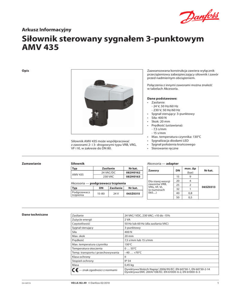 Arkusz Informacyjny Siłownik sterowany sygnałem 3-punktowym AMV 435 Opis Zaawansowana konstrukcja zawiera wyłącznik przeciążeniowy zabezpieczający siłownik i zawór przed nadmiernym obciążeniem. Połączenia z innymi zaworami można znaleźć w tabelach Akcesoria. Zamawianie Siłownik AMV 435 może współpracować z zaworami 2- i 3- drogowymi typu VRB, VRG, VF i VL w zakresie do DN 80. Dane podstawowe: • Zasilanie: - 24 V, 50 Hz/60 Hz - 230 V, 50 Hz/60 Hz • Sygnał sterujący: 3-punktowy • Siła: 400 N • Skok: 20 mm • Prędkość (ustawiana): - 7,5 s/mm - 15 s/mm • Max. temperatura czynnika: 130°C • Sygnalizacja diodami LED • Sygnał położenia krańcowego • Sterowanie ręczne Siłownik Akcesoria — adapter Typ AMV 435 Zasilanie 24 VAC/DC 230 VAC Nr kat. 082H0162 082H0163 Akcesoria — podgrzewacz trzpienia Typ Podgrzewacz trzpienia Dane techniczne DN Zasilanie Nr kat. 15-80 24 V 065Z0315 Zasilanie Zużycie energii Częstotliwość Sygnał sterujący Siła Max. skok Prędkość Max. temperatura czynnika Temperatura otoczenia Temp. transportu i przechowywania Klasa ochrony Stopień ochrony Masa — znak zgodności z normami DH-SMT/SI VD.LE.N2.49 © Danfoss 02/2010 Zawory DN Dla starej wesrsji zaworów VRB, VRG, VF, VL (o numerach 065....) 15 20 25 32 40 50 max. Δp (bar) 9 4 2 1 0,8 0,5 Nr kat. 065Z0313 24 VAC/ VDC, 230 VAC; +10 do -15% 2 VA 50 Hz lub 60 Hz (dla zasilania VAC) 3-punktowy 400 N 20 mm 7,5 s/mm lub 15 s/mm 130oC 0 … 55°C –40 … +70°C II IP 54 0,45 kg Dyrektywa Niskich Napięć 2006/95/EC: EN 60730-1, EN 60730-2-14 Dyrektywa EMC 2004/108/EC: EN 61000-6-2, EN 61000-6-3 1 Arkusz Informacyjny Siłownik sterowany sygnałem 3-punktowym AMV 435 Montaż Mechaniczny Do zamontowania siłownika na zaworze nie są potrzebne żadne narzędzia. Zawór z siłownikiem powinien być skierowany do góry lub zamontowany w pozycji poziomej. Zamontowany zawór nie może być skierowany w dół. Siłownika nie wolno montować w pomieszczeniach, w których mogą występować gazy wybuchowe ani w pomieszczeniach, w których temperatura jest niższa niż 0°C lub wyższa niż 55°C. Siłownik nie może być narażony na działanie strumieni pary, wody oraz kapiących płynów. ① ③ ② ⑤ ④ Uwaga: Po poluzowaniu pierścienia mocującego siłownik na zaworze można go swobodnie obrócić do 360° względem zaworu. Po ustawieniu siłownika należy dokręcić pierścień mocujący. Elektryczny Dostęp do podłączeń elektrycznych można uzyskać po zdjęciu pokrywy siłownika. Do podłączenia dławików kablowych przygotowane są dwa niegwintowane otwory (Ø16 i łączony Ø16/ Ø20). Jeden z otworów jest fabrycznie wyposażony w gumowy dławik kablowy, a drugi jest przygotowany do otwarcia. Uruchomienie Po zakończeniu montażu mechanicznego oraz elektrycznego sprawdź poprawność podłączeń i wykonaj następujące czynności: • Załącz zasilanie. • Wprowadź odpowiednią wartość sygnału i sprawdź, czy kierunek ruchu trzpienia zaworu jest zgodny z założonym. Urządzenie jest teraz sprawdzone i gotowe do pracy. Sygnalizacja diodami LED/tryby pracy siłownika Wskaźnik diodowy funkcji Dwukolorowy (zielony/czerwony) wskaźnik diodowy funkcji znajduje się na obudowie siłownika. Sygnalizuje on tryby pracy. zielony czerwony Dioda kontrolna LED czerwona błyska: siłownik w trakcie wysuwania trzpienia 2 VD.LE.N2.49 © Danfoss 02/2010 zielony Dioda kontrolna LED zielona ciągła: trzpień w pozycji wsuniętej ≈ Dioda kontrolna LED zielona błyska: siłownik w trakcie wsuwania trzpienia ≈ Uwaga: Kable i dławiki kablowe nie mogą obniżać stopnia ochrony IP siłownika i muszą zapewniać pełne odciążenie połączenia. Dostarczany gumowy dławik kablowy nie obniża stopnia ochrony IP, ale nie zapewnia pełnego odciążenia zgodnie z dyrektywą niskich napięć. Należy przestrzegać lokalnych przepisów i wytycznych. czerwony Dioda kontrolna LED czerwona ciągła: trzpień w pozycji wysuniętej DH-SMT/SI Arkusz Informacyjny Siłownik sterowany sygnałem 3-punktowym AMV 435 Sterowanie ręczne Sterowanie ręczne odbywa się przy użyciu pokrętła sterującego na obudowie siłownika: • Odłącz sygnał sterujący • Wyreguluj położenie zaworu przy użyciu pokrętła regulacyjnego (zwróć uwagę na kierunek obrotu) Gdy regulacja ręczna nie jest już wymagana: • Załącz sygnał sterujący Podłączenia elektryczne Zaciski 1, 3: Sygnał sterujący z regulatora. Zasilanie 24 VAC/DC, 230 VAC (w zależności od typu) Nie wolno niczego dotykać na płytce obwodu drukowanego, gdy urządzenie jest pod napięciem! Nie zdejmować pokrywy przed całkowitym odłączeniem napięcia zasilania. Maksymalna moc dopuszczalna na zaciskach 4 i 5 wynosi 7 VA. Zaciski 4, 5: Wyjścia sygnału służące do sygnalizacji pozycji siłownika lub do monitoringu N Neutralny/Wspólny (0 V) na dół do góry Długość przewodu Zalecany przekrój przewodu 0-50 m 0,75 mm2 > 50 m 1,5 mm2 zasilanie na dół do góry Złomowanie Przed złomowaniem siłownik należy rozłożyć na części i posortować na różne grupy materiałowe. DH-SMT/SI VD.LE.N2.49 © Danfoss 02/2010 3 Arkusz Informacyjny Siłownik sterowany sygnałem 3-punktowym AMV 435 Kombinacje zawór — siłownik AMV 435 + VRB 2, VRG 2 AMV 435 + VRB 3, VRG 3 AMV 435 + VF 2, VL 2 AMV 435 + VF 3, VL 3 Wymiary 4 VD.LE.N2.49 Produced by Danfoss A/S © 02/2010