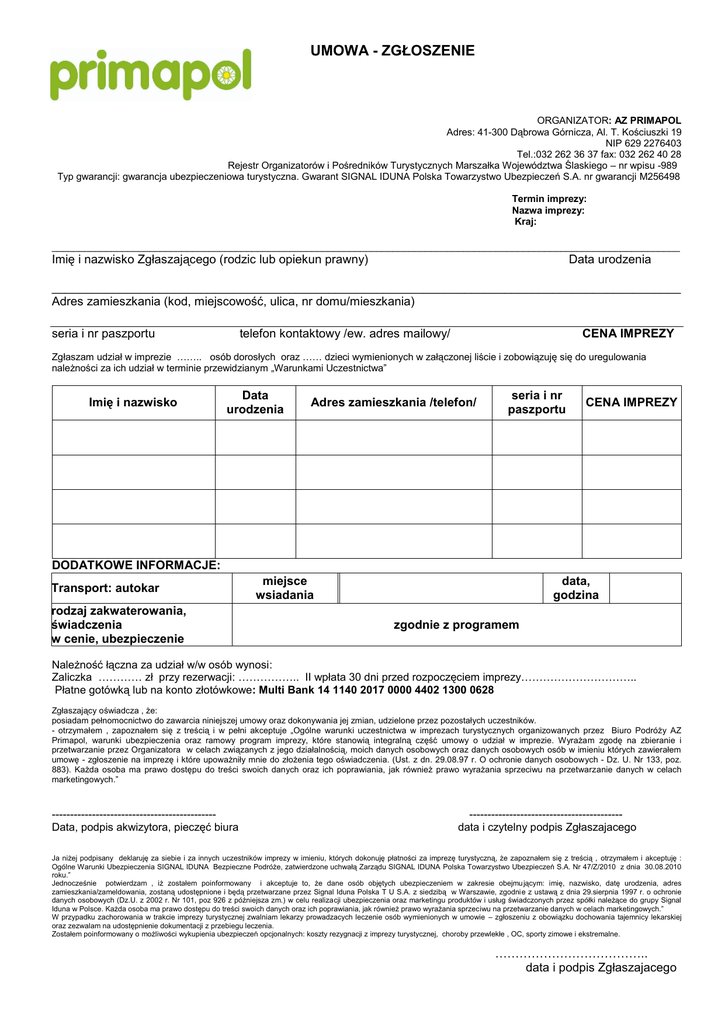 UMOWA - ZGŁOSZENIE ORGANIZATOR: AZ PRIMAPOL Adres: 41-300 Dąbrowa Górnicza, Al. T. Kościuszki 19 NIP 629 2276403 Tel.:032 262 36 37 fax: 032 262 40 28 Rejestr Organizatorów i Pośredników Turystycznych Marszałka Województwa Ślaskiego – nr wpisu -989 Typ gwarancji: gwarancja ubezpieczeniowa turystyczna. Gwarant SIGNAL IDUNA Polska Towarzystwo Ubezpieczeń S.A. nr gwarancji M256498 Termin imprezy: Nazwa imprezy: Kraj: ____________________________________________________________________________________________________________________ Imię i nazwisko Zgłaszającego (rodzic lub opiekun prawny) Data urodzenia _____________________________________________________________________________________________ Adres zamieszkania (kod, miejscowość, ulica, nr domu/mieszkania) seria i nr paszportu telefon kontaktowy /ew. adres mailowy/ CENA IMPREZY Zgłaszam udział w imprezie …….. osób dorosłych oraz …… dzieci wymienionych w załączonej liście i zobowiązuję się do uregulowania należności za ich udział w terminie przewidzianym „Warunkami Uczestnictwa” Imię i nazwisko Data urodzenia Adres zamieszkania /telefon/ seria i nr paszportu CENA IMPREZY DODATKOWE INFORMACJE: Transport: autokar rodzaj zakwaterowania, świadczenia w cenie, ubezpieczenie miejsce wsiadania data, godzina zgodnie z programem Należność łączna za udział w/w osób wynosi: Zaliczka ………… zł przy rezerwacji: …………….. II wpłata 30 dni przed rozpoczęciem imprezy………………………….. Płatne gotówką lub na konto złotówkowe: Multi Bank 14 1140 2017 0000 4402 1300 0628 Zgłaszający oświadcza , że: posiadam pełnomocnictwo do zawarcia niniejszej umowy oraz dokonywania jej zmian, udzielone przez pozostałych uczestników. - otrzymałem , zapoznałem się z treścią i w pełni akceptuje „Ogólne warunki uczestnictwa w imprezach turystycznych organizowanych przez Biuro Podróży AZ Primapol, warunki ubezpieczenia oraz ramowy program imprezy, które stanowią integralną część umowy o udział w imprezie. Wyrażam zgodę na zbieranie i przetwarzanie przez Organizatora w celach związanych z jego działalnością, moich danych osobowych oraz danych osobowych osób w imieniu których zawierałem umowę - zgłoszenie na imprezę i które upoważniły mnie do złożenia tego oświadczenia. (Ust. z dn. 29.08.97 r. O ochronie danych osobowych - Dz. U. Nr 133, poz. 883). Każda osoba ma prawo dostępu do treści swoich danych oraz ich poprawiania, jak również prawo wyrażania sprzeciwu na przetwarzanie danych w celach marketingowych.” --------------------------------------------Data, podpis akwizytora, pieczęć biura -----------------------------------------data i czytelny podpis Zgłaszajacego Ja niżej podpisany deklaruję za siebie i za innych uczestników imprezy w imieniu, których dokonuję płatności za imprezę turystyczną, że zapoznałem się z treścią , otrzymałem i akceptuję : Ogólne Warunki Ubezpieczenia SIGNAL IDUNA Bezpieczne Podróże, zatwierdzone uchwałą Zarządu SIGNAL IDUNA Polska Towarzystwo Ubezpieczeń S.A. Nr 47/Z/2010 z dnia 30.08.2010 roku.” Jednocześnie potwierdzam , iż zostałem poinformowany i akceptuje to, że dane osób objętych ubezpieczeniem w zakresie obejmu jącym: imię, nazwisko, datę urodzenia, adres zamieszkania/zameldowania, zostaną udostępnione i będą przetwarzane przez Signal Iduna Polska T U S.A. z siedzibą w Warszawie, zgodni e z ustawą z dnia 29.sierpnia 1997 r. o ochronie danych osobowych (Dz.U. z 2002 r. Nr 101, poz 926 z późniejsza zm.) w celu realizacji ubezpieczenia oraz marketingu produktów i usług świadczonych przez spółki należące do grupy Signal Iduna w Polsce. Każda osoba ma prawo dostępu do treści swoich danych oraz ich poprawiania, jak również prawo wyrażania sprzeciwu na przetwarzanie danych w celach marketingowych.” W przypadku zachorowania w trakcie imprezy turystycznej zwalniam lekarzy prowadzacych leczenie osób wymienionych w umowie – zgłoszeniu z obowiązku dochowania tajemnicy lekarskiej oraz zezwalam na udostępnienie dokumentacji z przebiegu leczenia. Zostałem poinformowany o możliwości wykupienia ubezpieczeń opcjonalnych: koszty rezygnacji z imprezy turystycznej, choroby przewlekłe , OC, sporty zimowe i ekstremalne. ……………………………….. data i podpis Zgłaszajacego