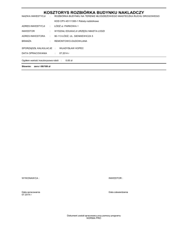 KOSZTORYS ROZBIÓRKA BUDYNKU NAKLADCZY NAZWA INWESTYCJI : ROZBIÓRKA BUDYNKU NA TERENIE MŁODZIEŻOWEGO MIASTECZKA RUCHU DROGOWEGO KOD CPV-45111300-1 Roboty rozbiórkowe ADRES INWESTYCJI : ŁÓDŹ ul. PARKOWA 1 INWESTOR : WYDZIAŁ EDUKACJI URZĘDU MIASTA ŁODZI ADRES INWESTORA : 90-113 ŁÓDŹ, UL. SIENKIEWICZA 5 BRANŻA : REMONTOWO-DUDOWLANA SPORZĄDZIŁ KALKULACJE : WŁADYSŁAW KOPEC DATA OPRACOWANIA : 07.2014 r Ogółem wartość kosztorysowa robót Słownie: : 0.00 zł zero i 00/100 zł WYKONAWCA : INWESTOR : Data opracowania 07.2014 r Data zatwierdzenia Dokument został opracowany przy pomocy programu NORMA PRO OGÓLNA CHARAKTERYSTYKA OBIEKTU -2- Norma PRO Wersja 4.01, Marzec 2003 r. Licencja: 37337 dla ok ROZBIORKA NAKLADCZY KSIĄŻKA PRZEDMIARÓW Lp. Podst Opis i wyliczenia 1 KNR-W 4-01 Demontaż krat okiennych i drzwiowych 1306-01 24.00 j.m. szt. szt. 2 KNR-W 4-01 Demontaż ościeżnic drzwiowych 0353-05 23.80 m2 3 KNR-W 4-01 Wykucie ościeżnic okiennych drewnianych o powierzchni do 2 m2 0353-04 16.00 szt. 4 KNR-W 4-01 Wykucie z muru ościeżnic okiennych drewnianych o powierzchni do 1 m2 0353-03 4.00 szt. 5 KNR-W 4-01 Demontaż daszków i podparć stalowych 1306-01 4.00 szt. 6 KNR-W 4-01 Rozebranie rynny z blachy nie nadającej się do użytku 0545-04 15.60*2 m 7 KNR-W 4-01 Rozebranie rury spustowej z blachy nie nadającej się do użytku 0545-06 2.60*4 m 8 KNR 4-04 0509-02 Rozebranie pokrycia dachowego z papy na deskowaniu na zakład m2 159.20 m2 Rozebranie konstrukcji więźb dachowych - deskowanie dachu na styk m2 159.20 m2 Rozebranie konstrukcji więźb dachowych prostych m2 159.20 m2 Rozebranie stropów drewnianych m2 149.76 m2 Demontaż pokrycia ścian zewnętrznych z płyt azbestowych (przez firmę posiadającą uprawnienia do demontażu azbestu wraz z opłatą za utylizację) 107.15 m2 Rozebranie ścian zewnetrzych i wewnętrznych budynku - tylko "R" m2 234.74 m2 Rozebranie drewnianych podłóg m2 149.76 m2 Rozebranie fundamentów z cegły na zaprawie cementowej Krotność = 0.3 191.00 m3 Załadowanie gruzu i materiałów z rozbiórki koparko-ładowarką przy obsłudze na zmianę roboczą przez 3 samochody samowyładowcze 256.30 m3 Wywiezienie gruzu i materiałow z terenu rozbiórki przy mechanicznym załadowaniu i wyładowaniu samochodem samowyładowczym na odległość 1 km 256.30 m3 9 KNR 4-04 0403-02 10 KNR 4-04 0403-04 11 KNR 4-04 0406-02 12 Wycena indywidualna 13 KNR 4-04 0404-07 14 KNR 4-04 0405-01 15 KNR 4-04 0101-02 16 KNR 4-04 1103-01 17 KNR 4-04 1103-04 18 KNR 4-04 1103-05 m2 szt. szt. szt. m m m2 m3 m3 m3 Wywiezienie gruzu z terenu rozbiórki przy mechanicznym załadowaniu i wyładowa- m3 niu samochodem samowyładowczym - dodatek za każdy następny rozpoczęty 1 km Krotność = 11 256.30 m3 -3- Norma PRO Wersja 4.01, Marzec 2003 r. Licencja: 37337 dla ok Poszcz Razem 24.00 RAZEM 24.00 23.80 RAZEM 23.80 16.00 RAZEM 16.00 4.00 RAZEM 4.00 4.00 RAZEM 4.00 31.20 RAZEM 31.20 10.40 RAZEM 10.40 159.20 RAZEM 159.20 159.20 RAZEM 159.20 159.20 RAZEM 159.20 149.76 RAZEM 149.76 107.15 RAZEM 107.15 234.74 RAZEM 234.74 149.76 RAZEM 149.76 191.00 RAZEM 191.00 256.30 RAZEM 256.30 256.30 RAZEM 256.30 256.30 RAZEM 256.30 ROZBIORKA NAKLADCZY Lp. Podst 19 Wycena indywidualna 20 Wycena indywidualna 21 Wycena indywidualna KSIĄŻKA PRZEDMIARÓW Opis i wyliczenia Opłata za wysypisko materiałów z rozbiórki - nie dotyczy azbestu j.m. m3 256.30 m3 Demontaż instalacji elektrycznej - demontaż "demolacyjny" kpl 1.00 kpl Demontaż instalacji wodno-kanalizacyjnej - demontaż "demolacyjny" kpl 1.00 kpl -4- Norma PRO Wersja 4.01, Marzec 2003 r. Licencja: 37337 dla ok Poszcz Razem 256.30 RAZEM 256.30 1.00 RAZEM 1.00 1.00 RAZEM 1.00 ROZBIORKA NAKLADCZY L Podstawa p. 1 KNR-W 4-01 1306-01 1* 2* 2 KNR-W 4-01 0353-05 1* 3 KNR-W 4-01 0353-04 1* 4 KNR-W 4-01 0353-03 1* 5 KNR-W 4-01 1306-01 1* 2* 6 KNR-W 4-01 0545-04 1* 7 KNR-W 4-01 0545-06 1* Opis jm Demontaż krat okiennych i drzwiowych obmiar = 24.00szt. Nakłady R M S szt. -- R -robocizna 0.03r-g/szt. -- M -materiały pomocnicze 2% Razem koszty bezpośrednie: Razem z narzutami: Ceny jednostkowe Demontaż ościeżnic drzwiowych obmiar = 23.80m2 -- R -robocizna 0.52r-g/m2 r-g 0.72 0.00 % 2.00 0.00 12.38 Razem koszty bezpośrednie: Razem z narzutami: Ceny jednostkowe Wykucie ościeżnic okiennych drewnianych o po- szt. wierzchni do 2 m2 obmiar = 16.00szt. -- R -robocizna 1.16r-g/szt. r-g 18.56 Razem koszty bezpośrednie: Razem z narzutami: Ceny jednostkowe Wykucie z muru ościeżnic okiennych drewniaszt. nych o powierzchni do 1 m2 obmiar = 4.00szt. -- R -robocizna 0.85r-g/szt. r-g 3.40 Razem koszty bezpośrednie: Razem z narzutami: Ceny jednostkowe Demontaż daszków i podparć stalowych szt. obmiar = 4.00szt. -- R -robocizna 0.03r-g/szt. -- M -materiały pomocnicze 2% Razem koszty bezpośrednie: Razem z narzutami: Ceny jednostkowe Rozebranie rynny z blachy nie nadającej się do użytku obmiar = 15.60*2 = 31.20m -- R -robocizna 0.15r-g/m -- R -robocizna 0.11r-g/m -5- 0.00 0.00 0.00 0.00 0.00 0.00 0.00 0.00 0.00 0.00 0.00 0.00 0.00 0.00 0.12 0.00 % 2.00 0.00 0.00 0.00 0.00 0.00 0.00 0.00 0.00 0.00 0.00 0.00 0.00 0.00 0.00 0.00 0.00 0.00 0.00 0.00 0.00 0.00 0.00 0.00 0.00 0.00 0.00 m 4.68 m r-g Razem koszty bezpośrednie: Razem z narzutami: Ceny jednostkowe 0.00 0.00 r-g r-g Razem koszty bezpośrednie: Razem z narzutami: Ceny jednostkowe Rozebranie rury spustowej z blachy nie nadającej się do użytku obmiar = 2.60*4 = 10.40m 0.00 m2 r-g Norma PRO Wersja 4.01, Marzec 2003 r. Licencja: 37337 dla ok Koszt jedn. 1.14 ROZBIORKA NAKLADCZY L Podstawa p. 8 KNR 4-04 0509-02 1* 9 KNR 4-04 0403-02 1* 10 KNR 4-04 0403-04 1* 11 KNR 4-04 0406-02 1* Opis jm Nakłady 13 KNR 4-04 0404-07 1* 2* 14 KNR 4-04 0405-01 1* -- R -robocizna 0.2r-g/m2 r-g 31.84 Razem koszty bezpośrednie: Razem z narzutami: Ceny jednostkowe Rozebranie konstrukcji więźb dachowych - desko- m2 wanie dachu na styk obmiar = 159.20m2 -- R -robocizna 0.17r-g/m2 r-g Razem koszty bezpośredn