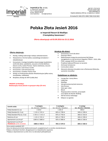 Polska Złota Jesień 2016 w Imperiall Resort & MediSpa 2 kompleksy basenowe ! Oferta obowiązuje od 03.09.2016 do 23.12.2016 Atrakcje dla dzieci: Oferta obejmuje: Nocleg według wybranego rodzaju zakwaterowania Wyżywienie w formie bufetu szwedzkiego (śniadanie + obiadokolacja) Korzystanie z krytego kompleksu basenowego (wydzielona strefa dla dzieci, zjeżdżalnia, Jacuzzi) ze Strefą Wellness (Sauna sucha, Łaźnia Parowa, Tężnia solankowa, Jacuzzi) Korzystanie z Sali Fitness Cardio Korzystanie z Sali Gimnastycznej Korzystanie z Outdoor Fitness Park Wstęp na Profesjonalne Boisko Wielofunkcyjne (piłka nożna, koszykówka, siatkówka) Bezpłatny dostęp do WiFi (Lobby Bar) PREZENT od MediSpa: Relaksacyjny masaż pleców na gorącym oleju (25 min) Dodatkowo w obiekcie: Cennik osoba Pokój Standard (1 os) Pokój Standard (2, 3 os) Serwowany Lunch dla dzieci Dziecięce Menu Nielimitowany wstęp do przestronnej Sali Zabaw Joonglaland a w niej terrarium (legwany TRALA i LALA, żółw PIXEL, papuga ALEX) oraz akwarium Projekcje bajkowe/filmowe na życzenie Animacje tematyczne Liczne place zabaw Akcesoria dziecięce do pokoi oraz w Restauracji (łóżeczka, wanienki, krzesełka) Lounge Bar z kartą Menu Lobby Bar MediSpa Sala gimnastyczna/sala taneczna Sala Kinowa Salon gier video Bilard Wypożyczalnia rowerów, przyczepek oraz kijków do Nordic Walking Stół do tenisa stołowego Miejsce na ognisko 7 noclegów (os. dorosła / dziecko ) 1 820zł 5 noclegów (os. dorosła / dziecko ) 1 325 zł 2 noclegi (os. dorosła / dziecko) 540 zł 1 120 zł / 945 zł 825 zł / 700 zł 340 zł / 290 zł 1 190 zł / 1 015 zł 875 zł / 750 zł 360 zł / 310 zł Rodzinny (4 os) 1 120 zł / 945 zł 825 zł / 700 zł 340 zł / 290 zł Apartament Lux (4 os)* 1260 zł / 1085 zł 925 zł / 800 zł 380 zł / 330 zł Apartament Lux (4 os)* PROMOCJA od 01.10.2016r. 1080 zł / 920 zł 785 zł / 670 zł 300 zł / 260 zł Pokój Standard Plus (2, 3 os) Cena zawiera podatek VAT. Ceny nie dotyczą terminów okolicznościowych uwzględnionych w cenniku standardowym. Pobyty w Domkach Komfort, Bungalowach na indywidualne zapytanie. *Pobyty w Apartamencie Lux dla min.2 os dorosłych pełnopłatnych. Cennik usług dodatkowych: Cennik opłat dodatkowych: Opłata miejscowa wg. stawki UG UM 2 zł/1 os. dorosła, 1 zł/1 dziecko, emeryt, rencista Parking Monitorowany – 15 zł/doba Pies - 100 zł/pierwsza doba, 20 zł/każda kolejna doba (Apartament Lux) Wcześniejszy check-in (w miarę dostępności 7:00 – 14:00) 50 zł Rower - 6 zł/godz., 50 zł/doba Przyczepka do roweru - 6 zł/godz. ; 50 zł/doba Kort tenisowy/Siatkówka boisko wielofunkcyjne - 60 zł/godz. Łóżeczko dziecięce – 30zł Wypożyczenie dodatkowego kompletu ręczników - 20zł Zmiana kompletu pościeli na życzenie – 30 zł Kwiaty - 100 zł Wino - 40 zł/butelka Kosz owoców - 30 zł Transfer do Kołobrzegu - 60 zł (do 6 osób) Transfer do Koszalina - 120 zł (do 6 osób) Transfer na lotnisko do Goleniowa - 260 zł (do 6 osób) Informacje dodatkowe: Doba hotelowa rozpoczyna się o godzinie 16:00 i kończy o godzinie 10:00 (rozpoczęcie obiadokolacją w dniu przyjazdu, zakończenie śniadaniem w dniu wyjazdu). Maksymalnie dwójka dzieci do 2 roku życia pobyt bezpłatny (na podstawie dnia wymeldowania). Przy zameldowaniu Goście zobowiązani są do okazania dokumentu poświadczającego wiek dziecka. UWAGA! Aby korzystać z bezpłatnych atrakcji na terenie ośrodka wszyscy nasi Goście są zobowiązani do noszenia opasek identyfikacyjnych na ręku. Jednocześnie informujemy, że utrata, zgubienie lub zniszczenie, a także udostępnienie paska identyfikacyjnego innym osobom, uniemożliwi Państwu korzystanie z naszych usług w pełnym zakresie. Opłata za powtórne otrzymanie opaski identyfikacyjnej wynosi 20 zł. Opłata za zgubienie karty do pokoju hotelowego lub klucza do Pokoju/Apartamentu/Domku/Bungalowu wynosi 30 zł. Imperiall Resort & MediSpa zastrzega sobie prawo do możliwości zmiany cennika w razie wzrostu kosztów eksploatacyjnych. W przypadku zaistnienia konieczności podwyższenia cen, ceny potwierdzonych rezerwacji nie ulegają zmianie. Imperiall Resort & MediSpa zastrzega sobie prawo do zmiany numeru apartamentu/domku/bungalowu/pokoju przydzielonego we wstępnej karcie rezerwacji. W celu dokonania pełnej rezerwacji należy wpłacić minimum 30% zadatku w terminie 3 dni. Dokonanie rezerwacji jest jednoznaczne z akceptacją Regulaminu Obiektu. Pozostała należność płatna w dniu przyjazdu. W przypadku rezygnacji do 30 dni przed rozpoczęciem pobytu zwrotowi podlega 50 % zadatku. W przypadku rezygnacji do 14 dni przed rozpoczęciem pobytu zwrotowi podlega 30 % zadatku. W przypadku rezygnacji późniejszej niż 14 dni przed rozpoczęciem pobytu zadatek nie podlega zwrotowi.