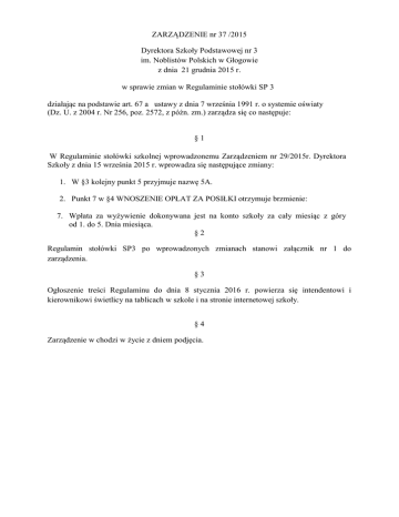 ZARZĄDZENIE nr 37 /2015 Dyrektora Szkoły Podstawowej nr 3 im. Noblistów Polskich w Głogowie z dnia 21 grudnia 2015 r. w sprawie zmian w Regulaminie stołówki SP 3 działając na podstawie art. 67 a ustawy z dnia 7 września 1991 r. o systemie oświaty (Dz. U. z 2004 r. Nr 256, poz. 2572, z późn. zm.) zarządza się co następuje: §1 W Regulaminie stołówki szkolnej wprowadzonemu Zarządzeniem nr 29/2015r. Dyrektora Szkoły z dnia 15 września 2015 r. wprowadza się następujące zmiany: 1. W §3 kolejny punkt 5 przyjmuje nazwę 5A. 2. Punkt 7 w §4 WNOSZENIE OPŁAT ZA POSIŁKI otrzymuje brzmienie: 7. Wpłata za wyżywienie dokonywana jest na konto szkoły za cały miesiąc z góry od 1. do 5. Dnia miesiąca. §2 Regulamin stołówki SP3 po wprowadzonych zmianach stanowi załącznik nr 1 do zarządzenia. §3 Ogłoszenie treści Regulaminu do dnia 8 stycznia 2016 r. powierza się intendentowi i kierownikowi świetlicy na tablicach w szkole i na stronie internetowej szkoły. §4 Zarządzenie w chodzi w życie z dniem podjęcia. Załącznik nr 1 do Zarządzenia Dyrektora Szkoły z dnia 21 grudnia 2015 r. REGULAMIN STOŁÓWKI SZKOLNEJ SZKOŁY PODSTAWOWEJ NR 3 IM. NOBLISTÓW POLSKICH W GŁOGOWIE §1 POSTANOWIENIA OGÓLNE 1. 2. 3. Stołówka jest miejscem spożywania posiłków przygotowanych przez pracowników kuchni szkolnej. Stołówka szkolna funkcjonuje w dni nauki szkolnej od drugiego dnia roku szkolnego, natomiast kończy wydawanie obiadów 2 dni przed zakończeniem roku szkolnego. Posiłki wydawane są w godzinach: - 12:25 – 12:45 klasy IV-VI na przerwie - 12:00 – 14:00 klasy I-III, - 13:15 – 13.30 Gimnazjum nr 2 na przerwie §2 UPRAWNIENIA DO KORZYSTANIA ZE STOŁÓWKI 4. Do korzystania z posiłków w stołówce szkolnej uprawnieni są: 1) uczniowie szkoły SP – 3 , SP – 13, Gimnazjum nr 2 2) uczniowie szkoły, których dożywianie dofinansowuje Miejski Ośrodek Pomocy Społecznej . 3) pracownicy zatrudnieni w szkole . §3 USTALENIE WYSOKOŚCI OPŁAT ZA POSIŁKI Wysokość opłat za korzystanie z posiłków w stołówce szkolnej ustala Dyrektor Szkoły w porozumieniu z Organem Prowadzącym. 1) Wysokość opłat za posiłki szkolne dla uczniów, ustala się w wysokości kosztów produktów wykorzystanych do przygotowania posiłku. 2) Wysokość opłat za posiłki szkolne dla pracowników, ustala się w wysokości kosztów produktów wykorzystanych do przygotowania posiłku oraz kosztów utrzymania stołówki. 5A. Wysokość opłat za obiady szkolne w stołówce wynosi: 1) jeden posiłek dla ucznia - opłata 3,80 złotych, 2) jeden posiłek dla pozostałych osób uprawnionych – 6,50 złotych. 6. O zmianie odpłatności za posiłki korzystający ze stołówki informowani są z co najmniej miesięcznym wyprzedzeniem. 5. §4 WNOSZENIE OPŁAT ZA POSIŁKI 7. Wpłata za wyżywienie dokonywana jest na konto szkoły za cały miesiąc z góry od 1. do 5. dnia miesiąca BANK BGŻ GŁOGÓW 8. 9. 10. 07 2030 0045 1110 0000 0193 1540 Datą dokonania wpłaty jest dzień, w którym środki wpłyną na rachunek szkoły. Na dowodzie wpłaty należy podać imię i nazwisko dziecka, miesiąc za który dokonywana jest wpłata oraz klasę, do której uczęszcza. Brak wpłaty na koncie Szkoły będzie skutkował tym, że uczeń nie otrzyma obiadu w stołówce szkolnej. W przypadku wnoszenia opłat za posiłki dla uczniów przez Miejski Ośrodek Pomocy Społecznej w Głogowie zasady i terminy dokonywania tych opłat regulują zapisy odrębnych porozumień zawartych pomiędzy Ośrodkiem, a szkołą prowadzącą stołówkę. §5 ZWROTY ZA NIEWYKORZYSTANE OBIADY 11. 12. 13. 14. 15. Zwrot poniesionych kosztów następuje z powodu choroby, wycieczki lub innych przyczyn losowych, jeżeli nieobecność ucznia wynosi jeden dzień lub dłużej po wcześniejszym zgłoszeniu nieobecności ucznia. Ustalenia dotyczące zwrotów: 1) W przypadku nieobecności z powodu nagłej choroby lub zdarzeń losowych należy ten fakt zgłosić telefonicznie ( 76 8347163 wew. 29 ) lub osobiście u intendentki najpóźniej do godziny 8.00, w przeciwnym razie zwrot za dany dzień nie będzie możliwy. 2) W przypadku wyjazdów, wycieczek, itp. o nieobecności uczniów powiadamiają organizatorzy imprezy co najmniej na dwa dni przed planowaną nieobecnością – przedkładając imienną listę uczestników imprezy. Wszystkie nieobecności zgłoszone będą odliczane od wpłaty za kolejny miesiąc, należy skontaktować się z intendentem w celu ustalenia kwoty wpłaty. W przypadku nieuzasadnionej lub niezgłoszonej nieobecności na posiłku, uiszczona z góry opłata za niewykorzystany obiad nie podlega zwrotowi. Rezygnację z korzystania ze stołówki szkolnej należy zgłosić pisemnie u intendentki szkoły, najpóźniej do 20 dnia poprzedniego miesiąca w którym uczeń korzysta z obiadów. §6 ZASADY ZACHOWANIA W STOŁÓWCE 16. 17. 18. 19. 20. 21. Uczniowie powinni: 1) stosować się do przyjętych w szkole zasad kulturalnego zachowania 2) stosować się do poleceń nauczycieli dyżurujących, intendenta oraz personelu stołówki, 3) spokojnie poruszać się po stołówce szkolnej dbając o bezpieczeństwo własne i innych, 4) zachować porządek przy odbiorze dania oraz przy oddawaniu naczyń (do okienka poodchodzić kolejno, bez przepychania) 5) zachowywać się cicho, nie zakłócając spożywania posiłku. 6) zachować porządek podczas spożywania posiłku (odnieść talerze, zostawić czyste miejsce na stoliku i pod nim, zasunąć krzesło) 7) szanować naczynia, sztućce oraz nakrycia stołu, 8) po skończonym posiłku opuścić stołówkę, Kierownik świetlicy rozstrzyga w porozumieniu z rodzicami o odpowiedzialności za szkody spowodowane w stołówce. Podczas wydawania obiadów zabrania się pobytu w pomieszczeniach stołówki osobom nie spożywającym posiłków. Zabronione jest wnoszenie do stołówki okryć wierzchnich, plecaków oraz wszelkich naczyń, sztućców i innych rzeczy pochodzenia obcego. Z p