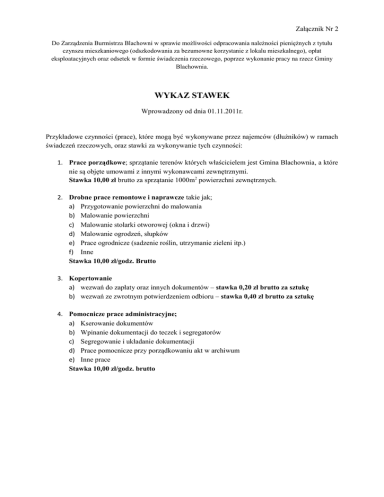 Załącznik Nr 2 Do Zarządzenia Burmistrza Blachowni w sprawie możliwości odpracowania należności pieniężnych z tytułu czynszu mieszkaniowego (odszkodowania za bezumowne korzystanie z lokalu mieszkalnego), opłat eksploatacyjnych oraz odsetek w formie świadczenia rzeczowego, poprzez wykonanie pracy na rzecz Gminy Blachownia. WYKAZ STAWEK Wprowadzony od dnia 01.11.2011r. Przykładowe czynności (prace), które mogą być wykonywane przez najemców (dłużników) w ramach świadczeń rzeczowych, oraz stawki za wykonywanie tych czynności: 1. Prace porządkowe; sprzątanie terenów których właścicielem jest Gmina Blachownia, a które nie są objęte umowami z innymi wykonawcami zewnętrznymi. Stawka 10,00 zł brutto za sprzątanie 1000m2 powierzchni zewnętrznych. 2. Drobne prace remontowe i naprawcze takie jak; a) Przygotowanie powierzchni do malowania b) Malowanie powierzchni c) Malowanie stolarki otworowej (okna i drzwi) d) Malowanie ogrodzeń, słupków e) Prace ogrodnicze (sadzenie roślin, utrzymanie zieleni itp.) f) Inne Stawka 10,00 zł/godz. Brutto 3. Kopertowanie a) wezwań do zapłaty oraz innych dokumentów – stawka 0,20 zł brutto za sztukę b) wezwań ze zwrotnym potwierdzeniem odbioru – stawka 0,40 zł brutto za sztukę 4. Pomocnicze prace administracyjne; a) Kserowanie dokumentów b) Wpinanie dokumentacji do teczek i segregatorów c) Segregowanie i układanie dokumentacji d) Prace pomocnicze przy porządkowaniu akt w archiwum e) Inne prace Stawka 10,00 zł/godz. brutto