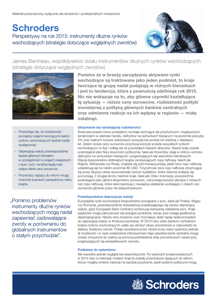 Materiał przeznaczony wyłącznie dla doradców i profesjonalnych inwestorów Schroders Perspektywy na rok 2015: instrumenty dłużne rynków wschodzących (strategie dotyczące względnych zwrotów) James Barrineau, współdyrektor działu instrumentów dłużnych rynków wschodzących (strategie dotyczące względnych zwrotów) Pomimo że w branży zarządzania aktywami rynki wschodzące są traktowane jako jeden podmiot, to kraje tworzące tę grupę nadal podążają w różnych kierunkach i jest to tendencja, która z pewnością zdefiniuje rok 2015. Nic nie wskazuje na to, aby główne czynniki kształtujące tę sytuację — niższe ceny surowców, rozbieżność polityki monetarnej z polityką głównych banków centralnych oraz odmienne reakcje na ich wpływy w regionie — miały osłabnąć. –– Przewiduje się, że rozbieżność pomiędzy krajami tworzącymi sektor rynków wschodzących będzie nadal występować. –– Deprecjacja waluty prawdopodobnie będzie głównym tematem w szczególności w krajach związanych z euro i tych, na które będą mieć wpływ niskie ceny surowców. –– Przywódcy dążący do reform mogą znacznie poprawić perspektywy wielu krajów. „Pomimo problemów instrumenty dłużne rynków wschodzących mogą nadal zapewniać zadowalające zwroty w porównaniu do globalnych instrumentów o stałym przychodzie”. Utrzymanie się narastającej rozbieżności Świat jest prawie równo podzielony na kraje cechujące się pozytywnymi i negatywnymi tendencjami w zakresie handlu, deficytów na rachunkach bieżących na poziomie powyżej 3% oraz realnych kursów walutowych powyżej lub poniżej ich średniej z dziesięciu lat. Zatem niższe ceny surowców przyniosą korzyści przede wszystkich rynkom wschodzącym w Azji i odbiją się na pozostałych klasach aktywów. Nawet kraje zwykle postrzegane jako filary słuszności politycznej, takie jak Kolumbia, stają w obliczu wzrostu deficytów na rachunkach bieżących i pogarszających się warunków handlowych. Więcej bezpośrednio dotkniętych krajów produkujących ropę naftową, takich jak Nigeria, Wenezuela czy Rosja, znajdzie się pod rosnącą presją, jeżeli ceny ropy naftowej ustabilizują się na niskim poziomie 80 USD. Trzycyfrowe ceny ropy naftowej utrzymujące się przez dłuższy okres spowodowały wzrost wydatków, które obecnie znalazły się pod presją. Z drugiej strony niektóre kraje, takie jak Chile i Indonezja, powszechnie postrzegane jako główni eksporterzy surowców, odczuwają korzyści płynące z niższych cen ropy naftowej, które rekompensują z nawiązką osłabienie wynikające z niskich cen surowców głównie przez nie eksportowanych. Prawdopodobna deprecjacja waluty Europejskie rynki wschodzące bezpośrednio powiązane z euro, takie jak Polska, Węgry czy Rumunia, prawdopodobnie doświadczą przedłużającego się okresu deprecjacji waluty, gdyż Europejski Bank Centralny kontynuuje kampanię osłabiania euro. Kraje azjatyckie mogą zdecydować się postąpić podobnie, biorąc pod uwagę gwałtowną deprecjację jena. Niższe ceny towarów oraz mocniejszy dolar będą nadal prowadzić do deprecjacji waluty w Ameryce Łacińskiej. W 2014 roku wielu bankom centralnym krajów rynków wschodzących udało się obniżyć stopy procentowe w odpowiedzi na słabszy światowy wzrost. Presja wywierana przez niższe kursy walut ograniczy jednak tę możliwość i w razie zwiększenia intensywności tego zjawiska banki centralne mogą zostać zmuszone do reakcji za pomocą podniesienia stóp procentowych nawet przy pogarszających się perspektywach wzrostu. Podstawy do optymizmu Nie wszystko jednak wygląda tak pesymistycznie. Po wyborach przeprowadzonych w 2014 roku w Indonezji i Indiach kraje te zyskały przywódców dążących do reform, którzy mogliby zmienić nastroje na bardziej pozytywne, jeżeli systemy polityczne mogą Perspektywy na rok 2015: instrumenty dłużne rynków wschodzących (strategie dotyczące względnych zwrotów) zostać nagięte do ich programu. Nawet w Brazylii powrót obecnego, niespełniającego oczekiwań przywódcy może prowadzić do reform ze względu na zwykłą konieczność, ponieważ nieodpowiednia polityka fiskalna doprowadziła do całkowitej zależności od polityki pieniężnej, co przybliżyło widmo recesji. W wyborach, które się odbędą pod koniec 2015 roku, Argentyna prawie na pewno wybierze przyjaźniejszego dla rynku przywódcę. James Barrineau, współdyrektor działu instrumentów dłużnych rynków wschodzących (strategie dotyczące względnych zwrotów) James Barrineau rozpoczął pracę w spółce Schroders w kwietniu 2012 roku jako współdyrektor działu instrumentów dłużnych rynków wschodzących (strategie dotyczące względnych zwrotów). Zanim dołączył do zespołu spółki Schroders, w latach 2010–2012 pracował jako starszy zarządzający portfelem instrumentów dłużnych państw w spółce ICE Canyon, firmie zajmującej się inwestycjami alternatywnymi, która specjalizowała się w instrumentach dłużnych rynków wschodzących. W latach 1998–2010 Jim pracował jako strateg ds. instrumentów dłużnych rynków wschodzących i waluty w firmie Alliance Bernstein, gdzie był odpowiedzialny głównie za Amerykę Łacińską. W latach 1996–1998 Jim był strategiem ds. akcji z Ameryki Łacińskiej w firmie Salomon Smith Barney, a w latach 1994–1996 strategiem ds. instrumentów dłużnych rynków wschodzących w tej samej firmie. W latach 1988–1994 pracował na zlecenie rządu Stanów Zjednoczonych jako starszy ekonomista. Pomimo problemów instrumenty dłużne rynków wschodzących mogą nadal zapewniać zadowalające zwroty w porównaniu do globalnych instrumentów o stałym przychodzie. Większość instrumentów dłużnych rynków wschodzących cechuje wiarygodność kredytowa na poziomie inwestycyjnym, a spready utrzymują się na przeciętnym poziomie w porównaniu do amerykańskic