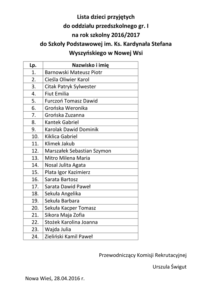 Lista dzieci przyjętych do oddziału przedszkolnego gr. I na rok szkolny 2016/2017 do Szkoły Podstawowej im. Ks. Kardynała Stefana Wyszyńskiego w Nowej Wsi Lp. 1. 2. 3. 4. 5. 6. 7. 8. 9. 10. 11. 12. 13. 14. 15. 16. 17. 18. 19. 20. 21. 22. 23. 24. Nazwisko i imię Barnowski Mateusz Piotr Cieśla Oliwier Karol Citak Patryk Sylwester Fiut Emilia Furczoń Tomasz Dawid Grońska Weronika Grońska Zuzanna Kantek Gabriel Karolak Dawid Dominik Kiklica Gabriel Klimek Jakub Marszałek Sebastian Szymon Mitro Milena Maria Nosal Julita Agata Plata Igor Kazimierz Sarata Bartosz Sarata Dawid Paweł Sekuła Angelika Sekuła Barbara Sekuła Kacper Tomasz Sikora Maja Zofia Stożek Karolina Joanna Wajda Julia Zieliński Kamil Paweł Przewodniczący Komisji Rekrutacyjnej Urszula Świgut Nowa Wieś, 28.04.2016 r. Lista dzieci przyjętych do oddziału przedszkolnego gr. II na rok szkolny 2016/2017 do Szkoły Podstawowej im. Ks. Kardynała Stefana Wyszyńskiego w Nowej Wsi Lp. 1. 2. 3. 4. 5. 6. 7. 8. 9. 10. 11. 12. 13. 14. 15. 16. 17. 18. 19. 20. 21. Nazwisko i imię Bębenek Kacper Bołoz Maja Karolina Bołoz Nikola Izabela Cabak Dawid Karol Domek Sebastian Paweł Jagiełka Szymon Piotr Kulig Aneta Rozalia Latoń Bartosz Jan Lichoń Szymon Pieńkus Nikola Aldona Pycha Dominik Sarata Julia Maria Sarata Miłosz Adam Sobczyk Edyta Katarzyna Stanisz Klaudia Elżbieta Szczepaniec Maciej Szczepaniec Mikołaj Szczepaniec Oskar Toczek Klaudia Katarzyna Wojtarowicz Kamila Monika Złocki Karol Przewodniczący Komisji Rekrutacyjnej Urszula Świgut Nowa Wieś, 28.04.2016 r. Lista dzieci przyjętych do oddziału przedszkolnego gr. III na rok szkolny 2016/2017 do Szkoły Podstawowej im. Ks. Kardynała Stefana Wyszyńskiego w Nowej Wsi Lp. 1. 2. 3. 4. 5. 6. 7. 8. 9. 10. 11. 12. 13. 14. 15. 16. 17. 18. 19. 20. 21. 22. Nazwisko i imię Bołoz Szymon Jan Domek Paulina Ewa Fiut Katarzyna Horowski Jan Klimczak Aleksander Jan Kulig Damian Ryszard Kumor Arkadiusz Daniel Latoń Pola Maria Marszałek Kacper Krzysztof Łaś Zofia Katarzyna Ogórek Oliwia Elżbieta Pach Tomasz Sarata Dominika Izabela Sarata Emilia Kinga Sarata Katarzyna Zofia Sroka Julia Stożek Sabina Katarzyna Stylok Krzysztof Szczecina Klaudia Patrycja Szczecina Paulina Agnieszka Zielińska Zofia Wątor Olga Agnieszka Przewodniczący Komisji Rekrutacyjnej Urszula Świgut Nowa Wieś, 28.04.2016 r. Lista dzieci przyjętych do oddziału przedszkolnego na rok szkolny 2016/2017 do Szkoły Filialnej w Roztoce Wielkiej Lp. 1. 2. 3. 4. 5. 6. 7. 7. 8. 8. 9. 9. Nazwisko i imię Bochenek Dominika Magdalena Groń Dorota Klimczak Wojciech Karol Kurtek Dawid Mariusz Lelito Anna Natalia Maślanka Oliwier Karol Sekuła Filip Marek Sekuła Oliwier Wnęk Emilia Anna Przewodniczący Komisji Rekrutacyjnej Urszula Świgut Nowa Wieś, 28.04.2016 r. Informuję, że w dniach od 26 do 27 kwietnia 2016 r. w sekretariacie szkoły rodzice dzieci przedszkolnych i pierwszoklasistów mają obowiązek potwierdzić przyjęcie dziecka do naszego przedszkola/szkoły w postaci pisemnego oświadczenia woli.
