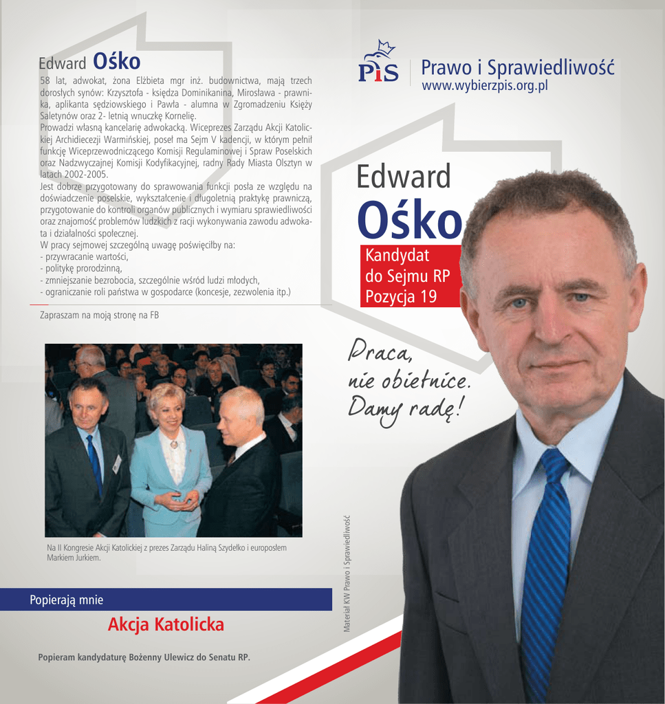 Edward Ośko Prawo i Sprawiedliwość 58 lat, adwokat, żona Elżbieta mgr inż. budownictwa, mają trzech dorosłych synów: Krzysztofa - księdza Dominikanina, Mirosława - prawnika, aplikanta sędziowskiego i Pawła - alumna w Zgromadzeniu Księży Saletynów oraz 2- letnią wnuczkę Kornelię. Prowadzi własną kancelarię adwokacką. Wiceprezes Zarządu Akcji Katolickiej Archidiecezji Warmińskiej, poseł ma Sejm V kadencji, w którym pełnił funkcję Wiceprzewodniczącego Komisji Regulaminowej i Spraw Poselskich oraz Nadzwyczajnej Komisji Kodyfikacyjnej, radny Rady Miasta Olsztyn w latach 2002-2005. Jest dobrze przygotowany do sprawowania funkcji posła ze względu na doświadczenie poselskie, wykształcenie i długoletnią praktykę prawniczą, przygotowanie do kontroli organów publicznych i wymiaru sprawiedliwości oraz znajomość problemów ludzkich z racji wykonywania zawodu adwokata i działalności społecznej. W pracy sejmowej szczególną uwagę poświęciłby na: - przywracanie wartości, - politykę prorodzinną, - zmniejszanie bezrobocia, szczególnie wśród ludzi młodych, - ograniczanie roli państwa w gospodarce (koncesje, zezwolenia itp.) www.wybierzpis.org.pl Edward Ośko Kandydat do Sejmu RP Pozycja 19 Zapraszam na moją stronę na FB Na II Kongresie Akcji Katolickiej z prezes Zarządu Haliną Szydełko i europosłem Markiem Jurkiem. Popierają mnie Akcja Katolicka Popieram kandydaturę Bożenny Ulewicz do Senatu RP. Materiał KW Prawo i Sprawiedliwość Praca, nie obietnice. Damy radę!
