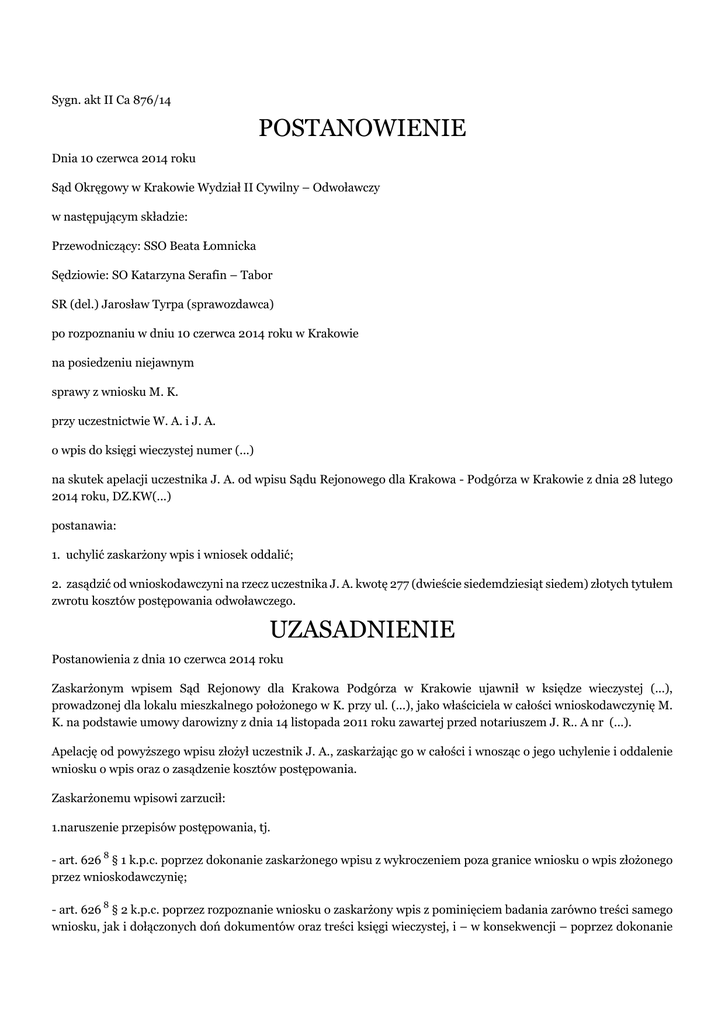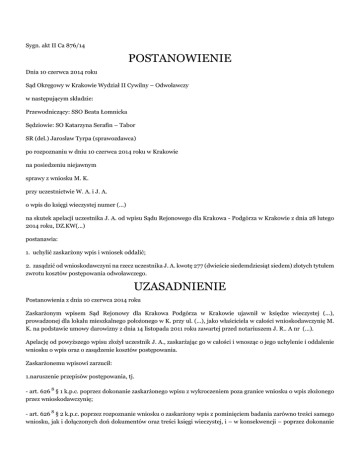 Sygn. akt II Ca 876/14 POSTANOWIENIE Dnia 10 czerwca 2014 roku Sąd Okręgowy w Krakowie Wydział II Cywilny – Odwoławczy w następującym składzie: Przewodniczący: SSO Beata Łomnicka Sędziowie: SO Katarzyna Serafin – Tabor SR (del.) Jarosław Tyrpa (sprawozdawca) po rozpoznaniu w dniu 10 czerwca 2014 roku w Krakowie na posiedzeniu niejawnym sprawy z wniosku M. K. przy uczestnictwie W. A. i J. A. o wpis do księgi wieczystej numer (...) na skutek apelacji uczestnika J. A. od wpisu Sądu Rejonowego dla Krakowa - Podgórza w Krakowie z dnia 28 lutego 2014 roku, DZ.KW(...) postanawia: 1. uchylić zaskarżony wpis i wniosek oddalić; 2. zasądzić od wnioskodawczyni na rzecz uczestnika J. A. kwotę 277 (dwieście siedemdziesiąt siedem) złotych tytułem zwrotu kosztów postępowania odwoławczego. UZASADNIENIE Postanowienia z dnia 10 czerwca 2014 roku Zaskarżonym wpisem Sąd Rejonowy dla Krakowa Podgórza w Krakowie ujawnił w księdze wieczystej (...), prowadzonej dla lokalu mieszkalnego położonego w K. przy ul. (...), jako właściciela w całości wnioskodawczynię M. K. na podstawie umowy darowizny z dnia 14 listopada 2011 roku zawartej przed notariuszem J. R.. A nr (...). Apelację od powyższego wpisu złożył uczestnik J. A., zaskarżając go w całości i wnosząc o jego uchylenie i oddalenie wniosku o wpis oraz o zasądzenie kosztów postępowania. Zaskarżonemu wpisowi zarzucił: 1.naruszenie przepisów postępowania, tj. - art. 626 8 § 1 k.p.c. poprzez dokonanie zaskarżonego wpisu z wykroczeniem poza granice wniosku o wpis złożonego przez wnioskodawczynię; - art. 626 8 § 2 k.p.c. poprzez rozpoznanie wniosku o zaskarżony wpis z pominięciem badania zarówno treści samego wniosku, jak i dołączonych doń dokumentów oraz treści księgi wieczystej, i – w konsekwencji – poprzez dokonanie zaskarżonego wpisu w sposób nieodpowiadający samemu wnioskowi o wpis oraz treści księgi wieczystej (...), jak również w sposób niezgodny z treścią umowy darowizny, stanowiącej podstawę zaskarżonego wpisu; - art. 6269 k.p.c. poprzez jego niezastosowanie i nieoddalenie wniosku, pomimo, iż istniały przeszkody do dokonania wpisu zgodnego z wnioskiem, polegające na braku tożsamości lokalu opisanego w umowie darowizny z lokalem ujawnionym w księdze wieczystej w chwili dokonywania zaskarżonego wpisu oraz na niewywołaniu przez umowę darowizny skutku rzeczowego w zakresie przeniesienia własności lokalu na wnioskodawczynię; 2. naruszenie prawa materialnego: - polegające na błędnej wykładni art. 155 § 1 i 2 k. zd. II k.c. w zw. z art. 158 k.c. poprzez bezpodstawne przyjęcie, iż umowa darowizny opisana w punkcie 2 przeniosła na wnioskodawczynię własność lokalu numer (...), ujawnionego w księdze wieczystej numer (...); - polegające na niewłaściwym zastosowaniu przepisu art. 29 ustawy o księgach wieczystych i hipotece poprzez bezpodstawne przyjęcie, że warunek prawnym pod jakim została zawarta umowa darowizny opisana w punkcie 2 (tj. wyodrębnienie lokalu wskazanego w umowie darowizny) ziścił się, a co za tym idzie poprzez bezpodstawne przyjęcie, iż wnioskodawczyni na podstawie tej umowy nabyła własność lokalu numer (...), ujawnionego w księdze wieczystej numer (...). Skarżący zarzucił, że podstawą dla dokonania zaskarżonego wpisu była umowa darowizny z dnia 14 listopada 2011 roku, której przedmiotem był niewyodrębniony wówczas lokal oznaczony numerem (...), mający jednak inną powierzchnię niż lokal wpisany aktualnie do księgi wieczystej numer (...) oraz inne pomieszczenia przynależne – w miejsce pomieszczenia numer 1 w wolnostojącym budynku garażowo – składowym w umowie wpisano udział w ½ części w tym budynku. Umowa darowizny odzwierciedlała w zakresie opisu przedmiotu darowizny postanowienia umowy zniesienia współwłasności oraz umowy o ustanowieniu odrębnej własności lokali, zawartych 27 października 2011 roku, a objętych aktem notarialnym sporządzonym przez notariusza J. D., w której to umowie strony, tj. uczestnicy oraz R. A. postanowiły, iż do lokalu numer (...) przynależeć będzie udział ½ części wolnostojącego budynku garażowo – składowego. Poprawność takiego rozwiązania została zakwestionowana w orzeczeniu referendarza sądowego, który postanowieniem z dnia 2 lutego 2012 roku oddalił wniosek o wyodrębnienie i wpis do nowozakładanej księgi wieczystej lokalu numer (...) w kształcenie wynikającym z pierwotnej wersji umowy zniesienia współwłasności oraz umowy ustanowienia odrębnej własności lokalu z dnia 27 października 2011 roku. Uzasadnieniem dla takiego rozstrzygnięcia był fakt, iż w ukształtowanie jako pomieszczenia przynależnego jedynie udziału w pomieszczeniu jest niezgodne z prawem. Przynależnościami do lokalu mogą być bowiem tylko i wyłącznie pomieszczenia, a nie udziały w nich. Postanowienie to uprawomocniło się. W związku z prawomocnym oddaleniem wniosku o wpis, zawartego w umowie zniesienia współwłasności oraz umowie ustanowienia odrębnej własności lokali z dnia 27 października 29011 roku oddalony został również wniosek złożony w dniu 17 listopada 2011 roku i wpis prawa własności na rzecz wnioskodawczyni na podstawie umowy darowizny z dnia 14 listopada 2011 roku. Dopiero aneksem z dnia 10 grudnia 2012 roku sporządzonym przed notariuszem J. D. zmieniono zakwestionowane przez referendarza sądowego postanowienia w umowie o zniesienie współwłasności oraz ustanowienia odrębnej własności lokali z dnia 27 października 2011 roku i w konsekwencji wniosek o założenie księgi wieczystej dla lokalu numer (...) w nowym kształcie (odmiennym od opisanego w umowie darowizny)został pozytywnie rozpoznany. Aneks został sporządzony już po uprawomocnieniu się postanowień o oddaleniu wniosków wieczysto księgowych, a nie uległa zamianie umowa darowizny, opisująca lokal numer (...) w sposób odmienny niż zmieniona umo
