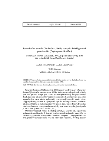 Wiad. entomol. 18 (2): 99-102 Poznań 1999 Synanthedon loranthi (KRÁLIČEK, 1966), nowy dla Polski gatunek przeziernika (Lepidoptera: Sesiidae) Synanthedon loranthi (K RÁLIČEK, 1966), a species of clearwing moth new to the Polish fauna (Lepidoptera: Sesiidae) MAREK H OŁOWIŃSKI 1, MAREK MIŁKOWSKI 2 1 2 22-233 Macoszyn ul. Królowej Jadwigi 19/21, 26-600 Radom ABSTRACT: Synanthedon loranthi (KRÁLIČEK, 1966) a species new to the Polish fauna, was found in Kozienice Forest (Mazowiecka Lowland) in 1998. KEY WORDS: Lepidoptera, Sesiidae, Synanthedon loranthi, faunistic, Poland. Synanthedon loranthi (KRÁLIČEK , 1966) został wyodrębniony z Synanthedon cephiformis (OCHSENHEIMER, 1808). Jedną z ważniejszych cech, różniących oba gatunki motyli jest kształt plamki dyskoidalnej na tylnych skrzydłach. Jest ona u S. loranthi wyraźnie węższa niż u S. cephiformis. Inną istotną cechą, jest zabarwienie najbardziej zewnętrznej krawędzi bioder pierwszej pary odnóży, które u S. cephiformis są żółte na całej krawędzi, natomiast u S. loranthi żółte są maksymalnie w 4/5 części, licząc od podstawy. Pozostałe różnice w budowie zewnętrznej oraz między aparatami kopulacyjnymi podają KRÁLIČEK (1966) i L AŠTŮVKA (1983). Oprócz wyraźnych różnic morfologicznych, S. loranthi i S. cephiformis mają odmienną biologię. S. loranthi żeruje w nasadowej części pasożytów roślinnych – gązewniku europejskim Loranthus europeus L., stąd pochodzi nazwa gatunkowa przeziernika oraz na jemiołach Viscum L. Według dostęp- 100 M. HOŁOWIŃSKI, M. MIŁKOWSKI Fot. (Phot.) Synanthedon loranthi (KRÁLIČEK, 1966) – samiec (male). nych danych, S. loranthi preferuje jemiołę Viscum album ssp. austriacum (WIESB .) VOLLM , związaną z drzewami iglastymi, głównie sosną i jodłą (K RISTAL 1990; SOBCZYK 1996). S. cephiformis żeruje pod korą, na pniach i gałęziach jodły pospolitej Abies alba (MILL .). Najchętniej zasiedla miejsca wokół rakowatości, wywołanych przez grzyba Melampsorella caryophyllacearum (S CHR.). Zasiedla również zranienia mechaniczne (KRISTAL 1990; SOBCZYK 1996). S. loranthi występuje w południowo-środkowej i zachodniej Europie. Obejmuje swoim zasięgiem półwysep Bałkański, Węgry, Słowację, Czechy, Austrię, Szwajcarię, Niemcy, Francję i Hiszpanię (LAŠTŮVKA, LAŠTŮVKA 1995). W Polsce S. loranthi został stwierdzony w Puszczy Kozienickiej na dwóch stanowiskach: – Augustów (UTM: EC30), 28 IV 1998, 1& ex larva, z dwóch żerowisk zebranych 18 II 1998, ze świeżych pędów jemioły Viscum album ssp. austriacum (WIESB.) VOLLM, odciętych od konara sosny zwyczajnej Pinus sylvestris L. SYNANTHEDON LORANTHI, NOWY DLA POLSKI GATUNEK PRZEZIERNIKA 101 – okolice rez. „Ciszek” (UTM: EC20), 26 V 1998, 1% ex larva (Fot.); 3 VII 1998, 1% ex larva, z żerowisk zebrnych 22 II 1998, także z pędów jemioły Viscum album ssp. austriacum (WIESB.) VOLLM, odciętych od gałęzi sosny zwyczajnej Pinus sylvestris L. Larwy S. loranthi żerują w bardzo charakterystyczny sposób, trudny do pomylenia z żerowiskami innych owadów rozwijających się na jemiole. Żerowisko znajduje się bardzo płytko, pod nie zdrewniałą tkanką okrywającą i obejmuje najczęściej 1 – 2 człony rośliny. Chodnik jest początkowo płatowaty, później larwa drąży wąski kanał wzdłuż pędu, w miękkiej warstwie przyobwodowej. Miejscami dochodzi do zewnątrz i z otworów wydobywają się grudki kału z przędzą. Rozwój trwa 1 rok, a w niesprzyjających warunkach przedłuża się do 2 lat. Rozwój S. loranthi odbywa się w żywych jemiołach, rosnących na gałęziach sosen, głównie w koronach drzew. Dlatego też, żerowiska jak i postacie dorosłe są trudne do zaobserwowania. Jedną ze skutecznych metod stwierdzenia przeziernika jest przegląd drzew przy pracach zrębowych, najlepiej w końcu zimy. W tym okresie żerowiska S. loranthi są już dobrze widoczne. Istnieje duże prawdopodobieństwo znalezienia tego motyla w południowo-wschodniej części kraju, chociażby w Puszczy Sandomierskiej lub Niepołomickiej, gdzie jemioła bardzo silnie opanowuje drzewostany sosnowe. Autorzy składają podziękowania mgr Markowi BĄKOWSKIEMU za pomoc merytoryczną oraz dr hab. Jerzemu M. GUTOWSKIEMU za inspiracje do pracy. SUMMARY Synanthedon loranthi (KR .) (Lepidoptera: Sesiidae) a species new to the Polish fauna was found in Augustów and near „Ciszek” reserve in Kozienice Forest. Imagines were reared from the larvae found in branches of mistletoe Viscum album ssp. austriacum (WIESB.) VOLLM, colonising common pine Pinus sylvestris L. Both, preimaginal stages and adults are difficult to observe because of life cycle connected with tree crown. PIŚMIENNICTWO LAŠTŮVKA Z., 1983: Morfologie a biologie nesytek Synanthedon cephiformis (O.) a S. loranthi (KR .) (Lepidoptera, Sesiidae). Acta univ. agric. Brno, fac. agron. 31 (3): 143-158. LAŠTŮVKA Z., LAŠTUVKA A., 1995: An illustrated key to European Sesiidae (Lepidoptera). Faculty of Agronomy MUAF, Brno. 174 ss. 102 M. HOŁOWIŃSKI, M. MIŁKOWSKI KRÁLIČEK M., 1966: Neue Glasflügler-Art. Der Gattung Aegeria F. Aus Südmähren (Sesiidae, Lep.). Acta Mus. Moraviae, Sci. Nat., 51: 231-236. KRISTAL P. M., 1990: Synanthedon loranthi (K RÁLIČEK, 1966) auch in Deutschland (Lepidoptera, Sesiidae). Nachr. Entomol. Ver. Apollo, Franfurkt, N. F., 11: 61-74. SOBCZYK T., 1996: Synanthedon loranthi (KRÁLIČEK, 1966) in Ostdeutschland (Lep., Sesiidae). Ent. Nachr. Ber. 40: 49-51.