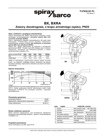 TI-P036-02 PL CH Issue 1 BX, BXRA Zawory dwudrogowe, z br¹zu armatniego (spi¿u), PN25 Opis, wielkoci i przy³¹cza standardowe 4 Zawory dwudrogowe BX, BXRA maj¹ korpusy wykonane z br¹zu armatniego, s¹ jednogniazdowe, normalnie otwarte (BX) b¹d normalnie zamkniête (BXRA). Wraz z odpowiednim zespo³em termostatycznym SA (patrz karta katalogowa TI-P046-01PL) tworz¹ regulator temperatury bezporedniego dzia³ania (RTBD), dla stosowania w procesach grzania (BX) b¹d ch³odzenia (BXRA). Zawory BX i BXRA wykonywane s¹ wy³¹cznie z przy³¹czami gwintowanymi R1/2. Ponadto zawór BX dostêpny jest w czterech odmianach, ró¿ni¹cych siê wielkoci¹ gniazda, a zatem wspó³czynnikiem przep³ywu Kvs. gwinty rurowe R 1/2 Kvs ∆PMX [bar] BX2 0,38 17,2 BX3 0,64 17,2 BX4 1,03 17,2 BX6 1,65 17,2 3 2 1 8 6 BXRA 0,59 10,3 7 ∆PMX to maksymalna, dopuszczalna ró¿nica cinieñ czynnika przed i za zaworem, dzia³aj¹ca przeciw zamykaniu siê zaworu normalnie otwartego, b¹d przeciw otwieraniu siê zaworu normalnie zamkniêtego. BX temperatura °C Zakres stosowania 5 uwaga ! 2 nie stosowaæ krzywa nasycenia pary 4 3 1 cinienie bar m uwaga ! Je¿eli temperatura czynnika przep³ywaj¹cego przez zawór przekracza 232°C, trzeba zastosowaæ ³¹cznik dystansuj¹cy (patrz karta katalogowa TI-P033-01 PL) pomiêdzy zaworem i zespo³em termostatycznym. 8 6 7 Parametry graniczne Konstrukcja korpusu Maksymalna, dopuszczalna temperatura Próba hydrauliczna BXRA PN25 260°C 38 bar m poz. Dobór wielkoci zaworów Dobór zaworów regulacyjnych, oraz kompletnych regulatorów temperatury bezporedniego dzia³ania - zgodnie z kart¹ katalogow¹ TI-RTBD-01 PL. czêæ br¹z armatni (spi¿) 2 grzybek stal nierdzewna AISI 440B 3 gniazdo stal nierdzewna BS 970 431 S29 4 uszczelka gniazda BS 1400 LG2 mied BS 2870 C102 5 sprê¿yna powrotna grzybka stal nierdzewna BS 2056 302 S26 6 sprê¿yna powrotna Przyk³ad zamówienia materia³, norma 1 korpus stal nierdzewna BS 2056 302 S26 7 pokrywa mosi¹dz 8 uszczelka grafit laminowany Zawór dwudrogowy, typ BX4, gwint R1/2 Spirax Sarco zastrzega sobie prawo do zmiany konstrukcji i danych technicznych BS 2872 CZ 122 A Wielkoci, wymiary [mm], ciê¿ary R 1/2 A 95 B 83 A ciê¿ar 0,7 kg Instalacja Zawór powinien byæ zabudowany na poziomym odcinku ruroci¹gu, z si³ownikiem zespo³u termostat. skierowanym pionowo w dó³. Kierunek przep³ywu wskazuje strza³ka na korpusie zaworu. B BX Czêci zamienne BXRA Czêci zamienne s¹ pokazane na rysunku lini¹ ci¹g³¹. zespó³ grzyba z trzpieniem i gniazda zespó³ grzyba i gniazda komplet uszczelek A, D, E, L D1, E, J, L E, L Przy zamawianiu czêci zamiennych prosimy podawaæ opis zgodnie z powy¿sz¹ tabel¹, oraz okreliæ typ i wielkoæ zaworu. Przyk³ad: Zespó³ grzyba z trzpieniem i gniazda, dla zaworu dwudrogowego BX3, R1/2 1 Wybrane czynnoci konserwacyjne i naprawcze Przed przyst¹pieniem do naprawy zaworu nale¿y: - odci¹æ dop³yw czynnika do zaworu - wyj¹æ czujnik zespo³u termostatycznego z kieszeni monta¿owej i odczekaæ, a¿ ostygnie - odkrêciæ si³ownik zespo³u termostatycznego od zaworu. Podczas dokonywania napraw nale¿y wymieniaæ kompletne zespo³y czêci (zgodnie z powy¿sz¹ tabel¹), oraz zapewniæ czystoæ i szczelnoæ po³¹czeñ. Wymiana zespo³u grzyba z trzpieniem i gniazda Wykrêæ pokrywê zaworu 7. Wykrêæ z korpusu zaworu gniazdo D lub D1, przy pomocy klucza nasadowego 18mm. Wymieñ zu¿yte elementy na nowe. Wykrêæ z pokrywy zaworu nakrêtkê blokuj¹c¹ sprê¿ynê A2 i wyjmij grzybek z trzpieniem (zawór BX) lub sprê¿ynê (zawór BXRA). Wymieñ zu¿yte elementy na nowe. Z³ó¿ zawór z wykorzystaniem nowej uszczelki L. BX BXRA E E D1 D A2 A2 A J Zalecane momenty obrotowe do dokrêcania pokrywy: 40...50 Nm do dokrêcania gniazda: 40...50 Nm L L 7 BX, BXRA, Zawory dwudrogowe, z br¹zu armatniego (spi¿u), PN25 TI-P036-02 PL CH Issue 1