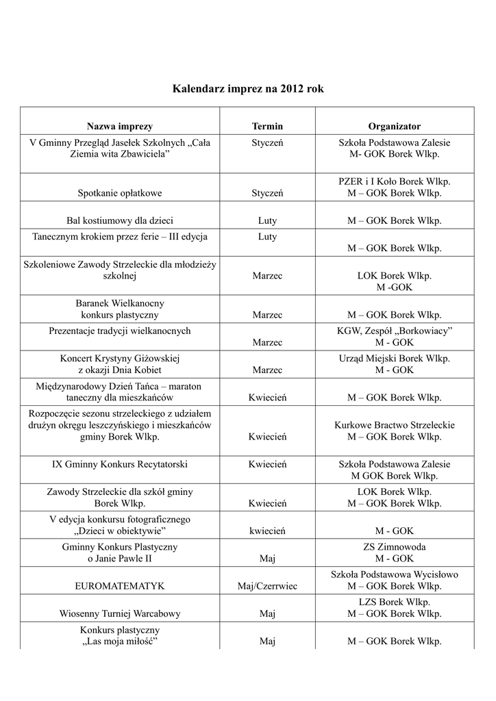 Kalendarz imprez na 2012 rok Nazwa imprezy Termin Organizator V Gminny Przegląd Jasełek Szkolnych „Cała Ziemia wita Zbawiciela” Styczeń Szkoła Podstawowa Zalesie M- GOK Borek Wlkp. Spotkanie opłatkowe Styczeń PZER i I Koło Borek Wlkp. M – GOK Borek Wlkp. Bal kostiumowy dla dzieci Luty M – GOK Borek Wlkp. Tanecznym krokiem przez ferie – III edycja Luty M – GOK Borek Wlkp. Szkoleniowe Zawody Strzeleckie dla młodzieży szkolnej Marzec LOK Borek Wlkp. M -GOK Baranek Wielkanocny konkurs plastyczny Marzec M – GOK Borek Wlkp. Marzec KGW, Zespół „Borkowiacy” M - GOK Koncert Krystyny Giżowskiej z okazji Dnia Kobiet Marzec Urząd Miejski Borek Wlkp. M - GOK Międzynarodowy Dzień Tańca – maraton taneczny dla mieszkańców Kwiecień M – GOK Borek Wlkp. Rozpoczęcie sezonu strzeleckiego z udziałem drużyn okręgu leszczyńskiego i mieszkańców gminy Borek Wlkp. Kwiecień Kurkowe Bractwo Strzeleckie M – GOK Borek Wlkp. IX Gminny Konkurs Recytatorski Kwiecień Prezentacje tradycji wielkanocnych Szkoła Podstawowa Zalesie M GOK Borek Wlkp. Zawody Strzeleckie dla szkół gminy Borek Wlkp. Kwiecień LOK Borek Wlkp. M – GOK Borek Wlkp. V edycja konkursu fotograficznego „Dzieci w obiektywie” kwiecień M - GOK Gminny Konkurs Plastyczny o Janie Pawle II Maj ZS Zimnowoda M - GOK Maj/Czerrwiec Szkoła Podstawowa Wycisłowo M – GOK Borek Wlkp. Wiosenny Turniej Warcabowy Maj LZS Borek Wlkp. M – GOK Borek Wlkp. Konkurs plastyczny „Las moja miłość” Maj M – GOK Borek Wlkp. EUROMATEMATYK Konkurs fotograficzny „Las moja miłość” Maj M- GOK Borek Wlkp. Dni Borku Wlkp. udział KBS Borek Wlkp. Czerwiec Kurkowe Bractwo Strzeleckie M -GOK Borek Wlkp. Gminny Konkurs Ortograficzny kl. I – III 15 Czerwiec Lot o Puchar Burmistrza Borku Wlkp. z okazji Dni Borku Wlkp. Strzelanie o Puchar Burmistrza Borku Wlkp. dla społeczeństwa Szkoła Podstawowa Wycisłowo M – GOK Borek Wlkp. Czerwiec PZHGP Borek Wlkp. M- GOK Borek Wlkp. Czerwiec LOK Borek Wlkp. M – GOK Borek Wlkp. Kurkowe Bractwo Strzeleckie XVII Europejskie spotkanie Strzelców Historycznych EGS z udziałem członków i ich rodzin 24 – 26.08. M – GOK Borek Wlkp. Mini-Obóz Wędrowny II turnusy Lipiec/sierpień M – GOK Borek Wlkp. Roztańczone lato – III edycja Lipiec M – GOK Borek Wlkp. Konkurs plastyczny Widokówka z gminy Borek Wlkp. Sierpień M – GOK Borek Wlkp. Prezentacja Wystaw Artystów o charakterze ponadgminnym i X Prezentacje Zespołów Ludowych i Kapel Południowo – Zachodniej Wielkopolski Zespół „Borkowiacy” sierpień M – GOK Borek Wlkp. II Otwarte Mistrzostwa Powiatu Gostyńskiego w warcabach 64-polowych Wrzesień LZS Borek Wlkp. M – GOK Borek Wlkp. Konkurs plastyczny „Jesienny bukiet” Wrzesień M – GOK Borek Wlkp. Konkurs rysunkowy ph. „Barwy jesieni” Wrzesień M – GOK Borek Wlkp. Gminny Konkurs Wiedzy Jan Paweł II Październik ZS Zimnowoda M – GOK Borek Wlkp. Gminny Konkurs Recytatorski Październik ZS Zimnowoda M – GOK Borek Wlkp. Obchody 30-tej rocznicy koła i Dzień Seniora Październik PZER i I Koło Borek Wlkp. M – GOK Borek Wlkp. Festiwal Piosenki Religijnej Borek Wlkp. 2012 Październik Drużynowe zawody strzeleckie z okazji Święta Niepodległości Listopad LOK Borek Wlkp. M – GOK Borek Wlkp. Listopad Klub Seniora M – GOK Borek Wlkp. Spoptkanie z okazji Dnia Seniora ZS Borek Wlkp. Szkoła Podstawowa Borek Wlkp. Parafia RzymskoKatolicka Listopad Chór „Jutrzenka” M – GOK Borek Wlkp. Przegląd Widowisk Jasełkowych wystawa ciast i plastyki obrzędowej Grudzień Zespół „Borkowiacy” M – GOK Borek Wlkp. Oddziałowa wystawa gołębi Grudzień PZHGP Koło Borek Wlkp. M – GOK Borek Wlkp. Wystawa gołębi z sekcją gołębi pocztowych Grudzień Klub Hodowców Gołębi Rasowych M – GOK Borek Wlkp. Konkurs plastyczny Ozdoba na drzwi – czyli wianek świąteczny Grudzień M – GOK Borek Wlkp. Kółko plastyczne Cały rok M – GOK Borek Wlkp. Ognisko taneczne Cały rok M – GOK Borek Wlkp. Jubileusz 120 – lecia chóru