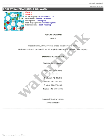 Informacje o produkcie Utworzono 08-03-2017 ROBERT KAUFMAN JINGLE BAŁWANY Cena : 9,90 zł Nr katalogowy : AAK-12405-277 Producent : Robert Kaufman Dostępność : Dostępny Stan magazynowy : bardzo wysoki Średnia ocena : brak recenzji ROBERT KAUFMAN er m ar k JINGLE Urocza tkanina, 100% wysokiej jakości bawełny. Gęsto tkana. Idealna na poduszki, patchworki, kocyki, artykuły dekoracyjne, zabawki i inne projekty. BAŁWANKI NA TURKUSIE TKANINA 100% bawełny Cena za 1 FQ (50x54) ************ at 1 sztuka 1 FQ (50x54) 2 sztuki 2 FQ (50x108) 3 sztuki 3 FQ (75x108) w 4 sztuki 4 FQ (100 x 108) ........................................................................................ Szerokość tkaniny 108 cm 100% BAWEŁNY Wygenerowano w programie www.oscGold.com