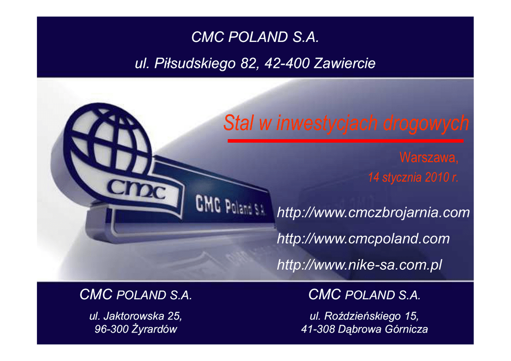 CMC POLAND S.A. ul. Piłsudskiego 82, 4242-400 Zawiercie Stal w inwestycjach drogowych Warszawa, 14 stycznia 2010 r. http://www.cmczbrojarnia.com http://www.cmcpoland.com http://www.nike-sa.com.pl CMC POLAND S.A. CMC POLAND S.A. ul. Jaktorowska 25, 96 96--300 śyrardów ul. Roździeńskiego 15, 41 41--308 Dąbrowa Górnicza Produkcja stali Huta CMC Zawiercie S.A. - łączna moc walcowni to 1,3 mln ton - aktualnie rozbudowa walcowni do zrównania z mocą stalowni do łącznej mocy 1,8 mln ton. - od 2012 roku CMC będzie posiadało 4 walcownie: obecna walcownia prętów, walcownia walcówki (głównie mesh quality), Morgan Block (walcówka jakościowa) New Flexible Section Mill Danielli Produkty Huty - półprodukty – kęsy, - walcówki Ŝebrowane i gładkie, - pręty zbrojeniowe, - pręty płaskie i kwadratowe, - pręty okrągłe gładkie Zbrojenia prefabrykowane Pręty proste cięte, Pręty cięte i gięte, Figury, Strzemiona, Spirale, Koła, Zakłady zbrojeniowe CMC Aktualnie posiadamy trzy lokalizacje w Polsce: - Zbrojarnia Zawiercie o mocy ok. 43 tys. ton/rok - Zbrojarnia śyrardów o mocy ok. 46 tys. ton/rok - Zakład Dąbrowa Górnicza o mocy: walcówki zimnowalcowane – ok. 180 tys ton/rok maty (siatki) zbrojeniowe – ok. 60 tys. ton/rok Ponadto: - Zbrojarnia w Rosslau k/Dessau o mocy ok. 90 tys/ton W planach uruchomienie kolejnych min. 5 nowych zakładów w Polsce - Zbrojarni oraz rozbudowę Zakładu Produkcji Wyrobów Zimnowalcowanych. Zbrojarnia Zawiercie Zbrojarnia śyrardów Identyfikacja zbrojeń Do kaŜdej dostawy załączane są dokumenty jakościowe: - wykazy zbrojenia z identyfikacją dokumentacji; - atesty hutnicze na kaŜdą średnicę dostawy; - deklaracja zgodności dostawy. Zakład Dąbrowa Górnicza Produkty CD & Mesh Dąbrowa Górnicza • Walcówki zimnowalcowane - stosowanie dla produkcji zbrojeń prefabrykowanych – strzemiona, figury z cięŜkim gięciem, • Maty (siatki zbrojeniowe) - maty w formatach standardowych, - maty wykonywane na wymiar, - maty cięte i gięte na wymiar. Główne zastosowanie dla kap chodnikowych w obiektach drogowych, - cynkowanie mat zbrojeniowych wymóg p.poŜ m.in. dla Tuneli Budownictwo infrastrukturalne • CMC Poland S.A. dostarcza zbrojenia prefabrykowane na Inwestycje drogowe na terenie całej Polski o łącznej ilości ok. 60 tys. ton zbrojeń prefabrykowanych. • Aktualnie obsługujemy ok. 30 budów drogowo mostowych m.in.: - A4/A2 Węzeł Sośnica; - Tunel w ciągu S69 Laliki - Szare; - A1 Czerniewice – Toruń; - S7 Trasa Nowohucka w Krakowie; - Most Północny w Warszawie. Budowa Autostrady A1 Nowe Marzy - Czerniewice Tunel drogowy w ciągu S69 Laliki - Szare Szkielety pali fundamentowych • Stosowane jako zbrojenie podpór mostowych, • Dostarczane na budowę w scalonym szkielecie, • Zbrojenie wykonane z prętów ciętych, spirala (oplot zewnętrzny) wykonany z walcówki w kręgu. Zastosowanie szkieletów pali Kontakt handlowy CMC Poland S.A. Marcin Kulesza Europe Vice President Fab tel. +48 695 105 209 Tomasz Gembarowski Dyrektor ds. SprzedaŜy tel. +48 695 102 657 @ [email protected] @ [email protected] Julian Kołecki Regionalny Kierownik SprzedaŜy tel. +48 693 226 236 @ [email protected] Przemysław Grabowski Z-ca Dyrektora ds. SprzedaŜy tel. +48 695 409 677 @ [email protected] Ryszard Wnuk Dyrektor SprzedaŜy Walcówki i siatki tel. +48 693 539 435 @ [email protected] Grzegorz Muskalski Specjalista ds. SprzedaŜy tel. +48 723 188 781 @ [email protected] Zbrojarnia Zawiercie ul. Piłsudskiego 82, 4242-400 Zawiercie Zbrojarnia śyrardów ul. Jaktorowska 25, 9696-300 śyrardów Zakład Dąbrowa Górnicza ul. Roździeńskiego 15, 4141-308 Dąbrowa Górnicza