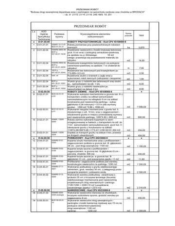 PRZEDMIAR ROBÓT "Budowa drogi wewnętrznej dojazdowej wraz z parkingiem na samochody osobowe oraz chodnika w BRODACH" - dz. nr 21/15; 21/14; 21/16; 248; 48/9; 19; 251 PRZEDMIAR ROBÓT L.p. x 1 2 3 4 5 6 7 x 8 9 10 11 x 12 13 14 15 16 17 x 18 19 KOD Nazwa Podstawa Wyszczególnienie elementów Ogólnej jednostki wyceny rozliczeniowych Specyfikacji Technicznej D-01.00.00 ROBOTY PRZYGOTOWAWCZE - Kod CPV 45100000-8 D-01.01.01 KNNR1 0111-01 Roboty pomiarowe przy powierzchniowych robotach BCD 01.01.21 ziemnych ha D-01.02.04 KNNR6 0805-08 Rozebranie nawierzchni z kostki brukowej betonowej BCP p. grub. 8 cm wraz z podsypką cementowo-piaskową 451.02.01.15/35 na zjeździe na ul. Kilińskiego: 16 m2 uwaga: przewiduje się pozostawienie materiału do odzysku m2 D-01.02.04 KNNR6 0806-02 Rozebranie krawężników betonowych na podsypce BCP p. cementowo-piaskowej na zjeździe: 7 m (materiał do 451.02.01.25/04 m odzysku) BCP p. Rozebranie ław betonowych pod krawężnikami jw. D-01.02.04 451.02.01.25/40 7*0,065= 0,5 m3 m3 Rozebranie studni o ścianach z cegły wraz z D-01.02.04 kalk. wł. wykonaniem robót ziemnych (odkopanie i zasypanie) szt. Wywóz gruzu z rozbiórki ław betonowych oraz studni D-01.02.04 BCP p. 451.35.01.10/01 jw., samochodami na odl. 1 km m3 Wywóz gruzu z rozbiórki nawierzchni jw. D-01.02.04 BCP p. 451.35.01.10/02 samochodami na dalsze 4 km m3 D-02.00.00 ROBOTY ZIEMNE - Kod CPV 45100000-8 Wykonanie wykopów mechanicznie w gruncie kat. III z D-02.01.01 BCD 02.01.01 p.53 transportem urobku na odkład samochodami samowyładowczymi na odległość 6 km na odkład: korytowanie pod nawierzchnię parkingu - wykop głębokości 0,38 m(koryto) + 0,5 m (dla wymiany m3 gruntu) 1200 m2 *0,88 = 1056 m3 Wykonanie nasypów mechanicznie z gruntu kat. II, D-02.03.01 BCD 02.03.01 p.41 dowiezionego z odl. 10 km, wraz z zagęszczeniem wbudowanie gruntu w miejscu przewidzianej wymiany pod nawierzchnie parkingu: 1200*0,50 = 600 m3 m3 Roboty ziemne wykonane koparkami w ziemi D-02.01.01 KNNR 1 02050400 zmagazynowanej w hałdach, z transportem na odl. do 1 km samochodami samowyładowczymi, grunt kat. II odwiezienie gruntu z korytowania na odkład: 1100*0,38+400*0,08 +11*0,31= 418+32+4= 454 m3 m3 Dopłata za transport gruntu na dalsze 4 km, przewóz D-02.01.01 KNNR 1 02080200 po drogach utwardzonych m3 D-04.00.00 PODBUDOWY - Kod CPV 45233000-9 x Kopanie koryta mechanicznie wraz z profilowaniem i D-04.01.01 KNNR6 01010300 zagęszczeniem podłoża w gruncie kat. III, głębokości 38 cm - pod drogi wewnętrzne: 1100 m2 m2 Kopanie koryta ręcznie z profilowaniem i D-04.01.01 KNNR6 01020100 zagęszczeniem, w gruncie kat. III głębokości 8 cm pod proj. chodniki: 400 m2 m2 Kopanie koryta ręcznie jw. w gruncie kat. III D-04.01.01 KNNR6 01020100 głębokości 31 cm - pod poszerzenie zjazdu: 11 m2 m2 Profilowanie i zagęszczenie podłoża pod warstwy D-04.01.01 KNNR6 01030300 konstrukcyjne nawierzchni na parkingu: 1200 m2 m2 Wykonanie podbudowy z gruntu stabilizowanego D-04.05.01 KNNR6 01110201 cementem, grub. warstwy 30 cm, z pielęgnacją przez posypanie piaskiem i polewanie wodą. m2 Wykonanie warstwy podbudowy zasadniczej o D-04.04.02 KNNR6 01130200 grubości 20 cm z kruszywa łamanego (tłucznia) stabilizowanego mechanicznie pod nawierzchnię projektowanych dróg wewnętrznych i parkingu: 1100+1200 = 2300+10 m2 (uzupełnienie poszerzanego zjazdu) = 2310 m2 m2 NAWIERZCHNIE - Kod CPV 45233000-9 D-05.00.00 x Wykonanie nawierzchni żwirowej na chodnikach, D-05.01.03 KNNR6 02020300 analogia kruszywo rozścielane ręcznie, grubość warstwy po m2 zagęszczeniu 8 cm D-05.03.01 BCD 05.03.01. Wykonanie nawierzchni dróg wewnętrznych i 14 parkingów z kostki kamiennej rzędowej wys.15 cm na podsypce cementowo-piaskowej: drogi wewnętrzne: 1100 m2 m2 parkingi: 1200 m2 Ilość 0,870 16,00 7,00 0,50 1,00 8,00 8,00 x 1 056,00 600,00 454,00 454,00 x 1 100,00 400,00 11,00 1 200,00 2 300,00 2 310,00 x 400,00 2 300,00 PRZEDMIAR ROBÓT "Budowa drogi wewnętrznej dojazdowej wraz z parkingiem na samochody osobowe oraz chodnika w BRODACH" - dz. nr 21/15; 21/14; 21/16; 248; 48/9; 19; 251 20 D-05.03.23a KNNR6 05020300 21 D-05.03.23a KNNR6 0502- 0300 analogia x D-06.00.00 22 D-06.01.01 KNNR1 05030500 23 D-06.01.01 KNNR1 05070100 x D-08.00.00 24 D-08.01.01b KNNR6 04030301 BCD 08.01.01/02 25 D-08.01.01b KNNR6 04030401 BCD 08.01.01/02 analogia 26 D-08.01.01b jw. analogia 27 D-08.03.01 28 KNNR6 04040100 Wykonanie nawierzchni z kostki brukowej betonowej grub. 8 cm - szarej (nowy materiał) na podsypce cementowo-piaskowej, spoiny wypełnione piaskiem: początek chodnika: 4 m2 uzupełnienie zjazdu: 11 m2 Wykonanie nawierzchni z kostki brukowej betonowej grub. 8 cm - materiał z odzysku, na podsypce cementowo-piaskowej, spoiny wypełnione piaskiem, na zjeździe: 16 m2 ROBOTY WYKOŃCZENIOWE - Kod CPV 45100000-8 Plantowanie (obrobienie na czysto) powierzchni zieleni w gruncie kat. III, powierzchnia jn. Humusowanie w-wą grub. 5 cm i obsianie trawą projektowanych powierzchni zieleni ELEMENTY ULIC - Kod CPV 45233100-0 Ustawienie krawężników betonowych o wym. 15x30 cm - stojących, wtopionych, na podsypce cementowopiaskowej i ławie z oporem, z betonu C12/15 (B15) Ustawienie krawężników betonowych o wym. 15x22 cm - najazdowych (parking), na podsypce cementowopiaskowej i ławie z oporem, z betonu C12/15 200+5 (uzupełnienie na zjeździe) Ustawienie krawężników jw. - na zjeździe, krawężniki z odzysku Ustawienie obrzeży betonowych przy proj. chodnikach o wymiarach 6x20 cm na podsypce piaskowej spoiny wypełnione zaprawą cementową Opracowanie mapy powykonawczej m2 15,00 m2 16,00 m2 4 800,00 m2 x 4 800,00 x m 530,00 m 205,00 m 7,00 m kpl. 350,00 1,00