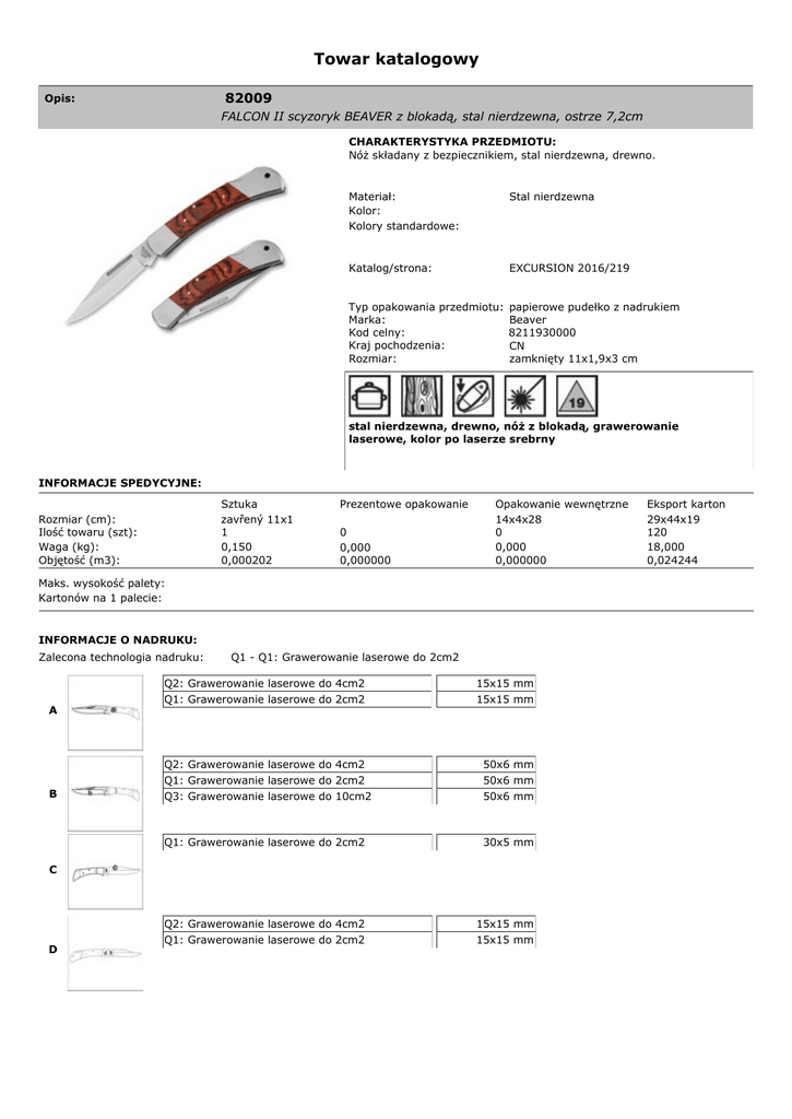 Towar katalogowy 82009 Opis: FALCON II scyzoryk BEAVER z blokadą, stal nierdzewna, ostrze 7,2cm CHARAKTERYSTYKA PRZEDMIOTU: Nóż składany z bezpiecznikiem, stal nierdzewna, drewno. Materiał: Kolor: Kolory standardowe: Stal nierdzewna Katalog/strona: EXCURSION 2016/219 Typ opakowania przedmiotu: Marka: Kod celny: Kraj pochodzenia: Rozmiar: papierowe pudełko z nadrukiem Beaver 8211930000 CN zamknięty 11x1,9x3 cm stal nierdzewna, drewno, nóż z blokadą, grawerowanie laserowe, kolor po laserze srebrny INFORMACJE SPEDYCYJNE: Sztuka zavřený 11x1 1 0,150 0,000202 Rozmiar (cm): Ilość towaru (szt): Waga (kg): Objętość (m3): Prezentowe opakowanie 0 0,000 0,000000 Opakowanie wewnętrzne 14x4x28 0 0,000 0,000000 Maks. wysokość palety: Kartonów na 1 palecie: INFORMACJE O NADRUKU: Zalecona technologia nadruku: Q1 - Q1: Grawerowanie laserowe do 2cm2 Q2: Grawerowanie laserowe do 4cm2 A B Q1: Grawerowanie laserowe do 2cm2 15x15 mm 15x15 mm Q2: Grawerowanie laserowe do 4cm2 Q1: Grawerowanie laserowe do 2cm2 Q3: Grawerowanie laserowe do 10cm2 50x6 mm 50x6 mm 50x6 mm Q1: Grawerowanie laserowe do 2cm2 30x5 mm Q2: Grawerowanie laserowe do 4cm2 Q1: Grawerowanie laserowe do 2cm2 15x15 mm 15x15 mm C D Eksport karton 29x44x19 120 18,000 0,024244 Towar katalogowy E