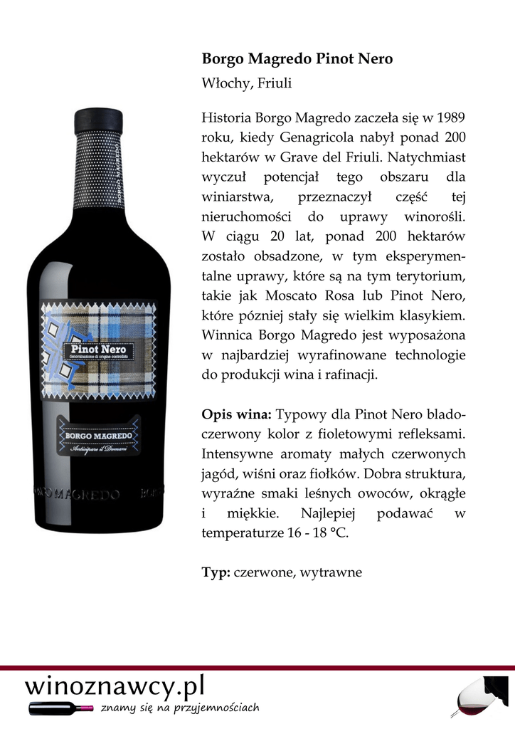Borgo Magredo Pinot Nero Włochy, Friuli Historia Borgo Magredo zaczeła się w 1989 roku, kiedy Genagricola nabył ponad 200 hektarów w Grave del Friuli. Natychmiast wyczuł potencjał tego obszaru dla winiarstwa, przeznaczył część tej nieruchomości do uprawy winorośli. W ciągu 20 lat, ponad 200 hektarów zostało obsadzone, w tym eksperymentalne uprawy, które są na tym terytorium, takie jak Moscato Rosa lub Pinot Nero, które pózniej stały się wielkim klasykiem. Winnica Borgo Magredo jest wyposażona w najbardziej wyrafinowane technologie do produkcji wina i rafinacji. Opis wina: Typowy dla Pinot Nero bladoczerwony kolor z fioletowymi refleksami. Intensywne aromaty małych czerwonych jagód, wiśni oraz fiołków. Dobra struktura, wyraźne smaki leśnych owoców, okrągłe i miękkie. Najlepiej podawać w temperaturze 16 - 18 °C. Typ: czerwone, wytrawne