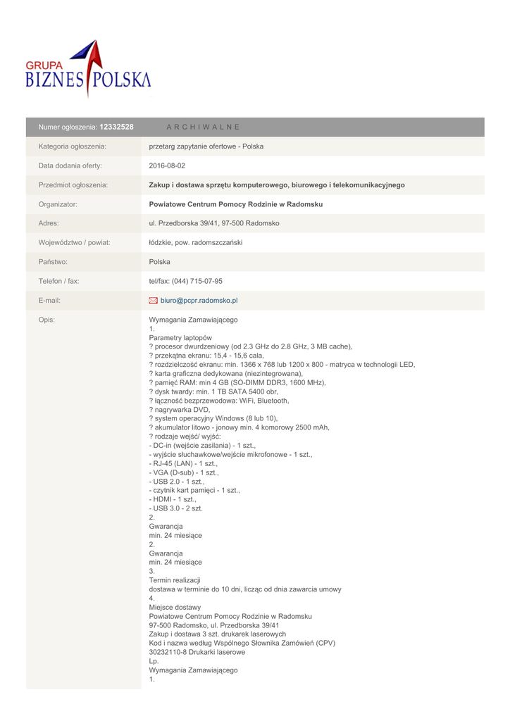 Numer ogłoszenia: 12332528 A RCHI WA L N E Kategoria ogłoszenia: przetarg zapytanie ofertowe - Polska Data dodania oferty: 2016-08-02 Przedmiot ogłoszenia: Zakup i dostawa sprzętu komputerowego, biurowego i telekomunikacyjnego Organizator: Powiatowe Centrum Pomocy Rodzinie w Radomsku Adres: ul. Przedborska 39/41, 97-500 Radomsko Województwo / powiat: łódzkie, pow. radomszczański Państwo: Polska Telefon / fax: tel/fax: (044) 715-07-95 E-mail: Opis: [email protected] Wymagania Zamawiającego 1. Parametry laptopów ? procesor dwurdzeniowy (od 2.3 GHz do 2.8 GHz, 3 MB cache), ? przekątna ekranu: 15,4 - 15,6 cala, ? rozdzielczość ekranu: min. 1366 x 768 lub 1200 x 800 - matryca w technologii LED, ? karta graficzna dedykowana (niezintegrowana), ? pamięć RAM: min 4 GB (SO-DIMM DDR3, 1600 MHz), ? dysk twardy: min. 1 TB SATA 5400 obr, ? łączność bezprzewodowa: WiFi, Bluetooth, ? nagrywarka DVD, ? system operacyjny Windows (8 lub 10), ? akumulator litowo - jonowy min. 4 komorowy 2500 mAh, ? rodzaje wejść/ wyjść: - DC-in (wejście zasilania) - 1 szt., - wyjście słuchawkowe/wejście mikrofonowe - 1 szt., - RJ-45 (LAN) - 1 szt., - VGA (D-sub) - 1 szt., - USB 2.0 - 1 szt., - czytnik kart pamięci - 1 szt., - HDMI - 1 szt., - USB 3.0 - 2 szt. 2. Gwarancja min. 24 miesiące 2. Gwarancja min. 24 miesiące 3. Termin realizacji dostawa w terminie do 10 dni, licząc od dnia zawarcia umowy 4. Miejsce dostawy Powiatowe Centrum Pomocy Rodzinie w Radomsku 97-500 Radomsko, ul. Przedborska 39/41 Zakup i dostawa 3 szt. drukarek laserowych Kod i nazwa według Wspólnego Słownika Zamówień (CPV) 30232110-8 Drukarki laserowe Lp. Wymagania Zamawiającego 1. Parametry drukarek ? automatyczny dupleks, ? czas wydruku 1 strony - min. 9 sek., ? eksploatacja startowa (w zestawie), ? eksploatacja zgodnie z normą ISO/IEC 19752, ? miesięczne obciążenie: min. 10.000 str., ? procesor: min. 266 MHz, ? interfejs standardowy: USB 2.0, 10/100 Ethernet Base TX, ? podajnik papieru: 250 arkuszy, ? podajnik wielofunkcyjny: 1 arkusz, ? poziom hałasu: drukowania 50 dB, ? prędkość druku: mono 30 str./min., ? pamięć (RAM): stardardowa 32MB, ? systemy operacyjne: Windows XP Home Edition, XP Professional Edition, XP Professional x64 Edition, Server 2003, Server 2003 x64 Edition, Vista, Server 2008, Server 2008 R2, 7, 8, 8.1, Server 2012, Server 2012 R2, Linux. 2. Gwarancja min. 24 miesiące 3. Termin realizacji dostawa w terminie do 10 dni, licząc od dnia zawarcia umowy 4. Miejsce dostawy Powiatowe Centrum Pomocy Rodzinie w Radomsku 97-500 Radomsko, ul. Przedborska 39/41 Zakup i dostawa 2 szt. niszczarek Kod i nazwa według Wspólnego Słownika Zamówień (CPV) 30191400-8 Niszczarki Lp. Wymagania Zamawiającego 1. Parametry drukarek ? rodzaj cięcia: ścinki, ? szerokość szczeliny wejściowej: min. 220 mm, ? automatyczny start / stop, ? mechanizm odporny na zszywki, ? zabezpieczenie przed przegrzaniem, ? funkcja cofania, ? objętość kosza: min. 16 litrów, ? ilość niszczonych arkuszy A4 80g: min. 8, ? moc: min. 200 W, ? poziom bezpieczeństwa - DIN 3 2. Gwarancja min. 24 miesiące 3. Gwarancja na noże min. 24 miesiące 4. Termin realizacji dostawa w terminie do 10 dni, licząc od dnia zawarcia umowy 5. Miejsce dostawy Powiatowe Centrum Pomocy Rodzinie w Radomsku 97-500 Radomsko, ul. Przedborska 39/41 Zakup i dostawa 3 szt. telefonów (aparatów) komórkowych Kod i nazwa według Wspólnego Słownika Zamówień (CPV) 32250000-0 Telefony komórkowe Lp. Wymagania Zamawiającego 1. Parametry telefonów (aparatów) komórkowych ? rodzaj klawiatury: klasyczna, ? typ budowy: klasyczny, ? pamięć RAM: min.16 MB, ? Złącza: - gniazdo kart SIM - min.1 szt. - czytnik kart pamięci - 1 szt. - micro USB - 1 szt. - wyjście słuchawkowe/głośnikowe - 1 szt., ? przekątna ekranu: min. 2,4 cala, ? technologia wyświetlacza: kolorowy, LCD, ? rozdzielczość ekranu: min. 240x320, ? technologia baterii: Li-Ion, ? pojemność baterii: min. 1000 mAh, ? wysokość: max. 120 mm, ? szerokość: max. 60 mm, ? kolor obudowy: czarny. 2. Gwarancja min.24 miesiące 3. Termin realizacji dostawa w terminie do 10 dni, licząc od dnia zawarcia umowy 4. Miejsce dostawy Powiatowe Centrum Pomocy Rodzinie w Radomsku 97-500 Radomsko, ul. Przedborska 39/41 Zakup i dostawa 1 szt. telefonu (aparatu) stacjonarnego Kod i nazwa według Wspólnego Słownika Zamówień (CPV) 32550000-3 Sprzęt telefoniczny Lp. Wymagania Zamawiającego 1. Parametry telefonu (aparatu) stacjonarnego ? Rodzaj telefonu: przewodowy, ? Wybieranie połączeń: tonowe, ? Wyświetlacz: LCD, ? Funkcje: - pamięć połączeń wychodzących i przychodzących - prezentacja numeru rozmówcy - powtarzanie wybranego numeru (Redial) - szybkie wybieranie numeru - funkcja głośnomówiąca ? Kolor: Czarny. 2. Gwarancja min. 24 miesiące 3. Termin realizacji dostawa w terminie do 10 dni, licząc od dnia zawarcia umowy 4. Miejsce dostawy Powiatowe Centrum Pomocy Rodzinie w Radomsku 97-500 Radomsko, ul. Przedborska 39/41 Miejsce i termin składania ofert: Oferty należy składać do dnia 10.08.2016 r. do godz. 15.00 na adres: Powiatowe Centrum Pomocy Rodzinie w Radomsku 97-500 Radomsko, ul. Przedborska 39/41 lub na adres e-mail: [email protected] Termin składania: 2016-08-10 Kod CPV: 30213100-6, 30232110-8, 30191400-8, 32250000-0, 32550000-3 Numer dokumentu: OK.2520.77.2016 Źródło: Internet i własne Załączniki: ZIP załącznik