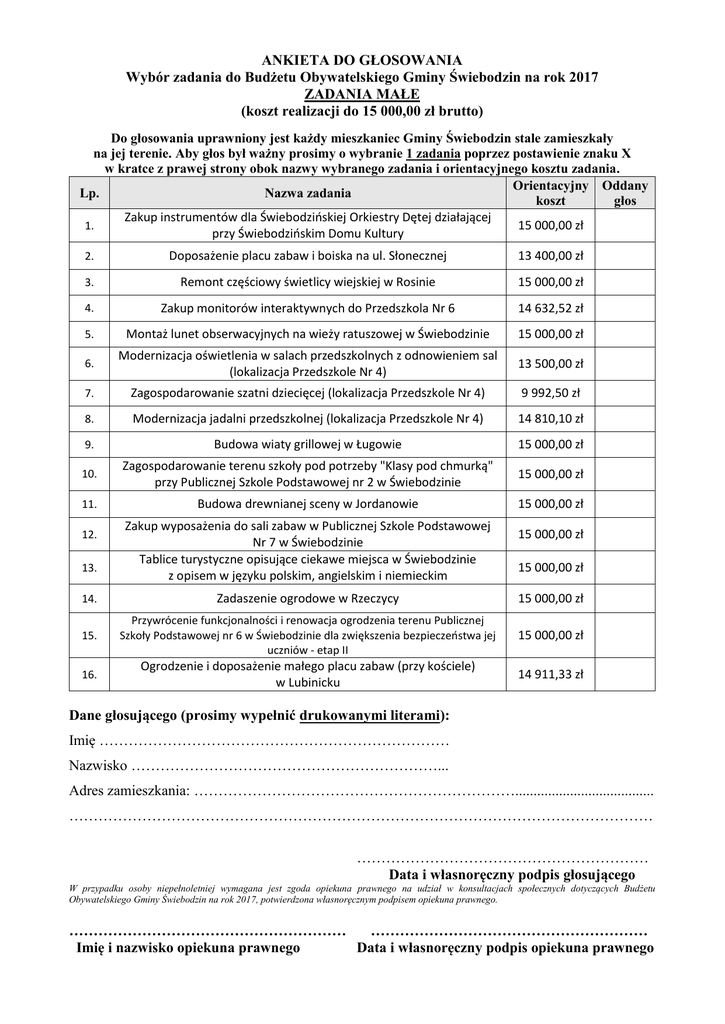 ANKIETA DO GŁOSOWANIA Wybór zadania do Budżetu Obywatelskiego Gminy Świebodzin na rok 2017 ZADANIA MAŁE (koszt realizacji do 15 000,00 zł brutto) Do głosowania uprawniony jest każdy mieszkaniec Gminy Świebodzin stale zamieszkały na jej terenie. Aby głos był ważny prosimy o wybranie 1 zadania poprzez postawienie znaku X w kratce z prawej strony obok nazwy wybranego zadania i orientacyjnego kosztu zadania. Orientacyjny Oddany Lp. Nazwa zadania koszt głos Zakup instrumentów dla Świebodzińskiej Orkiestry Dętej działającej 1. 15 000,00 zł przy Świebodzińskim Domu Kultury 2. Doposażenie placu zabaw i boiska na ul. Słonecznej 13 400,00 zł 3. Remont częściowy świetlicy wiejskiej w Rosinie 15 000,00 zł 4. Zakup monitorów interaktywnych do Przedszkola Nr 6 14 632,52 zł 5. Montaż lunet obserwacyjnych na wieży ratuszowej w Świebodzinie 15 000,00 zł 6. Modernizacja oświetlenia w salach przedszkolnych z odnowieniem sal (lokalizacja Przedszkole Nr 4) 13 500,00 zł 7. Zagospodarowanie szatni dziecięcej (lokalizacja Przedszkole Nr 4) 9 992,50 zł 8. Modernizacja jadalni przedszkolnej (lokalizacja Przedszkole Nr 4) 14 810,10 zł 9. Budowa wiaty grillowej w Ługowie 15 000,00 zł 10. Zagospodarowanie terenu szkoły pod potrzeby "Klasy pod chmurką" przy Publicznej Szkole Podstawowej nr 2 w Świebodzinie 15 000,00 zł 11. Budowa drewnianej sceny w Jordanowie 15 000,00 zł 12. 13. Zakup wyposażenia do sali zabaw w Publicznej Szkole Podstawowej Nr 7 w Świebodzinie Tablice turystyczne opisujące ciekawe miejsca w Świebodzinie z opisem w języku polskim, angielskim i niemieckim 15 000,00 zł 15 000,00 zł 14. Zadaszenie ogrodowe w Rzeczycy 15 000,00 zł 15. Przywrócenie funkcjonalności i renowacja ogrodzenia terenu Publicznej Szkoły Podstawowej nr 6 w Świebodzinie dla zwiększenia bezpieczeństwa jej uczniów - etap II 15 000,00 zł 16. Ogrodzenie i doposażenie małego placu zabaw (przy kościele) w Lubinicku 14 911,33 zł Dane głosującego (prosimy wypełnić drukowanymi literami): Imię ……………………………………………………………… Nazwisko ………………………………………………………... Adres zamieszkania: …………………………………………………………...................................... ………………………………………………………………………………………………………… …………………………………………………… Data i własnoręczny podpis głosującego W przypadku osoby niepełnoletniej wymagana jest zgoda opiekuna prawnego na udział w konsultacjach społecznych dotyczących Budżetu Obywatelskiego Gminy Świebodzin na rok 2017, potwierdzona własnoręcznym podpisem opiekuna prawnego. ………………………………………………… ………………………………………………… Imię i nazwisko opiekuna prawnego Data i własnoręczny podpis opiekuna prawnego