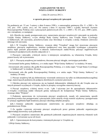 ZARZĄDZENIE NR 38/12 WÓJTA GMINY SUBKOWY z dnia 26 czerwca 2012 r. w sprawie pieczęci urzędowych i pieczątek Na podstawie art. 33 ust. 3 ustawy z dnia 8 marca 1990 r. o samorządzie gminnym (Dz. U. z 2001 r. Nr 142, poz. 1591 z późn. zm.), art. 16c ustawy z dnia 31 stycznia 1980 r. o godle, barwach i hymnie Rzeczypospolitej Polskiej oraz o pieczęciach państwowych (Dz. U. z 2005 r. Nr 235, poz. 2000 z późn. zm.) zarządzam, co następuje: § 1. Określa się zasady postępowania przy zamawianiu pieczęci urzędowych i pieczątek na potrzeby Urzędu Gminy Subkowy, w tym obsługi Rady Gminy Subkowy oraz Urzędu Stanu Cywilnego w Subkowach, ich używania, przechowywania oraz likwidacji w związku z utratą i brakiem celowości dalszego ich używania. § 2. 1. W Urzędzie Gminy Subkowy, zwanym dalej "Urzędem" mogą być stosowane pieczęcie urzędowe, pieczęcie nagłówkowe, imienne (podpisowe) oraz inne pieczątki wynikające z przepisów prawa bądź potrzeb pracowników w zakresie realizowanych zadań.Wzory pieczęci nagłówkowych i imiennych (podpisowych) określa załącznik nr 1. 2. Pieczęcie i pieczątki, o których mowa w niniejszym zarządzeniu, są własnością Urzędu, który ponosi koszty ich wytworzenia. § 3. 1. Pieczęcią urzędową jest metalowa, tłoczona pieczęć okrągła, zawierająca pośrodku: 1)wizerunek herbu gminy Subkowy, a w otoku napis "Wójt Gminy Subkowy" (o średnicy 36 mm), 2)wizerunek orła ustalony dla godła Rzeczpospolitej Polskiej, a w otoku napis "Urząd Stanu Cywilnego w Subkowach" (o średnicy 36 mm), 3)wizerunek orła dla godła Rzeczpospolitej Polskiej, a w otoku napis "Wójt Gminy Subkowy" (o średnicy 20 mm). 2. Pieczęć urzędową lub jej elektroniczny wizerunek umieszcza się tylko na dokumentachszczególnej wagi, stanowiących podstawę do podjęcia określonych czynności prawnych. 3. Odcisku pieczęci nie umieszcza się na kopiach dokumentów składanych do akt Urzędu oraz na innych pismach wysyłanych z Urzędu, chyba że przepisy szczególne stanowią inaczej. 4. Pieczęć urzędowa, o której mowa w ust. 1 pkt 1 używana jest do sporządzania dokumentów w związku z realizacją zadań własnych gminy należących do kompetencji Wójta Gminy Subkowy, zwanego dalej "Wójtem". 5. Podmioty uprawnione do wytwarzania pieczęci urzędowych, zasady ich zamawiania, sposób przechowywania oraz postępowania z pieczęciami, które utraciły swoją wartość użytkową i postępowania w sytuacji zagubienia bądź kradzieży pieczęci określają odrębne przepisy. § 4. 1. Gminne jednostki pośrednictwem Wójta. organizacyjne zamówienia na pieczęcie urzędowe składają za 2. Za zgodne z prawem używanie pieczęci urzędowych przez gminne jednostki organizacyjne odpowiadają kierownicy tych jednostek. 3. Pieczęcie urzędowe zamawiane dla gminnych jednostek organizacyjnych stanowią własność tych jednostek i wytwarzane są na ich koszt. § 5. 1. Uprawnionymi do korzystania z imiennych pieczęci w Urzędzie są: 1)Wójt Gminy Subkowy, ————————————————————————————————————————————————————————— Id: AA12F872-B30D-4CF3-9DF2-4B5DD6D4206F. Podpisany Strona 1 2)Przewodniczący Rady Gminy i Wiceprzewodniczący Rady Gminy, 3)Sekretarz Gminy, 4)Skarbnik Gminy, 5)kierownicy referatów, 6)Zastępca Kierownika Urzędu Stanu Cywilnego, 7)inni pracownicy, których zakres powierzonych zadań i czynności uzasadnia posługiwanie się taką pieczątką. 2. Pieczęcie imienne "z up. Wójta" mogą posiadać i posługiwać się nimi pracownicy mający indywidualne pisemne upoważnienia Wójta. 3. Pieczęcie imienne (podpisowe) mogą zawierać przy nazwisku pracownika dodatkowo tytuł naukowy użytkownika. § 6. 1. W Urzędzie znajduje się tłok pieczętny do wykonywania odcisków tłoczonych w papierze. Odcisk pieczęci o średnicy 38 mm zawiera pośrodku wizerunek herbu gminy Subkowy, a w otoku napis "Wójt Gminy Subkowy". 2. Odcisk stosuje się dla uwierzytelnienia szczególnie ważnych i uroczystych dokumentów wydawanych przez Wójta. § 7. 1. Wniosek o wykonanie pieczęci bądź pieczątki sporządza kierownik referatu lub pracownik na samodzielnym stanowisku na formularzu "Zapotrzebowanie na wykonanie pieczęci/pieczątki w Urzędzie Gminy Subkowy” stanowiącym załącznik Nr 2 do niniejszego zarządzenia. 2. Wniosek, o którym mowa w ust. 1 kierowany jest do Sekretarza Gminy. Wniosek wymaga potwierdzenia zgodności przez pracownika d/s organizacyjnych i kadr w zakresie: 1)posiadania przez pracownika udzielonegoupoważnienia Wójta, prawa do podpisywania dokumentów na podstawie 2)tytułu i stanowiska służbowego pracownika. 3. W przypadku pieczęci bądź pieczątek innych niż imienne, nagłówkowe oraz pieczęcie urzędowe, stwierdzenia poprawności ich treści pod względem formalnym i zgodności z przepisami prawa dokonuje kierownik referatu lub wnioskujący pracownik na stanowisku samodzielnym. § 8. 1. Sekretarz po sprawdzeniu treści pieczęci bądź pieczątki pod względem formalno-prawnym, zgodności układu (wzoru) pieczęci/pieczątki i jej treści z postanowieniami instrukcji kancelaryjnej, Regulaminu Organizacyjnego oraz niniejszego zarządzenia akceptuje wniosek i przekazuje pracownikowi prowadzącemu ewidencję w celu przygotowania zamówienia wykonania pieczęci bądź pieczątki. 2. Pracownik prowadzący ewidencję, o którym mowa w § 9 ust. 4 zobowiązany jest do zapewnienia jednolitości stosowanych czcionek i szaty graficznej pieczątek. § 9. 1. Tworzy się Ewidencję pieczęci i pieczątek w Urzędzie, zwaną dalej "Ewidencją", w której dokonuje się rejestracji pieczęci bądź pieczątek wykonanych zgodnie z wnioskiem, o którym mowa w § 7 ust. 1 oraz pieczęci, o których mowa § 4 ust. 1. 2. Ewidencję oznacza się symbolem klasyfikacyjnym zgodnie z jednolitym rzeczowym wykazem akt organów gminy,