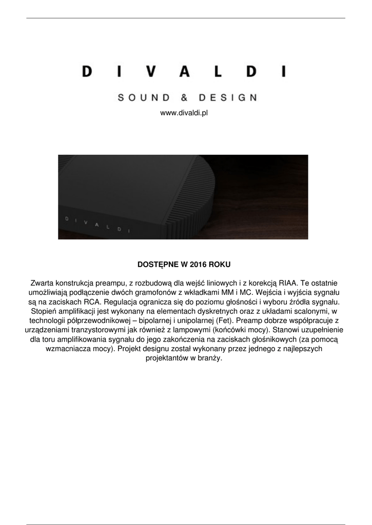 www.divaldi.pl DOSTĘPNE W 2016 ROKU Zwarta konstrukcja preampu, z rozbudową dla wejść liniowych i z korekcją RIAA. Te ostatnie umożliwiają podłączenie dwóch gramofonów z wkładkami MM i MC. Wejścia i wyjścia sygnału są na zaciskach RCA. Regulacja ogranicza się do poziomu głośności i wyboru źródła sygnału. Stopień amplifikacji jest wykonany na elementach dyskretnych oraz z układami scalonymi, w technologii półprzewodnikowej – bipolarnej i unipolarnej (Fet). Preamp dobrze współpracuje z urządzeniami tranzystorowymi jak również z lampowymi (końcówki mocy). Stanowi uzupełnienie dla toru amplifikowania sygnału do jego zakończenia na zaciskach głośnikowych (za pomocą wzmacniacza mocy). Projekt designu został wykonany przez jednego z najlepszych projektantów w branży. Powered by TCPDF (www.tcpdf.org)