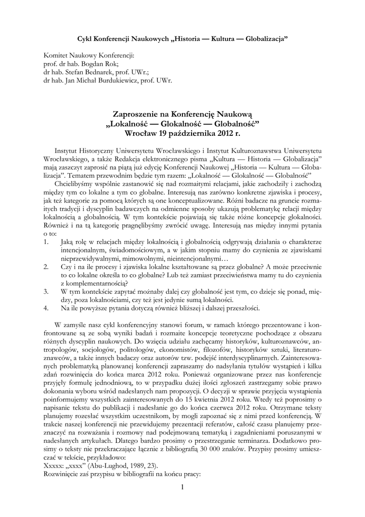 Cykl Konferencji Naukowych „Historia — Kultura — Globalizacja” Komitet Naukowy Konferencji: prof. dr hab. Bogdan Rok; dr hab. Stefan Bednarek, prof. UWr.; dr hab. Jan Michał Burdukiewicz, prof. UWr. Zaproszenie na Konferencję Naukową „Lokalność — Glokalność — Globalność” Wrocław 19 października 2012 r. Instytut Historyczny Uniwersytetu Wrocławskiego i Instytut Kulturoznawstwa Uniwersytetu Wrocławskiego, a także Redakcja elektronicznego pisma „Kultura — Historia — Globalizacja” mają zaszczyt zaprosić na piątą już edycję Konferencji Naukowej „Historia — Kultura — Globalizacja”. Tematem przewodnim będzie tym razem: „Lokalność — Glokalność — Globalność” Chcielibyśmy wspólnie zastanowić się nad rozmaitymi relacjami, jakie zachodziły i zachodzą między tym co lokalne a tym co globalne. Interesują nas zarówno konkretne zjawiska i procesy, jak też kategorie za pomocą których są one konceptualizowane. Różni badacze na gruncie rozmaitych tradycji i dyscyplin badawczych na odmienne sposoby ukazują problematykę relacji między lokalnością a globalnością. W tym kontekście pojawiają się także różne koncepcje glokalności. Również i na tą kategorię pragnęlibyśmy zwrócić uwagę. Interesują nas między innymi pytania o to: 1. Jaką rolę w relacjach między lokalnością i globalnością odgrywają działania o charakterze intencjonalnym, świadomościowym, a w jakim stopniu mamy do czynienia ze zjawiskami nieprzewidywalnymi, mimowolnymi, nieintencjonalnymi… 2. Czy i na ile procesy i zjawiska lokalne kształtowane są przez globalne? A może przeciwnie to co lokalne określa to co globalne? Lub też zamiast przeciwieństwa mamy tu do czynienia z komplementarnością? 3. W tym kontekście zapytać możnaby dalej czy globalność jest tym, co dzieje się ponad, między, poza lokalnościami, czy też jest jedynie sumą lokalności. 4. Na ile powyższe pytania dotyczą również bliższej i dalszej przeszłości. W zamyśle nasz cykl konferencyjny stanowi forum, w ramach którego prezentowane i konfrontowane są ze sobą wyniki badań i rozmaite koncepcje teoretyczne pochodzące z obszaru różnych dyscyplin naukowych. Do wzięcia udziału zachęcamy historyków, kulturoznawców, antropologów, socjologów, politologów, ekonomistów, filozofów, historyków sztuki, literaturoznawców, a także innych badaczy oraz autorów tzw. podejść interdyscyplinarnych. Zainteresowanych problematyką planowanej konferencji zapraszamy do nadsyłania tytułów wystąpień i kilku zdań rozwinięcia do końca marca 2012 roku. Ponieważ organizowane przez nas konferencje przyjęły formułę jednodniową, to w przypadku dużej ilości zgłoszeń zastrzegamy sobie prawo dokonania wyboru wśród nadesłanych nam propozycji. O decyzji w sprawie przyjęcia wystąpienia poinformujemy wszystkich zainteresowanych do 15 kwietnia 2012 roku. Wtedy też poprosimy o napisanie tekstu do publikacji i nadesłanie go do końca czerwca 2012 roku. Otrzymane teksty planujemy rozesłać wszystkim uczestnikom, by mogli zapoznać się z nimi przed konferencją. W trakcie naszej konferencji nie przewidujemy prezentacji referatów, całość czasu planujemy przeznaczyć na rozważania i rozmowy nad podejmowaną tematyką i zagadnieniami poruszanymi w nadesłanych artykułach. Dlatego bardzo prosimy o przestrzeganie terminarza. Dodatkowo prosimy o teksty nie przekraczające łącznie z bibliografią 30 000 znaków. Przypisy prosimy umieszczać w tekście, przykładowo: Xxxxx: „xxxx” (Abu-Lughod, 1989, 23). Rozwinięcie zaś przypisu w bibliografii na końcu pracy: 1 Abu-Lughod, Janet L.; 1989, Before European Hegemony. The World System A.D. 12501350, New York: Oxford University Press Publikację tekstów planujemy w wydawanym przez Uniwersytet Wrocławski piśmie internetowym „Kultura — Historia — Globalizacja” a następnie w postaci tradycyjnej „papierowej” w kolejnym tomie serii „Historia — Kultura — Globalizacja”. Opłata konferencyjna wynosi 150 PLN dla doktorantów i 300 PLN dla pracowników naukowych. Jednocześnie informujemy, że koszt dojazdu i ewentualnych noclegów ponoszą instytucje delegujące uczestników konferencji. Proponowany temat, streszczenie, krótką informację o autorze (stopień/tytuł naukowy, miejsce pracy) prosimy nadsyłać na adres: [email protected] Pozostający z wyrazami szacunku organizatorzy: dr Piotr Badyna (Inst. Historyczny UWr.) dr Piotr Jakub Fereński (Inst. Kulturoznawstwa UWr.) dr hab. Adam Nobis, prof. UWr. (Inst. Kulturoznawstwa UWr.) 2