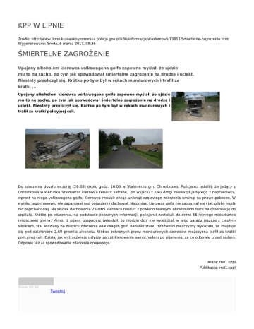 KPP W LIPNIE Źródło: http://www.lipno.kujawsko-pomorska.policja.gov.pl/k36/informacje/wiadomosci/13853,Smiertelne-zagrozenie.html Wygenerowano: Środa, 8 marca 2017, 08:36 ŚMIERTELNE ZAGROŻENIE Upojony alkoholem kierowca volkswagena golfa zapewne myślał, że ujdzie mu to na sucho, po tym jak spowodował śmiertelne zagrożenie na drodze i uciekł. Niestety przeliczył się. Krótko po tym był w rękach mundurowych i trafił za kratki ... Upojony alkoholem kierowca volkswagena golfa zapewne myślał, że ujdzie mu to na sucho, po tym jak spowodował śmiertelne zagrożenie na drodze i uciekł. Niestety przeliczył się. Krótko po tym był w rękach mundurowych i trafił za kratki policyjnej celi. Do zdarzenia doszło wczoraj (26.08) około godz. 16:00 w Stalmierzu gm. Chrostkowo. Policjanci ustalili, że jadący z Chrostkowa w kierunku Stalmierza kierowca renault safrane, po wyjściu z łuku drogi zauważył jadącego z naprzeciwka, wprost na niego volkswagena golfa. Kierowca renault chcąc uniknąć czołowego zderzenia umknął na prawe pobocze. W wyniku tego manewru nie zapanował nad pojazdem i dachował. Natomiast kierowca golfa nie zatrzymał się i jak gdyby nigdy nic pojechał dalej. Na skutek dachowania 25-letni kierowca renault z powierzchownymi obrażeniami trafił na obserwację do szpitala. Krótko po zdarzeniu, na podstawie zebranych informacji, policjanci zastukali do drzwi 56-letniego mieszkańca miejscowej gminy. Mimo, iż pijany gospodarz twierdził, że nigdzie dziś nie wyjeżdżał, w jego garażu jeszcze z ciepłym silnikiem, stał widziany na miejscu zdarzenia volkswagen golf. Badanie stanu trzeźwości mężczyzny wykazało, że znajduje się pod działaniem 2,60 promila alkoholu. Wobec zebranych przez mundurowych dowodów mężczyzna trafił za kratki policyjnej celi. Dzisiaj jak wytrzeźwieje usłyszy zarzut kierowania samochodem po pijanemu, za co odpowie przed sądem, Odpowie też za spowodowanie zdarzenia drogowego. Autor: red1.kppl Publikacja: red1.kppl Ocena: 0/5 (0) Tweetnij