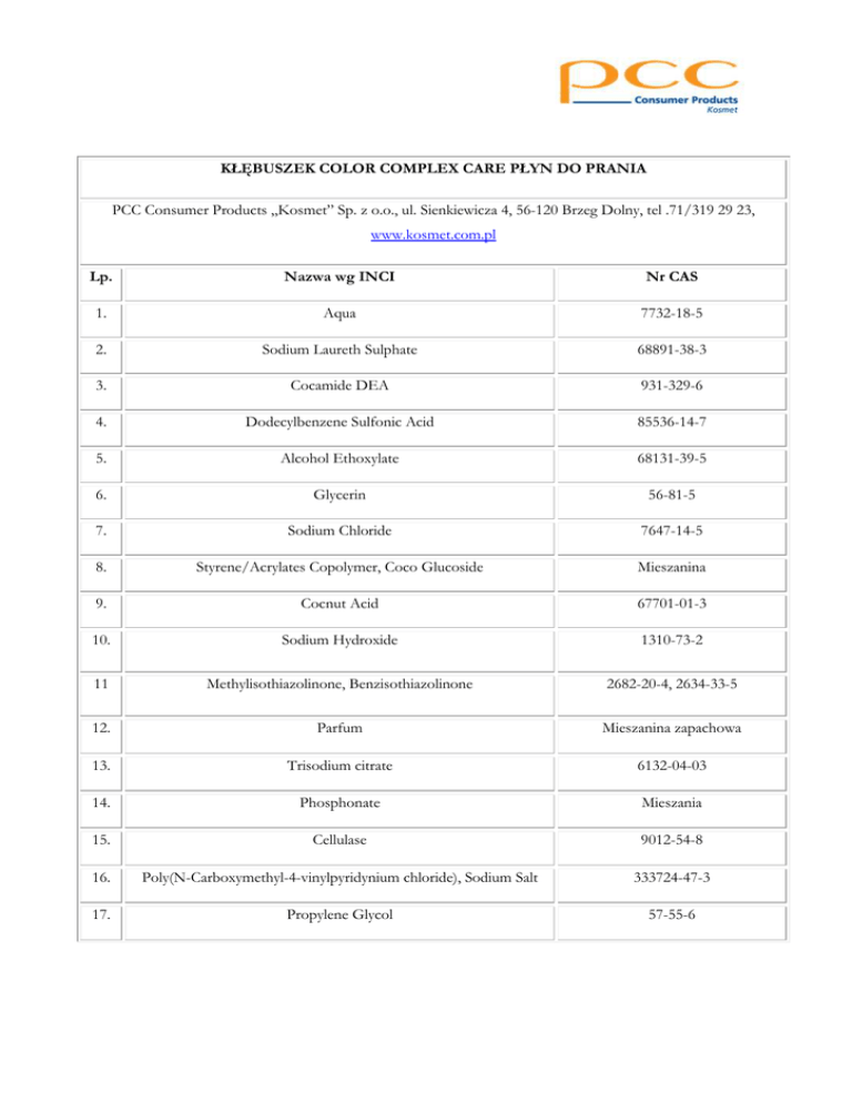 KŁĘBUSZEK COLOR COMPLEX CARE PŁYN DO PRANIA PCC Consumer Products „Kosmet” Sp. z o.o., ul. Sienkiewicza 4, 56-120 Brzeg Dolny, tel .71/319 29 23, www.kosmet.com.pl Lp. Nazwa wg INCI Nr CAS 1. Aqua 7732-18-5 2. Sodium Laureth Sulphate 68891-38-3 3. Cocamide DEA 931-329-6 4. Dodecylbenzene Sulfonic Acid 85536-14-7 5. Alcohol Ethoxylate 68131-39-5 6. Glycerin 56-81-5 7. Sodium Chloride 7647-14-5 8. Styrene/Acrylates Copolymer, Coco Glucoside Mieszanina 9. Cocnut Acid 67701-01-3 10. Sodium Hydroxide 1310-73-2 11 Methylisothiazolinone, Benzisothiazolinone 2682-20-4, 2634-33-5 12. Parfum Mieszanina zapachowa 13. Trisodium citrate 6132-04-03 14. Phosphonate Mieszania 15. Cellulase 9012-54-8 16. Poly(N-Carboxymethyl-4-vinylpyridynium chloride), Sodium Salt 333724-47-3 17. Propylene Glycol 57-55-6 18. Protease 9014-01-01 19. Amylase 9000-90-2 20. Barwnik mieszanina Informacje zamieszczone w niniejszym dokumencie mogą być wykorzystywane tylko przez personel medyczny. Dodatkowe informacje o INCI na stronie: http://ec.europa.eu/enterprise/cosmetics/cosing/index.cfm?fuseaction=search.simple