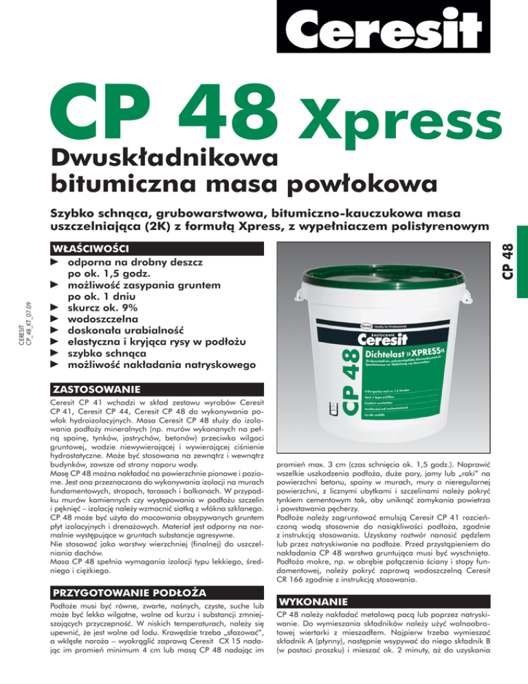CP 48 Xpress Dwuskładnikowa bitumiczna masa powłokowa CERESIT CP_48_KT_07.09 Szybko schnąca, grubowarstwowa, bitumiczno-kauczukowa masa uszczelniająca (2K) z formułą Xpress, z wypełniaczem polistyrenowym CP 48 WŁAŚCIWOŚCI odporna na drobny deszcz po ok. 1,5 godz. możliwość zasypania gruntem po ok. 1 dniu skurcz ok. 9% wodoszczelna doskonała urabialność elastyczna i kryjąca rysy w podłożu szybko schnąca możliwość nakładania natryskowego ZASTOSOWANIE Ceresit CP 41 wchodzi w skład zestawu wyrobów Ceresit CP 41, Ceresit CP 44, Ceresit CP 48 do wykonywania powłok hydroizolacyjnych. Masa Ceresit CP 48 służy do izolowania podłoży mineralnych (np. murów wykonanych na pełną spoinę, tynków, jastrychów, betonów) przeciwko wilgoci gruntowej, wodzie niewywierającej i wywierającej ciśnienie hydrostatyczne. Może być stosowana na zewnątrz i wewnątrz budynków, zawsze od strony naporu wody. Masę CP 48 można nakładać na powierzchnie pionowe i poziome. Jest ona przeznaczona do wykonywania izolacji na murach fundamentowych, stropach, tarasach i balkonach. W przypadku murów kamiennych czy występowania w podłożu szczelin i pęknięć – izolację należy wzmocnić siatką z włókna szklanego. CP 48 może być użyta do mocowania obsypywanych gruntem płyt izolacyjnych i drenażowych. Materiał jest odporny na normalnie występujące w gruntach substancje agresywne. Nie stosować jako warstwy wierzchniej (finalnej) do uszczelniania dachów. Masa CP 48 spełnia wymagania izolacji typu lekkiego, średniego i ciężkiego. PRZYGOTOWANIE PODŁOŻA Podłoże musi być równe, zwarte, nośnych, czyste, suche lub może być lekko wilgotne, wolne od kurzu i substancji zmniejszających przyczepność. W niskich temperaturach, należy się upewnić, że jest wolne od lodu. Krawędzie trzeba „sfazować”, a wklęsłe naroża – wyokrąglić zaprawą Ceresit CX 15 nadając im promień minimum 4 cm lub masą CP 48 nadając im promień max. 3 cm (czas schnięcia ok. 1,5 godz.). Naprawić wszelkie uszkodzenia podłoża, duże pory, jamy lub „raki” na powierzchni betonu, spoiny w murach, mury o nieregularnej powierzchni, z licznymi ubytkami i szczelinami należy pokryć tynkiem cementowym tak, aby uniknąć zamykania powietrza i powstawania pęcherzy. Podłoże należy zagruntować emulsją Ceresit CP 41 rozcieńczoną wodą stosownie do nasiąkliwości podłoża, zgodnie z instrukcją stosowania. Uzyskany roztwór nanosić pędzlem lub przez natryskiwanie na podłoże. Przed przystąpieniem do nakładania CP 48 warstwa gruntująca musi być wyschnięta. Podłoża mokre, np. w obrębie połączenia ściany i stopy fundamentowej, należy pokryć zaprawą wodoszczelną Ceresit CR 166 zgodnie z instrukcją stosowania. WYKONANIE CP 48 należy nakładać metalową pacą lub poprzez natryskiwanie. Do wymieszania składników należy użyć wolnoobrotowej wiertarki z mieszadłem. Najpierw trzeba wymieszać składnik A (płynny), następnie wsypywać do niego składnik B (w postaci proszku) i mieszać ok. 2 minuty, aż do uzyskania UWAGA Prace należy wykonywać w suchych warunkach, przy temperaturze powietrza i podłoża od +5°C do +25°C (jednak nie na silnie nasłonecznionych powierzchniach) oraz przy względnej wilgotności powietrza poniżej 80%. Wszelkie dane odnoszą się do temperatury +20°C i wilgotności względnej powietrza 60%. W innych warunkach należy uwzględnić szybsze lub wolniejsze przesychanie materiału. Aby ochronić zaizolowane powierzchnie przed uszkodzeniami, np. w czasie zasypywania wykopu i osiadania gruntu, trzeba zastosować odpowiednie płyty drenujące lub podobne osłony. Osłony te należy tak zamocować, aby nie nastąpiło ich obsunięcie podczas zagęszczania gruntu. Nie wolno dopuszczać do punktowego lub pasmowego obciążania zaizolowanych powierzchni. Nie wolno rozpoczynać zasypywania wykopu zanim warstwa izolacyjna nie będzie wystarczająco twarda. Do zasypywania wykopów nie stosować gruntów spoistych. Pomieszczenia, w których stosowano materiał, wietrzyć do zaniku zapachu przed oddaniem ich do użytku. W czasie pracy chronić oczy i naskórek używając odzieży, rękawic i okularów ochronnych. Zanieczyszczoną odzież niezwłocznie wymienić na czystą. Zabrudzony naskórek niezwłocznie umyć ciepłą wodą z mydłem (nie stosować rozpuszczalników). W przypadku kontaktu z oczami płukać je obficie wodą i zasięgnąć porady lekarza. Chronić przed dziećmi. ZALECENIA Niniejsza karta techniczna określa zakres stosowania materiału i sposób prowadzenia robót, ale nie może zastąpić zawodowego przygotowania wykonawcy. Oprócz podanych informacji prace należy wykonywać zgodnie ze sztuką budowlaną i zasadami BHP. Producent gwarantuje jakość wyrobu, natomiast nie ma wpływu na warunki i sposób jego użycia. W przypadku wątpliwości należy wykonać własne próby stosowania. Wraz z ukazaniem się tej karty technicznej tracą ważność karty wcześniejsze. SKŁADOWANIE Do 9 miesięcy od daty produkcji przy składowaniu w suchych, chłodnych warunkach i w oryginalnych, nieuszkodzonych opakowaniach. Chronić przed mrozem! OPAKOWANIA Opakowania 28 l zawierające obydwa składniki: Pojemniki plastikowe (składnik A – płynny) Worki papierowe (składnik B w postaci proszku) DANE TECHNICZNE Baza: bitumy z dodatkiem kauczuku i pianki polistyrenowej Gęstość: 0,65 kg/dm3 Temperatura stosowania: od +5°C do +25°C Proporcje mieszania: 22,4 l składnika A na 5,6 kg składnika B Czas zużycia: ok. 45 min Odporność na deszcz: po ok. 1,5 godz. Możliwość obciążania (zasypania gruntem): po ok. 1 dniu Temperatura mięknienia: > 80°C Nasiąkliwość powłoki: < 7% Odporność na powstawanie rys: > 2 mm Odczyn pH: 7÷11 Odporna na działanie środowisk agresywnych klasy XA1, XA2, XA3 CERESIT CP_48_KT_07.09 CP 48 jednorodnej masy bez grudek. Gotową masę równomiernie nakładać na podłoże za pomocą pacy lub a
