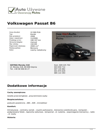 Volkswagen Passat B6 Cena (brutto) Typ: Rok produkcji: Data I rejestracji: Przebieg w km: Skrzynia biegów: Moc silnika: Pojemność skokowa: Rodzaj paliwa: Kolor: 22 900 PLN Kombi 2006 11/2006 190 337 km manual 150 KM 2000 cm3 Benzyna czarny metaliczny GDYNIA Morska 318 Ul. Morska 318, 80-006 Gdynia Tel. +48 58 506 65 27 Kom. 609 225 702 603 650 712 607 145 682 601 975 629 885 122 393 Dodatkowe informacje Cechy zewnętrzne: światła przeciwmgłowe , przyciemniane szyby Bezpieczeństwo: poduszki powietrzne , ABS , ASR , immobiliser Komfort: klimatyzacja , centralny zamek , czujnik parkowania , kierownica wielofunkcyjna , komputer , podgrzewane fotele , tapicerka welurowa , tempomat , el. lusterka , wspomaganie kierownicy , radio , el. szyby Historia: 1/2 bezwypadkowy Gwarancja Szanowni Państwo, Pragniemy Państwa poinformować, iż firma Plichta – Autoryzowany Dealer Škoda Auto prowadzi skup oraz sprzedaż samochodów używanych wszystkich marek, oferując także samochody używane z gwarancją objęte programem „Auta używane z Gwarancją Plichta”. W ramach programu „Auta Używane z Gwarancją Plichta ” każdy Klient otrzymuje atrakcyjny pakiet zniżek pozwalający zoptymalizować koszty eksploatacji samochodu: -50% na serwis klimatyzacji -50% na ustawienie zbieżności -50% na kosmetykę auta -50% na ścieżkę diagnostyczną -25% na wymiany oleju -25% na zakup opon + 5zł na sezon za hotelowanie opon -15% na części i akcesoria Oferujemy również kompleksową obsługę w zakresie finansowania i ubezpieczenia: - kredyty już od 4,99% - leasingi i kredyty bez zaświadczeń - uproszczone procedury – decyzja już od 30 min. - atrakcyjne pakiety AC/OC/NW/ASS wiodących firm ubezpieczeniowych Możliwość pozostawienia dotychczas użytkowanego auta w rozliczeniu – BEZPŁATNA WYCENA!!! Zapraszamy wszystkich Klientów na jazdę próbną wybranym autem. Numer oferty: E882 Informacja nie stanowi oferty w rozumieniu art. 66 KC. Podane dane mają charakter wyłącznie informacyjny. 2/2 Powered by TCPDF (www.tcpdf.org)