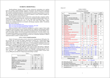 OCHRONA ŚRODOWISKA Załącznik 1 Interdyscyplinarny kierunek studiów OCHRONA ŚRODOWISKA prowadzony jest wspólnie przez dwa wydziały: Wydział Biologii, Geografii i Oceanologii oraz Wydział Chemii. Realizując ideę tworzenia europejskiej przestrzeni szkolnictwa wyższego, zawartą w Deklaracji Bolońskiej, oba wydziały kontynuują dwustopniowy system kształcenia zawodowo-magisterskiego na tym kierunku. Na obu wydziałach obowiązuje już od kilku lat punktowy system oceniania osiągnięć studentów ECTS (European Credit Transfer System). Rada Programowa kierunku OCHRONA ŚRODOWISKA opracowała plany i programy studiów. Punktem wyjścia do ich opracowania były: dotychczasowe standardy kształcenia dla kierunku ochrona środowiska opublikowane w Dz. U. nr 116, poz. 1004 z dnia 18 kwietnia 2002 r., „Prawo o szkolnictwie wyższym” opublikowane w Dz. U. nr 164, poz. 1365 z dnia 27 lipca 2005 r., proponowane nowe standardy kształcenia oraz aktualnie obowiązujące programy studiów. Wymienione dokumenty można znaleźć na: http://www.univ.gda.pl/pl/dz_org/ http://www.men.waw.pl/szk-wyz/aktualnosci/standardy_naucz.php http://www.chem.univ.gda.pl/informacje/dla_studentow/ Studia na kierunku OCHRONA ŚRODOWISKA składają się ze studiów I stopnia (3-letnie studia licencjackie), które prowadzone są przez Wydział Chemii oraz z będących ich kontynuacją studiów II stopnia (2-letnie uzupełniające studia magisterskie) prowadzonych przez Wydział Biologii, Geografii i Oceanologii. Każde z nich kończą się egzaminem dyplomowym. Po II roku studiów I stopnia nastąpi podział studentów na trzy specjalności: chemiczno-analityczną, biologiczno-ekologiczną i morską. Na studiach II stopnia będą prowadzone również trzy wymienione specjalności. Studia II stopnia prowadzone są także w systemie zaocznym. STUDIA I STOPNIA (studia licencjackie) Studia I i II stopnia na kierunku OCHRONA ŚRODOWISKA obejmują łącznie 3600 godzin. Mając na uwadze fakt, że ostatni rok studiów magisterskich związany jest z wykonywaniem pracy magisterskiej, która jest pracą doświadczalną to celowy jest następujący podział godzin: 2250 godzin studia 3-letnie i 1350 godzin studia 2-letnie. W obowiązujących standardach zarówno na studiach I jak i II stopnia 60% zajęć powinno być realizowanych w formie ćwiczeń. Na pierwszym roku studiów większość przedmiotów stanowią przedmioty obowiązkowe. Z łącznej liczby 2250 godzin 1575 godz. (70%) stanowią zajęcia obowiązkowe, a 675 godz. (30%) przedmioty do wyboru. Podział liczby godzin obligatoryjnych zachowuje 50% udział każdego z wydziałów. Ponieważ 435 godzin (tabela 1 oraz załącznik 1) realizują jednostki „zewnętrzne”, więc 1575 – 435 = 1140 godzin pozostaje do dyspozycji Wydziałów BGiO i Chemii. Oznacza to po 570 godzin przedmiotów obligatoryjnych dla każdego wydziału. Tabela 1 Nazwa przedmiotu W 30 30 15 15 15 15 120 Matematyka Fizyka Ekonomia w ochronie środowiska Ochrona własności intelektualnej BiHP i ergonomia Prawo w ochronie środowiska Język obcy Wychowanie fizyczne RAZEM Udział procentowy 28 % 1 Liczba godzin A L 45 15 30 15 30 120 60 285 30 65 % 7% Σ 75 75 30 15 15 45 120 60 435 STUDIA I STOPNIA Zestawienie przedmiotów Lp. 1. 2. 3. 4. 5. 6. 7. 8. 9. 10. 11. 12. 13. 14. 15. 16. Nazwa przedmiotu W Liczba godzin A L 23. Matematyka 30 45 Fizyka 30 15 Prawo w ochronie środowiska 15 30 Ekonomia w ochronie środowiska 15 15 Język obcy 120 Wychowanie fizyczne 60 Ochrona własności intelektualnej 15 BiHP i ergonomia 15 Biologia 45 Mikrobiologia 15 Ekologia 30 15 Ochrona przyrody 15 15 Geologia 30 15 Geomorfologia i gleboznawstwo 15 15 Hydrologia 30 30 Meteorologia i klimatologia 15 30 Zagrożenia cywilizacyjne 15 15 i rozwój zrównoważony Hydrobiologia 30 15 Funkcjonowanie ekosystemów 30 morskich Antropogeniczne przekształcanie 30 środowiska morskiego Monitoring środowiska 15+15 (biologiczny i chemiczny = 1:1) Ocena oddziaływania na środowisko 15 15 Chemia (ogólna, nieorganiczna, 105 75 24. 25. 26. 27. Biochemia Technologia informacyjna Technologie w ochronie środowiska Toksykologia 17. 18. 19. 20. 21. 22. analityczna, organiczna i fizyczna) RAZEM (przedmioty obligatoryjne) Udział procentowy inne – 435 godz. 30 60 30 15 - 75 75 45 30 120 60 15 15 105 45 60 30 45 30 60 45 MFI MFI PiA E SJO SWF PiA BiHP / Z BGiO BGiO BGiO BGiO BGiO BGiO BGiO BGiO - 30 BGiO 45 BGiO 30 BGiO - 30 BGiO 30 15+45 - 30 BGiO/ CH CH 120 300 CH CH CH CH CH 15 30 30 15 30 30 45 - 45 30 75 45 645 540 390 1575 41 % 34 % 25 % 100 % 30 30 - 30 2 „nowe” standardy 45 45 75 120 60 120 75 75 75 120 75 120 30 75 1110 - CH – 570 godz. 60 525 100 % Wydział - BGiO – 570 godz. 28. Filozofia przyrody 29. Przedmiot humanistyczny 30. Pracownia i seminarium dyplomowe Przedmioty do wyboru, w tym 31. specjalnościowe Σ 30 30 90 NS WFH/NS BGiO/CH BGiO / CH 30 30 - Wydział BGiO realizuje (zał. 1 i tabela 2) - uwzględniając standardy dla studiów licencjackich - następujące przedmioty obligatoryjne: Biologia, Mikrobiologia, Ekologia, Ochrona przyrody, Geologia, Geomorfologia i gleboznawstwo, Hydrologia, Meteorologia i klimatologia, Zagrożenia cywilizacyjne i rozwój zrównoważony oraz Monitoring środowiska (biologiczny). Uwzględniając przedstawiony podział godzin, przedmioty do wyboru stanowią łącznie 675 godzin (2250 – 1575 = 675). Z tej liczby 2 x 30 godz. przypada na przedmioty humanistyczne, które będą realizowane na I roku studiów. Pozostała ich część (615 godzin) będzie realizowana na drugim i trzecim roku studiów, głównie jako przedmioty związane ze specjalnością. Tabela 2 Proponowane są trzy specjalności: chemiczno-analityczna, biologiczno-ekologiczna i morska. Wyboru specjalności studenci będą dokonywać w trakcie semestru 4, przy zachowaniu następującego udziału procentowego studentów: 50% − chemiczno-analityczna, 25% − biologiczno-ekologiczna i 25% − morska. Na