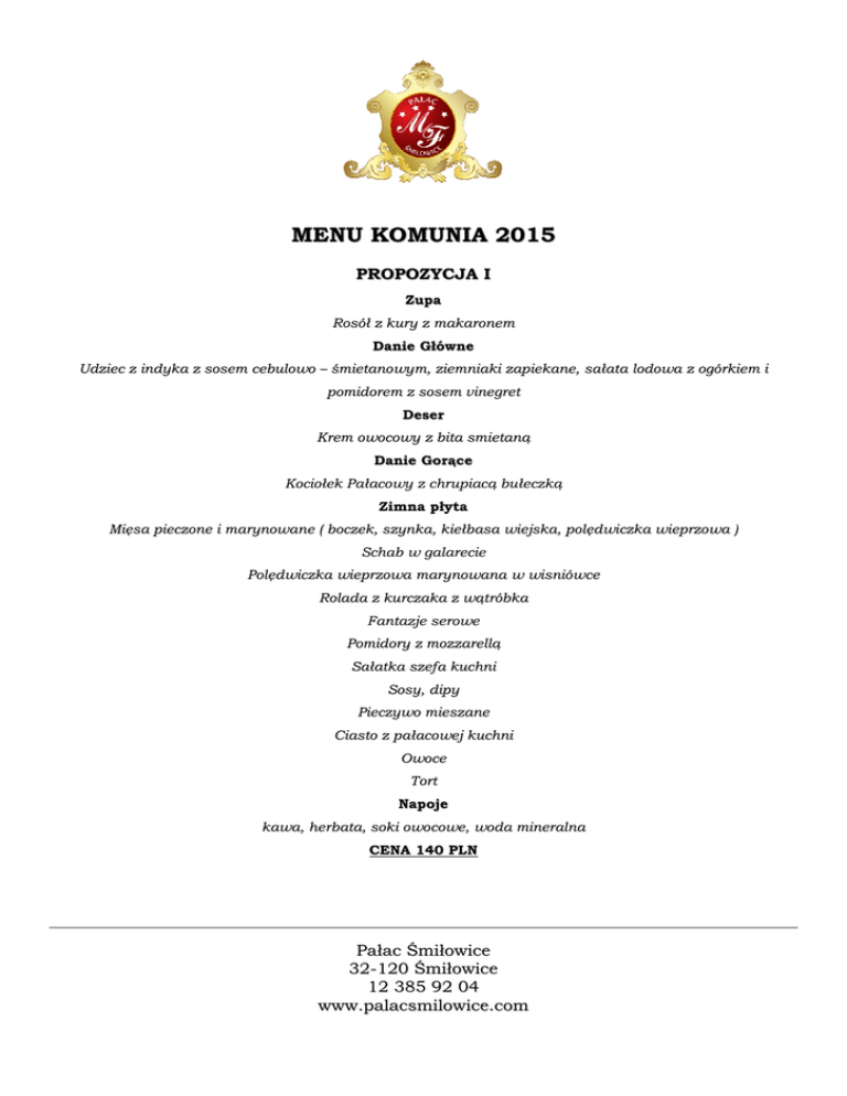 MENU KOMUNIA 2015 PROPOZYCJA I Zupa Rosół z kury z makaronem Danie Główne Udziec z indyka z sosem cebulowo – śmietano wym, ziemniaki zapiekane, sałata lodowa z ogórkiem i pomidorem z sosem vinegret Deser Krem owocowy z bita smietaną Danie Gorące Kociołek Pałaco wy z chrupiacą bułeczką Zimna płyta Mięsa pieczone i marynowane ( boczek, szynka, kiełbasa wiejska, polędwiczka wieprzo wa ) Schab w galarecie Polędwiczka wieprzowa marynowana w wisnió wce Rolada z kurczaka z wątróbka Fantazje serowe Pomidory z mozzarellą Sałatka szef a kuchni Sosy, dipy Pieczywo mieszane Ciasto z pałaco wej kuchni Owoce Tort Napoje kawa, herbata, soki owocowe, woda mineralna CENA 140 PLN P a ła c Ś m iło w ic e 3 2 - 1 2 0 Ś m iło w ic e 12 385 92 04 w w w .p a la c s m ilo w ic e .c o m MENU KOMUNIA 2015 P R O P O Z Y C J A II Przystawka Filet z kurczaka w occie balsamicznym na sałacie lodowej Zupa Pomidoro wo – papryko wa z kluseczkami Danie Główne Schab z boczkiem, cebulką i pietruszką, ziemniak z pieca z masełkiem, kapusta młoda z koperkiem Deser Panna cotta z f rużeliną i bitą smietaną Danie Gorące Zraziki wieprzowe w sosie własnym, kluseczki białe, suró wka z kapusty Zimna płyta Mięsa pieczone i marynowane ( boczek, szynka, kiełbasa wiejska, polędwiczka wieprzo wa ) Schab w galarecie Polędwiczka wieprzowa marynowana w wisnió wce Rolada z kurczaka z wątróbka Fantazje serowe Pomidory z mozzarellą Sałatka szef a kuchni Sosy, dipy Pieczywo mieszane Ciasto z pałaco wej kuchni Owoce Tort Napoje kawa, herbata, soki owocowe, woda mineralna CENA 150 PLN P a ła c Ś m iło w ic e 3 2 - 1 2 0 Ś m iło w ic e 12 385 92 04 w w w .p a la c s m ilo w ic e .c o m MENU KOMUNIA 2015 P R O P O Z Y C J A III Przystawka Rolada z łososia z sosem miodowo - musztardowym Zupa Bulion z uszkami Danie Główne Polędwiczka wieprzowa z sosem z zielonego pieprzu, ziemniaki z wody z masełkiem i koperkiem, bukiet surówek Deser Lody wielosmakowe z bita śmietaną Danie Gorące Filet z kurczaka f aszerowny mozzarellą o aromacie czosnku z sosem pietruszkowym, kluseczki białe, mizeria Zimna płyta Mięsa pieczone i marynowane ( boczek, szynka, kiełbasa wiejska, polędwiczka wieprzo wa ) Schab w galarecie Polędwiczka wieprzowa marynowana w wisnió wce Rolada z kurczaka z wątróbka Fantazje serowe Pomidory z mozzarellą Sałatka szef a kuchni Sosy, dipy Pieczywo mieszane Ciasto z pałaco wej kuchni Owoce Tort Napoje Wino do obiadu kawa, herbata, soki owocowe, woda mineralna CENA 160 PLN P a ła c Ś m iło w ic e 3 2 - 1 2 0 Ś m iło w ic e 12 385 92 04 w w w .p a la c s m ilo w ic e .c o m