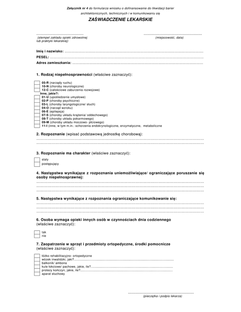 Załącznik nr 4 do formularza wniosku o dofinansowanie do likwidacji barier architektonicznych, technicznych i w komunikowaniu się ZAŚWIADCZENIE LEKARSKIE ...................................... ............................................... (stempel zakładu opieki zdrowotnej lub praktyki lekarskiej) (miejscowość, data) Imię i nazwisko: …………………………………………………………………………………………………………. PESEL: ……………………………..……………………………………………………………………………………… Adres zamieszkania: …………………………………………………………………………………………………… 1. Rodzaj niepełnosprawności (właściwe zaznaczyć): 05-R (narządy ruchu) 10-N (choroby neurologiczne) 12-C (całościowe zaburzenia rozwojowe) Inne, jakie?: 01-U (upośledzenie umysłowe) 02-P (choroby psychiczne) 03-L (choroby laryngologiczne/ słuch) 04-O (narząd wzroku) 06-E (epilepsja) 07-S (choroby układu krążenia/ oddechowego) 08-T (choroby układu pokarmowego) 09-M (choroby układu moczowo- płciowego) 11-I (inne, w tym m.in.: schorzenia endokrynologiczne, enzymatyczne, metaboliczne 2. Rozpoznanie (wpisać podstawową jednostkę chorobową): …………………………………………………………………………………………………………………… …………………………………………………………………………………………………………………… 3. Rozpoznanie ma charakter (właściwe zaznaczyć): stały postępujący 4. Następstwa wynikające z rozpoznania uniemożliwiające/ ograniczające poruszanie się osoby niepełnosprawnej: …………………………………………………………………………………………………………………… …………………………………………………………………………………………………………………… …………………………………………………………………………………………………………………… 5. Następstwa wynikające z rozpoznania ograniczające komunikowanie się: …………………………………………………………………………………………………………………… …………………………………………………………………………………………………………………… …………………………………………………………………………………………………………………… 6. Osoba wymaga opieki innych osób w czynnościach dnia codziennego (właściwe zaznaczyć): tak nie 7. Zaopatrzenie w sprzęt i przedmioty ortopedyczne, środki pomocnicze (właściwe zaznaczyć): łóżko rehabilitacyjno- ortopedyczne wózek inwalidzki, jaki?........................................................................................................... balkonik/ ambona kule łokciowe/ pachowe, jakie, ile?........................................................................................ protezy kończyn, jakie, ile?................................................................................................... aparat słuchowy ..................................................... (pieczątka i podpis lekarza)