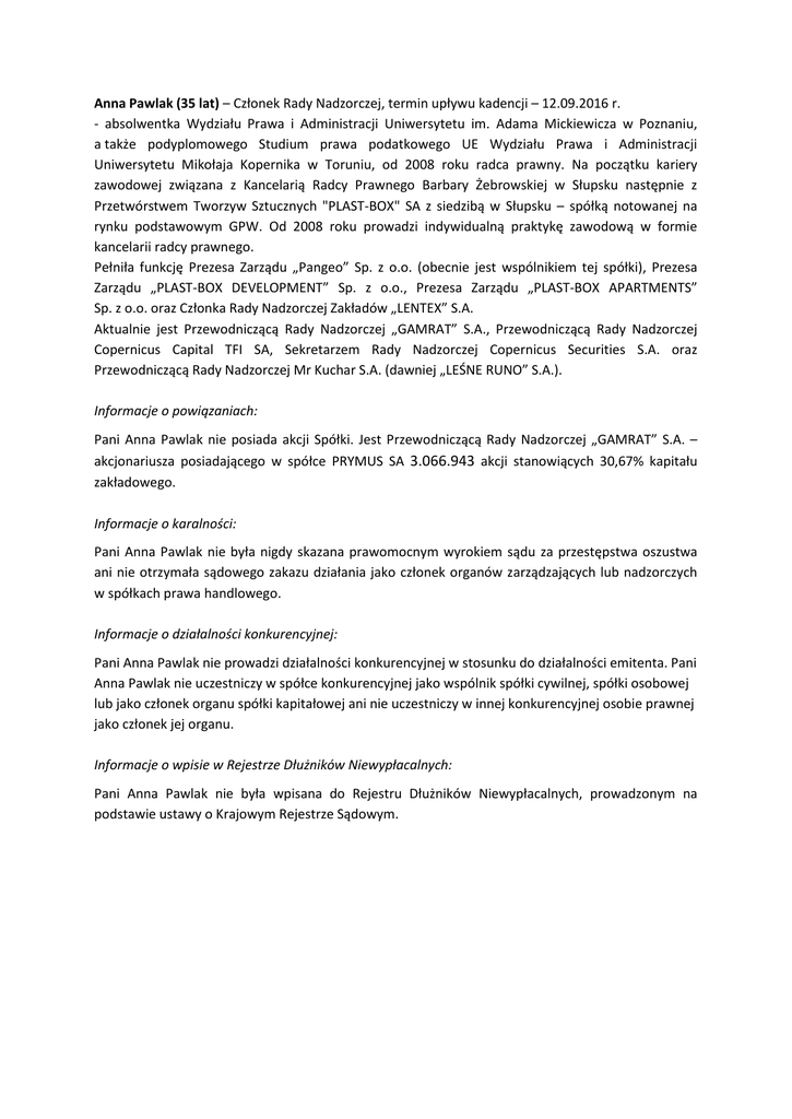 Anna Pawlak (35 lat) – Członek Rady Nadzorczej, termin upływu kadencji – 12.09.2016 r. - absolwentka Wydziału Prawa i Administracji Uniwersytetu im. Adama Mickiewicza w Poznaniu, a także podyplomowego Studium prawa podatkowego UE Wydziału Prawa i Administracji Uniwersytetu Mikołaja Kopernika w Toruniu, od 2008 roku radca prawny. Na początku kariery zawodowej związana z Kancelarią Radcy Prawnego Barbary Żebrowskiej w Słupsku następnie z Przetwórstwem Tworzyw Sztucznych "PLAST-BOX" SA z siedzibą w Słupsku – spółką notowanej na rynku podstawowym GPW. Od 2008 roku prowadzi indywidualną praktykę zawodową w formie kancelarii radcy prawnego. Pełniła funkcję Prezesa Zarządu „Pangeo” Sp. z o.o. (obecnie jest wspólnikiem tej spółki), Prezesa Zarządu „PLAST-BOX DEVELOPMENT” Sp. z o.o., Prezesa Zarządu „PLAST-BOX APARTMENTS” Sp. z o.o. oraz Członka Rady Nadzorczej Zakładów „LENTEX” S.A. Aktualnie jest Przewodniczącą Rady Nadzorczej „GAMRAT” S.A., Przewodniczącą Rady Nadzorczej Copernicus Capital TFI SA, Sekretarzem Rady Nadzorczej Copernicus Securities S.A. oraz Przewodniczącą Rady Nadzorczej Mr Kuchar S.A. (dawniej „LEŚNE RUNO” S.A.). Informacje o powiązaniach: Pani Anna Pawlak nie posiada akcji Spółki. Jest Przewodniczącą Rady Nadzorczej „GAMRAT” S.A. – akcjonariusza posiadającego w spółce PRYMUS SA 3.066.943 akcji stanowiących 30,67% kapitału zakładowego. Informacje o karalności: Pani Anna Pawlak nie była nigdy skazana prawomocnym wyrokiem sądu za przestępstwa oszustwa ani nie otrzymała sądowego zakazu działania jako członek organów zarządzających lub nadzorczych w spółkach prawa handlowego. Informacje o działalności konkurencyjnej: Pani Anna Pawlak nie prowadzi działalności konkurencyjnej w stosunku do działalności emitenta. Pani Anna Pawlak nie uczestniczy w spółce konkurencyjnej jako wspólnik spółki cywilnej, spółki osobowej lub jako członek organu spółki kapitałowej ani nie uczestniczy w innej konkurencyjnej osobie prawnej jako członek jej organu. Informacje o wpisie w Rejestrze Dłużników Niewypłacalnych: Pani Anna Pawlak nie była wpisana do Rejestru Dłużników Niewypłacalnych, prowadzonym na podstawie ustawy o Krajowym Rejestrze Sądowym.