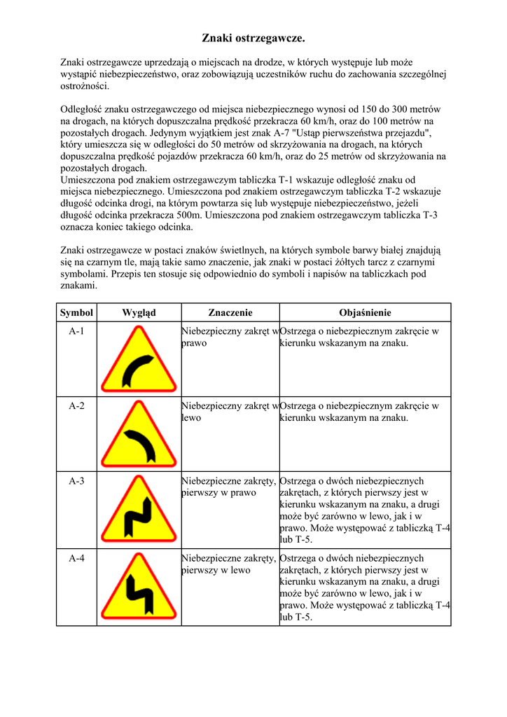 Znaki ostrzegawcze. Znaki ostrzegawcze uprzedzają o miejscach na drodze, w których występuje lub może wystąpić niebezpieczeństwo, oraz zobowiązują uczestników ruchu do zachowania szczególnej ostrożności. Odległość znaku ostrzegawczego od miejsca niebezpiecznego wynosi od 150 do 300 metrów na drogach, na których dopuszczalna prędkość przekracza 60 km/h, oraz do 100 metrów na pozostałych drogach. Jedynym wyjątkiem jest znak A-7 "Ustąp pierwszeństwa przejazdu", który umieszcza się w odległości do 50 metrów od skrzyżowania na drogach, na których dopuszczalna prędkość pojazdów przekracza 60 km/h, oraz do 25 metrów od skrzyżowania na pozostałych drogach. Umieszczona pod znakiem ostrzegawczym tabliczka T-1 wskazuje odległość znaku od miejsca niebezpiecznego. Umieszczona pod znakiem ostrzegawczym tabliczka T-2 wskazuje długość odcinka drogi, na którym powtarza się lub występuje niebezpieczeństwo, jeżeli długość odcinka przekracza 500m. Umieszczona pod znakiem ostrzegawczym tabliczka T-3 oznacza koniec takiego odcinka. Znaki ostrzegawcze w postaci znaków świetlnych, na których symbole barwy białej znajdują się na czarnym tle, mają takie samo znaczenie, jak znaki w postaci żółtych tarcz z czarnymi symbolami. Przepis ten stosuje się odpowiednio do symboli i napisów na tabliczkach pod znakami. Symbol Wygląd Znaczenie Objaśnienie A-1 Niebezpieczny zakręt wOstrzega o niebezpiecznym zakręcie w prawo kierunku wskazanym na znaku. A-2 Niebezpieczny zakręt wOstrzega o niebezpiecznym zakręcie w lewo kierunku wskazanym na znaku. A-3 Niebezpieczne zakręty, Ostrzega o dwóch niebezpiecznych pierwszy w prawo zakrętach, z których pierwszy jest w kierunku wskazanym na znaku, a drugi może być zarówno w lewo, jak i w prawo. Może występować z tabliczką T-4 lub T-5. A-4 Niebezpieczne zakręty, Ostrzega o dwóch niebezpiecznych pierwszy w lewo zakrętach, z których pierwszy jest w kierunku wskazanym na znaku, a drugi może być zarówno w lewo, jak i w prawo. Może występować z tabliczką T-4 lub T-5. A-5 Skrzyżowanie dróg Ostrzega o skrzyżowaniu dróg, na którym pierwszeństwo przejazdu nie jest określone znakami. A-6a Skrzyżowanie z drogą podporządkowaną występującą po obu stronach Ostrzega o skrzyżowaniu z drogą podporządkowaną, występującą po obu stronach. Umieszczona pod znakiem tabliczka T-6b wskazuje układ dróg na skrzyżowaniu. Gruba linia na znakach i tabliczkach oznacza drogę z pierwszeństwem. A-6b Skrzyżowanie z drogą podporządkowaną występującą po prawej stronie Ostrzega o skrzyżowaniu z drogą podporządkowaną, występującą po stronie prawej. Umieszczona pod znakiem tabliczka T-6b wskazuje układ dróg na skrzyżowaniu. Gruba linia na znakach i tabliczkach oznacza drogę z pierwszeństwem. A-6c Skrzyżowanie z drogą podporządkowaną występującą po lewej stronie Ostrzega o skrzyżowaniu z drogą podporządkowaną, występującą po stronie lewej. Umieszczona pod znakiem tabliczka T-6b wskazuje układ dróg na skrzyżowaniu. Gruba linia na znakach i tabliczkach oznacza drogę z pierwszeństwem. A-6d Wlot drogi jednokierunkowej z prawej strony Ostrzega o skrzyżowaniu z jednokierunkową drogą podporządkowaną, której wlot występuje po stronie prawej. Gruba linia na znakach oznacza drogę z pierwszeństwem. A-6e Wlot drogi jednokierunkowej z lewej strony Ostrzega o skrzyżowaniu z jednokierunkową drogą podporządkowaną, której wlot występuje po stronie lewej. Gruba linia na znakach oznacza drogę z pierwszeństwem. A-7 Ustąp pierwszeństwa Ostrzega o skrzyżowaniu z drogą z pierwszeństwem. Znak A-7 znajdujący się w obrębie skrzyżowania dotyczy tylko najbliższej jezdni, przed którą został umieszczony. Przepis stosuje się odpowiednio do znaku A-7 umieszczonego przed torowiskiem pojazdów szynowych lub w innych miejscach przecinania się kierunków ruchu. Umieszczona pod znakiem A-7 tabliczka T-6c lub T-6d wskazuje rzeczywisty przebieg drogi z pierwszeństwem przez skrzyżowanie. Gruba linia na tabliczkach oznacza drogę z pierwszeństwem. A-8 Skrzyżowanie o ruchu Ostrzega o skrzyżowaniu, na którym ruch okrężnym odbywa się dookoła wyspy lub placu w kierunku wskazanym na znaku. A-9 Przejazd kolejowy z zaporami A-10 Przejazd kolejowy bez Ostrzega o przejeździe kolejowym zapór niewyposażonym ani w zapory, ani w półzapory. Umieszczona pod znakiem A10 tabliczka T-7 wskazuje układ torów i drogi na przejeździe. A-11 Nierówna droga Ostrzega o poprzecznej nierówności jezdni A-11a Próg zwalniający Ostrzega o wypukłości na jezdni zastosowanej w celu spowolnienia ruchu pojazdów A-12a Zwężenie jezdni dwustronne Ostrzega o występującym po obu stronach jezdni zwężeniu, które może powodować utrudnienia ruchu A-12b Zwężenie jezdni prawostronne Ostrzega o występującym po prawej stronie jezdni zwężeniu, które może powodować utrudnienia ruchu A-12c Zwężenie jezdni lewostronne Ostrzega o występującym po lewej stronie jezdni zwężeniu, które może powodować utrudnienia ruchu A-13 Ruchomy most Ostrzega o wjeździe na most zwodzony lub obrotowy A-14 Roboty drogowe Ostrzega o prowadzonych na drodze robotach; umieszczona pod znakiem tabliczka T-19 wskazuje na malowanie znaków poziomych Ostrzega o przejeździe kolejowym wyposażonym w zapory lub półzapory. Umieszczona pod znakiem A-9 tabliczka T-7 wskazuje układ torów i drogi na przejeździe. A-15 Śliska jezdnia Ostrzega o możliwości poślizgu pojazdu spowodowanego w szczególności zmianą nawierzchni jezdni, stałym lub okresowym jej zawilgoceniem itd. A-16 Przejście dla pieszych Ostrzega o przejściu dla pieszych A-17 Dzieci A-18a Zwierzęta gospodarskie Ostrzega o możliwości napotkania na drodze zwierząt gospodarskich A-18b Zwierzęta dzikie Ostrzega o możliwości napotkania na drodze zwierząt dzikich A-19 Boczny wiatr Ostrzega o miejscu, w którym mogą występować silne boczne p