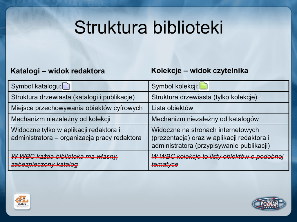 Struktura biblioteki Katalogi – widok redaktora Kolekcje – widok czytelnika Symbol katalogu: Symbol kolekcji: Struktura drzewiasta (katalogi i publikacje) Struktura drzewiasta (tylko kolekcje) Miejsce przechowywania obiektów cyfrowych Lista obiektów Mechanizm niezależny od kolekcji Mechanizm niezależny od katalogów Widoczne tylko w aplikacji redaktora i administratora – organizacja pracy redaktora Widoczne na stronach internetowych (prezentacja) oraz w aplikacji redaktora i administratora (przypisywanie publikacji) W WBC każda biblioteka ma własny, zabezpieczony katalog W WBC kolekcje to listy obiektów o podobnej tematyce Struktura biblioteki Katalogi – widok redaktora Kolekcje – widok czytelnika Wielkopolska Biblioteka Cyfrowa Biblioteka cyfrowa Biblioteka Kórnicka PAN Dziedzictwo kulturowe Studya historyczne Dziedzictwo kulturowe Materiały dydaktyczne Biblioteka Uniwersytecka w Poznaniu Matematyka Podstawy chemii ogólnej Dziennik Poznański Archiwum Państwowe w Poznaniu Centrum Kultury ZAMEK w Poznaniu Księga Sądu Ziemskiego w Koninie Chemia Materiały regionalne Katalog • • • Nazwa Uwagi Opis bibliograficzny – Domyślny opis bibliograficzny elementów tworzonych w katalogu Kolekcja • • • Nazwa Opis kolekcji Uwagi – Widoczne tylko w aplikacji redaktora i administratora Kolekcja wystaw • • • • Specjalna kolekcja Nie jest umieszczona wśród innych kolekcji na stronie internetowej Lista publikacji przeznaczonych do szczególnego wyeksponowania Wystawą jest każda publikacja przypisana do kolekcji wystaw Publikacja • • • Obiekt cyfrowy umieszczony w systemie dLibra Reprezentuje pojedynczą pozycję (książka, numer gazety, mapa, film, itp.) Składa się z wydań – kolejne „wersje” publikacji Publikacja Wydanie I Wydanie II Wydanie III 2005 2006 2007 czas Wydanie • • • • Nazwa Pliki z treścią Opis bibliograficzny – tytuł, autor, itp. Publikowanie – – Stałe (jest opublikowane, bądź nie – do momentu ręcznej zmiany stanu) Czasowe (do określonego dnia w przyszłości) • • • Automatyczna zmiana stanu na nieopublikowane w wyznaczonym terminie Ułatwia przestrzeganie umów z właścicielami praw Uwagi administracyjne – Widoczne tylko w aplikacji redaktora i administratora Wydanie – informacje WWW • Opis – – – • Krótki, jednozdaniowy opis Widoczny na WWW w wynikach wyszukiwania przy konkretnej pozycji Zależny od języka interfejsu Komentarz – – – • Dłuższa charakterystyka publikacji, ciekawostki, itp. Widoczny na stronie WWW dotyczącej wydania Zależny od języka interfejsu Miniaturka wydania – Zdjęcie, rysunek, skan obrazujący treść wydania Publikacja • • Nazwa Uwagi administracyjne – • Widoczne tylko w aplikacji redaktora i administratora Lista kolekcji do których jest przypisana – – • Redaktor przypisuje publikację do kolekcji Pośrednie przypisanie do kolekcji Prawa użytkowników do publikacji – – Redaktor przyznaje prawa do publikacji użytkownikom Możliwe prawa • • • Przeglądanie – widoczne tylko opublikowane wydania Odczyt – widoczne wszystkie wydania Zarządzanie – pełny dostęp do publikacji i jej wydań Publikacja • Zabezpieczanie publikacji – Uniemożliwia wydruk – Uniemożliwia kopiowanie treści – Ograniczona do treści w formacie • • • DjVu HTML PDF Publikacja grupowa • • Nie posiada treści Służy do łączenia (grupowania) powiązanych ze sobą publikacji, np. gazety, publikacje wielotomowe Hierarchiczna struktura • – – – Może zawierać publikacje i publikacje grupowe Widoczna na stronach internetowych biblioteki cyfrowej Ułatwia nawigację użytkownikom Biblioteka cyfrowa Biblioteka Kórnicka PAN Dziennik Poznański 1867 styczeń Dziennik Poznański 1867.01.01. R.9 nr 1 Publikacja grupowa • Nazwa – • widoczna na stronie WWW w strukturze publikacji grupowej Uwagi – • Widoczne tylko w aplikacji redaktora i administratora Informacje WWW – – – • Opis Komentarz Miniaturka Lista publikacji – Możliwa ręczna zmiana pozycji na której znajduje się podrzędna publikacja Publikacja grupowa • Dziedziczone właściwości – – – Prawa przyznane publikacji Kolekcje do których przypisane są publikacje Opis bibliograficzny publikacji Biblioteka cyfrowa Biblioteka Kórnicka PAN Dziennik Poznański (adam: przeglądanie, Użytkownicy publiczni: przeglądanie) 1867 (adam: przeglądanie + odczyt, Użytkownicy publiczni: przeglądanie) Styczeń (adam: przeglądanie + odczyt, Użytkownicy publiczni: przeglądanie) Dziennik Poznański 1867.01.01. R.9 nr 1 (adam: przeglądanie + odczyt + zarządzanie, Użytkownicy publiczni: przeglądanie) Dziennik Poznański - dodatek z Kolędami 1867.12.01. R.9 nr 1 (adam: przeglądanie + odczyt, Użytkownicy publiczni: przeglądanie) Publikacja grupowa • Dziedziczone właściwości – – – Prawa przyznane publikacji Kolekcje do których przypisane są publikacje Opis bibliograficzny publikacji Biblioteka cyfrowa Biblioteka Kórnicka PAN Dziennik Poznański (kolekcja: Materiały regionalne) 1867 (kolekcja: Materiały regionalne) Styczeń (kolekcja: Materiały regionalne) Dziennik Poznański 1867.01.01. R.9 nr 1 (kolekcja: Materiały regionalne) Dziennik Poznański - dodatek z Kolędami 1867.12.01. R.9 nr 1 (kolekcja: Materiały regionalne, Muzykalia) Publikacja grupowa • Dziedziczone właściwości – – – Prawa przyznane publikacji Kolekcje do których przypisane są publikacje Opis bibliograficzny publikacji Biblioteka cyfrowa Biblioteka Kórnicka PAN Dziennik Poznański (słowa kluczowe: dziennik) 1867 (słowa kluczowe: dziennik, data: 1867) Styczeń (słowa kluczowe: dziennik, data: 1867) Dziennik Poznański 1867.01.01. R.9 nr 1 (opis: dziennik, data: 1867, miejsce wydania: Poznań) Dziennik Poznański - dodatek z Kolędami 1867.12.01. R.9 nr 1 (opis: dziennik, data: 1867, miejsce wydania: Poznań) Inne rodzaje publikacji • Publikacje 