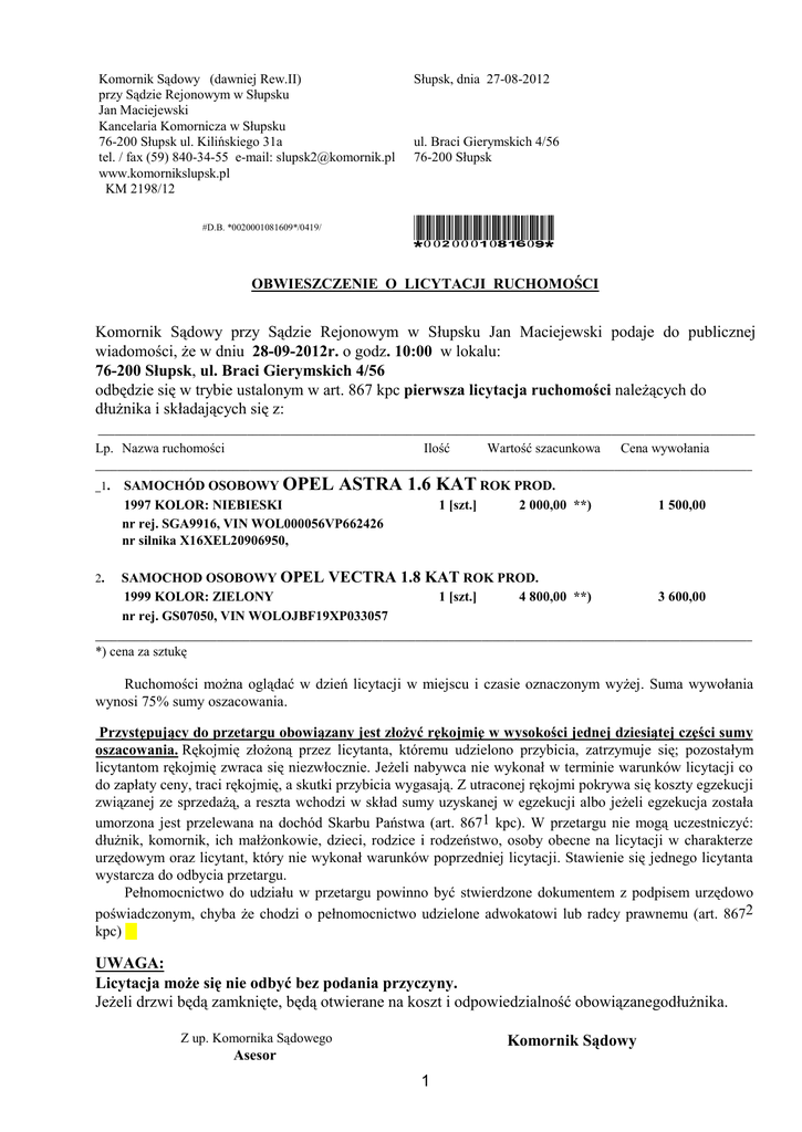 Komornik Sądowy (dawniej Rew.II) przy Sądzie Rejonowym w Słupsku Jan Maciejewski Kancelaria Komornicza w Słupsku 76-200 Słupsk ul. Kilińskiego 31a tel. / fax (59) 840-34-55 e-mail: [email protected] www.komornikslupsk.pl KM 2198/12 #D.B. *0020001081609*/0419/ Słupsk, dnia 27-08-2012 ul. Braci Gierymskich 4/56 76-200 Słupsk *0020001081609* OBWIESZCZENIE O LICYTACJI RUCHOMOŚCI Komornik Sądowy przy Sądzie Rejonowym w Słupsku Jan Maciejewski podaje do publicznej wiadomości, że w dniu 28-09-2012r. o godz. 10:00 w lokalu: 76-200 Słupsk, ul. Braci Gierymskich 4/56 odbędzie się w trybie ustalonym w art. 867 kpc pierwsza licytacja ruchomości należących do dłużnika i składających się z: _______________________________________________________________________________________________________________________ Lp. Nazwa ruchomości Ilość Wartość szacunkowa Cena wywołania _______________________________________________________________________________________________________________________ _1. 2. SAMOCHÓD OSOBOWY OPEL ASTRA 1997 KOLOR: NIEBIESKI nr rej. SGA9916, VIN WOL000056VP662426 nr silnika X16XEL20906950, 1.6 KAT ROK PROD. SAMOCHOD OSOBOWY OPEL VECTRA 1.8 1999 KOLOR: ZIELONY nr rej. GS07050, VIN WOLOJBF19XP033057 1 [szt.] 2 000,00 **) 1 500,00 KAT ROK PROD. 1 [szt.] 4 800,00 **) 3 600,00 _______________________________________________________________________________________________________________________ *) cena za sztukę Ruchomości można oglądać w dzień licytacji w miejscu i czasie oznaczonym wyżej. Suma wywołania wynosi 75% sumy oszacowania. Przystępujący do przetargu obowiązany jest złożyć rękojmię w wysokości jednej dziesiątej części sumy oszacowania. Rękojmię złożoną przez licytanta, któremu udzielono przybicia, zatrzymuje się; pozostałym licytantom rękojmię zwraca się niezwłocznie. Jeżeli nabywca nie wykonał w terminie warunków licytacji co do zapłaty ceny, traci rękojmię, a skutki przybicia wygasają. Z utraconej rękojmi pokrywa się koszty egzekucji związanej ze sprzedażą, a reszta wchodzi w skład sumy uzyskanej w egzekucji albo jeżeli egzekucja została umorzona jest przelewana na dochód Skarbu Państwa (art. 8671 kpc). W przetargu nie mogą uczestniczyć: dłużnik, komornik, ich małżonkowie, dzieci, rodzice i rodzeństwo, osoby obecne na licytacji w charakterze urzędowym oraz licytant, który nie wykonał warunków poprzedniej licytacji. Stawienie się jednego licytanta wystarcza do odbycia przetargu. Pełnomocnictwo do udziału w przetargu powinno być stwierdzone dokumentem z podpisem urzędowo poświadczonym, chyba że chodzi o pełnomocnictwo udzielone adwokatowi lub radcy prawnemu (art. 8672 kpc) UWAGA: Licytacja może się nie odbyć bez podania przyczyny. Jeżeli drzwi będą zamknięte, będą otwierane na koszt i odpowiedzialność obowiązanegodłużnika. Z up. Komornika Sądowego Komornik Sądowy Asesor 1 Dariusz Bolewski Jan Maciejewski Adresat oryginału: Do wiadomości: 1. Spółdzielnia Mieszkaniowa "Kolejarz", 76-200 Słupsk 2. Sąd Rejonowy w Słupsku Tablica Ogłoszeń, 76-200 Słupsk 3. Santander Consumer Bank SA, 53-611 Wrocław 4. Biuro Rachunkowe "Eximp - Gemat" Maran Taraśkiewicz, 76-200 Słupsk 5. a/a 2