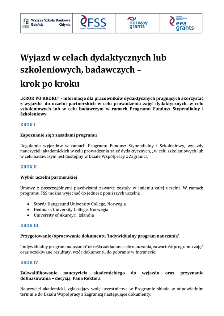 Wyjazd w celach dydaktycznych lub szkoleniowych, badawczych – krok po kroku „KROK PO KROKU” - informacje dla pracowników dydaktycznych pragnących skorzystać z wyjazdu do uczelni partnerskich w celu prowadzenia zajęć dydaktycznych, w celu szkoleniowych lub w celu badawczym w ramach Programu Fundusz Stypendialny i Szkoleniowy. KROK I Zapoznanie się z zasadami programu Regulamin wyjazdów w ramach Programu Fundusz Stypendialny i Szkoleniowy, wyjazdy nauczycieli akademickich w celu prowadzenia zajęć dydaktycznych, , w celu szkoleniowych lub w celu badawczym jest dostępny w Dziale Współpracy z Zagranicą KROK II Wybór uczelni partnerskiej Umowy z poszczególnymi placówkami zawarte zostały w imieniu całej uczelni. W ramach programu FSS można wyjechać do jednej z poniższych uczelni: Stord/ Haugesund University College, Norwegia Hedmark University College, Norwegia University of Akureyri, Islandia KROK III Przygotowanie/opracowanie dokumentu 'Indywidualny program nauczania' 'Indywidualny program nauczania' określa zakładane cele nauczania, zawartość programu zajęć oraz oczekiwane rezultaty, wzór dokumentu do pobranie w Intranecie. KROK IV Zakwalifikowanie nauczyciela akademickiego dofinasowania – decyzją Pana Rektora do wyjazdu oraz przyznanie Nauczyciel akademicki, zgłaszający wolę uczestnictwa w Programie składa w odpowiednim terminie do Działu Współpracy z Zagranicą następujące dokumenty: Podanie do Pana Rektora, w którym podany powinien być cel wyjazdu, proponowany temat wykładów, preferowana uczelnia zagraniczna oraz termin wyjazdu. Indywidualny Program nauczania KROK V Kontakt z uczelnią partnerską Pierwszy kontakt z uczelnią partnerską nawiązuje Dział Współpracy z Zagranicą. Po otrzymaniu od zagranicznego partnera adresu e-mail do osoby kontaktowej, pracownik działu DWZ przekazuj go osobie zakwalifikowanej do wyjazdu, która od tej chwili samodzielnie ustala szczegóły wyjazdu. KROK VI Formalności w kraju Ubezpieczenie zdrowotne Nauczyciel akademicki wyjeżdżający w ramach Programu Fundusz Stypendialny i Szkoleniowy zobowiązany jest do ubezpieczenia się od kosztów leczenia oraz następstw nieszczęśliwych wypadków. Podstawowe ubezpieczenie zdrowotne gwarantuje Europejska Karta Ubezpieczenia Zdrowotnego wydawana przez NFZ na prośbę nauczyciela oraz na podstawie zaświadczenia od Kierownika Działu DWZ, Ubezpieczenie zdrowotne nie jest tożsame z ubezpieczeniem od następstw nieszczęśliwych wypadków, które jest wykupywane w dobrowolnym towarzystwie ubezpieczeniowym. Podpisanie umowy na wyjazd z WSB w Gdańsku Umowa podpisywana przez nauczyciela z uczelnią zawiera szczegółowy zakres zobowiązań. Wypłata stypendium Wypłata stypendium realizowana jest po podpisaniu umowy między nauczycielem akademickim a WSB w Gdańsku. Nauczyciel otrzymuje stypendium w formie przelewu na konto w PLN, podane w oddzielnym oświadczeniu (dokument „Konto FSS” do pobrania w intranecie) Stypendium jest przeznaczone na pokrycie kosztów związanych z utrzymaniem za granicą w wysokości 250 Euro 1 za dzień oraz dodatkowo 500 Euro na pokrycie kosztów związanych z podróżą. 1 Kwota stypendium przyznawana jest w Euro, jednak zgodnie z zasadami umowy finansowej pomiędzy Operatorem programu a WSB wypłacana jest w PLN według kursu zawartego w umowie finansowe 1 Euro= 4,2312 PLN KROK VII Przed wyjazdem do uczelni partnerskiej Beneficjent zobowiązany jest przed rozpoczęciem wizyty w uczelni partnerskiej do wypełnienia ankiety ewaluacyjnej ex’ante online. Link do ankiety udostępniony zostanie przed Dział DWZ. KROK VIII Pobyt w uczelni przyjmującej Celem wyjazdu nauczyciela akademickiego jest prowadzenie zajęć dydaktycznych, uczestnictwo w szkoleniu bądź w celu przeprowadzenia badań naukowych. W Roku Akademickim 2014/2015 Uczelnia pozyskała środki na 3 wyjazdy zagraniczne ( 2 wyjazdy 5 dniowe oraz 1 wyjazd 3 dniowy). Długość pobytu w uczelni partnerskiej stanowiąca podstawę rozliczenia stypendium będzie określana z dokładnością co do jednego dnia. KROK IX Powrót z uczelni przyjmującej Nauczyciel akademicki jest zobowiązany do złożenia dokumentów potwierdzających pobyt w uczelni przyjmującej w Dziale DWZ w ciągu 30 dni od dnia zakończenia stypendium Potwierdzenie pobytu / Confirmation Letter Pisemne zaświadczenie o okresie pobytu w uczelni partnerskiej wraz z informacją o liczbie godzin przeprowadzonych zajęć dydaktycznych. Zaświadczenie powinno zawierać pieczęcie i podpisy osób uprawnionych. Dostępne do pobrania w Intranecie Wypełnienie ankiety ewaluacyjna ex’post Link do ankiety udostępniony zostanie przed Dział DWZ. Program wyjazdu w oryginale, podpisany przez stronę goszczącą