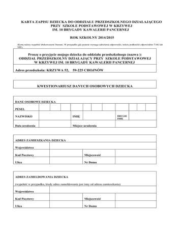 KARTA ZAPISU DZIECKA DO ODDZIAŁU PRZEDSZKOLNEGO DZIAŁAJĄCEGO PRZY SZKOLE PODSTAWOWEJ W KRZYWEJ IM. 10 BRYGADY KAWALERII PANCERNEJ ROK SZKOLNY 2014/2015 (Kartę należy wypełnić drukowanymi literami. W przypadku gdy pytanie wymaga udzielenia odpowiedzi, należy podkreślić odpowiednio TAK lub NIE). Proszę o przyjęcie mojego dziecka do oddziału przedszkolnego (nazwa ): ODDZIAŁ PRZEDSZKOLNY DZIAŁAJĄCY PRZY SZKOLE PODSTAWOWEJ W KRZYWEJ IM. 10 BRYGADY KAWALERII PANCERNEJ Adres przedszkola: KRZYWA 52, 59-225 CHOJNÓW KWESTIONARIUSZ DANYCH OSOBOWYCH DZIECKA DANE OSOBOWE DZIECKA PESEL DRUGIE IMIĘ NAZWISKO IMIĘ Data urodzenia Miejsce urodzenia ADRES ZAMIESZKANIA DZIECKA Województwo Kod Pocztowy Miejscowość Ulica Nr Domu ADRES ZAMELDOWANIA DZIECKA (wypełnić w przypadku, kiedy adres zameldowania jest inny od adresu zamieszkania) Województwo Kod Pocztowy Miejscowość Ulica Nr Domu KWESTIONARIUSZ DANYCH OSOBOWYCH MATKI/OPIEKUNKI PRAWNEJ DANE OSOBOWE MATKI/OPIEKUNKI PRAWNEJ NAZWISKO IMIĘ ADRES ZAMIESZKANIA MATKI/OPIEKUNKI PRAWNEJ Województwo Kod Pocztowy Miejscowość Ulica Nr Domu ADRES ZAMELDOWANIA MATKI/OPIEKUNKI PRAWNEJ (wypełnić w przypadku, kiedy adres zameldowania jest inny od adresu zamieszkania) Województwo Kod Pocztowy Miejscowość Ulica Nr Domu NAZWA I ADRES ZAKŁADU PRACY TELEFONY KONTAKTOWE MATKI/OPIEKUNKI PRAWNEJ Praca: Tel. komórkowy: Dom: KWESTIONARIUSZ DANYCH OSOBOWYCH OJCA/OPIEKUNA PRAWNEGO DANE OSOBOWE OJCA/OPIEKUNA PRAWNEGO NAZWISKO IMIĘ ADRES ZAMIESZKANIA OJCA/OPIEKUNA PRAWNEGO Województwo Kod Pocztowy Miejscowość Ulica Nr Domu ADRES ZAMELDOWANIA OJCA/OPIEKUNA PRAWNEGO (wypełnić w przypadku, kiedy adres zameldowania jest inny od adresu zamieszkania) Województwo Kod Pocztowy Miejscowość Ulica NAZWA I ADRES ZAKŁADU PRACY Nr Domu Dom: TELEFONY KONTAKTOWE OJCA/OPIEKUNA PRAWNEGO Praca: Tel. komórkowy: POBYT DZIECKA POBYT DZIECKA W ODDZIALE PRZEDSZKOLNYM WYNOSIĆ BĘDZIE 5-GODZIN I JEST BEZPŁATNY DODATKOWE INFORMACJE O DZIECKU Dziecko rodzica/ opiekuna samotnie je wychowującego □ TAK □ NIE Dziecko rodziców/ opiekunów niepełnosprawnych □ TAK □ NIE Dziecko przebywające w rodzinie zastępczej □ TAK □ NIE Dziecko posiada orzeczenie z poradni psychologicznopedagogicznej ( w przypadku dziecka niepełnosprawnego) □ TAK □ NIE Informacja o stanie zdrowia dziecka, która może mieć wpływ na pobyt dziecka w oddziale przedszkolnym np. stałe choroby, wady, alergie itp. …................................................................................................................................................................................... Informacja dotycząca trudności wychowawczych i rozwojowych mających wpływ na dziecko …................................................................................................................................................................................... Czy dziecko uczęszczało do przedszkola? □TAK □ NIE Jeżeli TAK, to proszę podać nazwę przedszkola …................................................................................................................................................................................... Ulubione zabawki dziecka? …................................................................................................................................................................................... Ulubione książki dziecka ? …................................................................................................................................................................................... Czy dziecko jest samodzielne w czynnościach samoobsługowych? …................................................................................................................................................................................... ZGODA RODZICÓW Wyrażam zgodę Nie wyrażam zgody Na umieszczenie zdjęć mojego dziecka i jego prac z: zajęć w przedszkolu, imprez przedszkolnych i środowiskowych i konkursów w prasie lokalnej, regionalnej, ogólnopolskiej i w serwisie internetowym przedszkola Wyrażam zgodę Nie wyrażam zgody Na uczestniczenie mojego dziecka w lekcji religii Wyrażam zgodę Nie wyrażam zgody Na sprawdzanie czystości u mojego dziecka przez pielęgniarkę środowiskową i nauczyciela. Wyrażam zgodę Nie wyrażam zgody Na obserwację dziecka przez pedagoga szkolnego i logopedę oraz ewentualny udział w terapii. Oświadczenie rodziców w przypadku upoważnienia innych osób do przyprowadzania i odbioru dziecka z oddziału przedszkolnego Ja………………………………. legitymujący się dowodem osobistym nr…………………… imię i nazwisko upoważniam do odbioru mojego dziecka z oddziału przedszkolnego przez następujące osoby: Lp Nazwisko i imię osoby upoważnionej Stopień pokrewieństwa Seria i numer dowodu osobistego Oświadczamy, że bierzemy na siebie pełną odpowiedzialność prawną za bezpieczeństwo dziecka od chwili odebrania go z placówki przez wskazaną powyżej, upoważnioną przez nas osobę. INFORMACJE DOTYCZĄCE OCHRONY DANYCH OSOBOWYCH DZIECKA I JEGO RODZINY. Zgodnie z zarządzeniem MEN z dnia 19 lutego 2002 r. w sprawie sposobu prowadzenia przez publiczne przedszkola, szkoły i placówki dokumentacji przebiegu nauczania, działalności wychowawczej i opiekuńczej oraz rodzajów tej działalności wychowawczej i opiekuńczej oraz rodzajów tej dokumentacji ( Dz.U. NR 23 p. 225) są zebrane w celu szybkiego kontaktu w nagłych okolicznościach oraz poznania sytuacji rodzinnej dziecka. Są udostępnione tylko nauczycielom oddziału przedszkolnego, którzy są zobowiązani do zachowania tajemnicy służbowej. Wyrażam zgodę Nie wyrażam zgody Na zebranie powyższych danych o dziecku i jego rodzinie. ZOBOWIĄZUJĘ SIĘ DO:- 1 Przyprowadzenia do oddziału przedszkolnego zdrowego dziecka, 2 Przekazywania do wiadomości oddziału przedszkolnego wszelkich zmian w p