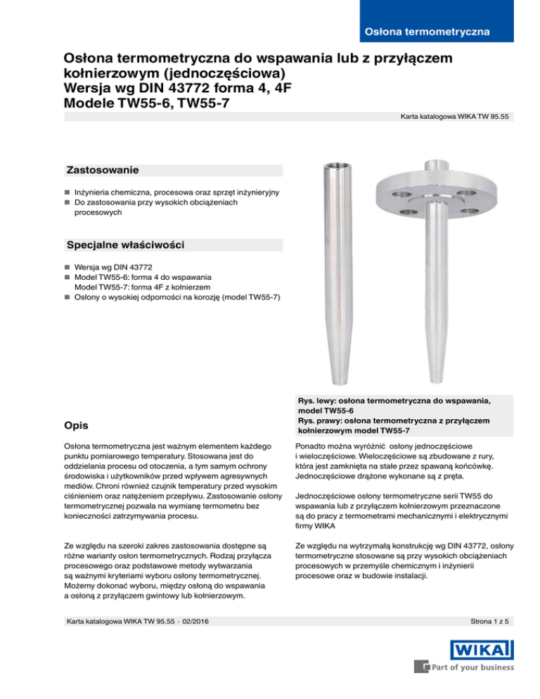 Osłona termometryczna Osłona termometryczna do wspawania lub z przyłączem kołnierzowym (jednoczęściowa) Wersja wg DIN 43772 forma 4, 4F Modele TW55-6, TW55-7 Karta katalogowa WIKA TW 95.55 Zastosowanie ■■ Inżynieria chemiczna, procesowa oraz sprzęt inżynieryjny ■■ Do zastosowania przy wysokich obciążeniach procesowych Specjalne właściwości ■■ Wersja wg DIN 43772 ■■ Model TW55-6: forma 4 do wspawania Model TW55-7: forma 4F z kołnierzem ■■ Osłony o wysokiej odporności na korozję (model TW55-7) Opis Rys. lewy: osłona termometryczna do wspawania, model TW55-6 Rys. prawy: osłona termometryczna z przyłączem kołnierzowym model TW55-7 Osłona termometryczna jest ważnym elementem każdego punktu pomiarowego temperatury. Stosowana jest do oddzielania procesu od otoczenia, a tym samym ochrony środowiska i użytkowników przed wpływem agresywnych mediów. Chroni również czujnik temperatury przed wysokim ciśnieniem oraz natężeniem przepływu. Zastosowanie osłony termometrycznej pozwala na wymianę termometru bez konieczności zatrzymywania procesu. Ponadto można wyróżnić osłony jednoczęściowe i wieloczęściowe. Wieloczęściowe są zbudowane z rury, która jest zamknięta na stałe przez spawaną końcówkę. Jednoczęściowe drążone wykonane są z pręta. Ze względu na szeroki zakres zastosowania dostępne są różne warianty osłon termometrycznych. Rodzaj przyłącza procesowego oraz podstawowe metody wytwarzania są ważnymi kryteriami wyboru osłony termometrycznej. Możemy dokonać wyboru, między osłoną do wspawania a osłoną z przyłączem gwintowy lub kołnierzowym. Ze względu na wytrzymałą konstrukcję wg DIN 43772, osłony termometryczne stosowane są przy wysokich obciążeniach procesowych w przemyśle chemicznym i inżynierii procesowe oraz w budowie instalacji. Karta katalogowa WIKA TW 95.55 ∙ 02/2016 Jednoczęściowe osłony termometryczne serii TW55 do wspawania lub z przyłączem kołnierzowym przeznaczone są do pracy z termometrami mechanicznymi i elektrycznymi firmy WIKA Strona 1 z 5 Inne przyłącza procesowe Opcjonalnie Materiał osłony termometrycznej Stal CrNi 1.4571, 316/316L Stal 1.0460, 1.5415, 1.7335, 1.7380 ■■ Inne materiały i wymiary Przyłącze procesowe ■■ Zew. średnica osłony termometrycznej (średnica główki) Ø 18 mm, Ø 24 mm, Ø 26 mm, Ø 32 mm ... ■■ Kołnierze wg krajowych i międzynarodowych standardów, takich jak np. EN 1092-1, DIN 2527, ASME ■■ Certyfikaty i świadectwa ■■ W aplikacjach krytycznych zaleca się dokonanie kalkulacji osłony wg Dittrich/Klotter. Opcja ta jest oferowana przez firmę WIKA. Więcej informacji na temat kalkulacji osłon termometrycznych znajduje się w informacji technicznej IN 00.15. Przyłącze do termometru Gwinty wew.: M14 x 1,5, M18 x 1,5, G ½, G ¾ Otwór Ø 3,5 mm, Ø 7 mm, Ø 9 mm, Ø 11 mm Długość zanurzeniowa U1, długość stożka U i długość całkowita L Wersje w innych kombinacjach patrz tabela 4 Powłoka ochronna ■■ PFA Grubość powłoki min. 0.4 mm (standard) or min. 0.6 mm (opcjonalnie) ■■ ECTFE (Halar®) Grubość warstwy min. 0,6 mm Maks. przyłącze procesowe, ciśnienie procesowe Zależne od ■■ Schemat obciążenia DIN 43772 ■■ Wersja osłony termometrycznej - Wymiary - Materiał - Ciśnienie kołnierza - Powłoka ochronna ■■ Warunki procesowe - szybkość przepływu - gęstość medium Halar® ECTFE Stellite® jest zarejestrowanym znakiem towarowym firmy Solvay Solexis. Strona 2 z 5 Karta katalogowa WIKA TW 95.55 ∙ 02/2016 Wymiary w mm Ø F2 Model TW55-6 -0,2 3088944.02 Model TW55-7 Legenda: L Długość całkowita U1 Długość zanurzeniowa U Długość końcówki N Przyłącze do termometru Ø d1 Otwór Ø F2 Zew. średnica osłony termometrycznej (średnica główki) Ø F3 Średnica końcówki M Długość szyjki przedłużeniowej Model TW55-6 z szyjką przedłużeniową Szyjka przedłużeniowa Standardowe długości model TW55-7 Wymiary w mm L 200 U1 125 275 65 260 410 U 1) Długość standardowa model TW55-6 Waga w kg DN 25, PN 40 DN 50, PN 40 190 2,1 340 2,3 130 1,9 Wymiary w mm Waga w kg L U 65 0,24 4,0 110 73 0,23 4,2 140 65 0,34 170 133 0,34 200 65 0,54 200 125 0,45 3,8 110 260 125 0,65 410 2) 275 0,92 Standardowe przyłącze gwintowe Wymiary w mm N Ø d1 3,5 18 9 16 13 M18 x 1,5 7 24 12,5 16 13 M14 x 1,5 Ø F2 Ø F3 H1 H2 G½ 7 26 12,5 19 15 G½ 9 26 15 19 15 G¾ 11 32 17 22 17 1) Nie dla średnicy otworu Ø d1 = 3,5 mm 2) Standard dla szyjki przedłurzeniowej M = 165 mm Karta katalogowa WIKA TW 95.55 ∙ 02/2016 Strona 3 z 5 Odpowiednie długości zanurzeniowe (termometry mechaniczne) ■■ Termometr mechaniczny Forma budowy złącza S, 4, 5 2 3 ■■ Termometry maszynowe Długość zanurzeniowa czujnika l1 Forma budowy złącza l1 = L - 10 mm - l1 = L - 30 mm - E - l1 = L + M - 10 mm 3) bez szyjki przedłużeniowej z szyjką przedłużeniową Długość zanurzeniowa czujnika l1 bez szyjki przedłużeniowej z szyjką przedłużeniową - l1 = L + M - 10 mm 3) l1 = L - 10 mm 3 - 3) Standardowa długość szyjki przedłużeniowej M = 165 mm Różne kombinacje długości zanurzeniowej U1, długość stożka U i długość całkowita L w mm Osłona termometryczna Długość zanurzeniowa TW55-6 (forma 4 do wspawania) - Model TW55-7 (forma 4F z kołnierzem) Długość końcówki Długość całkowita 65, 73, 125, 133, 275 110, 140, 170, 200, 260, 410 U1 U 130, 190, 340 65, 125, 275 L 200, 260, 410 Chropowatość powierzchni uszczelnienia Norma kołnierza ASME B16.5 AARH w µcalach Ra w µm Rz w µm Smooth finish < 125 < 3,2 - RTJ < 63 < 1,6 - Stock finish 125 ... 250 3,2 ... 6,3 - Tongue/Groove < 125 < 3,2 - EN 1092-1 Forma B1 - 3,2 ... 12,5 12,5 ... 50 Forma B2 - 0,8 ... 3,2 3,2 ... 12,5 DIN 2527 Forma C - - 40 ... 160 Forma E - - < 16 Strona 4 z 5 Karta katalogowa WIKA TW 95.55 ∙ 02/2016 Wykres ciśnienie - temperatura 1) Osłona termometryczna model TW55 ze stali CrNi 1.45