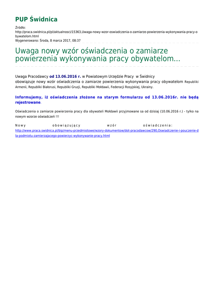 PUP Świdnica Źródło: http://praca.swidnica.pl/pl/aktualnosci/15363,Uwaga-nowy-wzor-oswiadczenia-o-zamiarze-powierzenia-wykonywania-pracy-o bywatelom.html Wygenerowano: Środa, 8 marca 2017, 08:37 Uwaga nowy wzór oświadczenia o zamiarze powierzenia wykonywania pracy obywatelom... Uwaga Pracodawcy od 13.06.2016 r. w Powiatowym Urzędzie Pracy w Świdnicy obowiązuje nowy wzór oświadczenia o zamiarze powierzenia wykonywania pracy obywatelom Republiki Armenii, Republiki Białorusi, Republiki Gruzji, Republiki Mołdawii, Federacji Rosyjskiej, Ukrainy. Informujemy, iż oświadczenia złożone na starym formularzu od 13.06.2016r. nie będą rejestrowane. Oświadczenia o zamiarze powierzenia pracy dla obywateli Mołdawii przyjmowane sa od dzisiaj (10.06.2016 r.) - tylko na nowym wzorze oświadczeń !!! Nowy obowiązujący wzór oświadczenia: http://www.praca.swidnica.pl/bip/menu-przedmiotowe/wzory-dokumentow/dot-pracodawcow/290,Oswiadczenie-i-pouczenie-d la-podmiotu-zamierzajacego-powierzyc-wykonywanie-pracy.html Załączniki do strony Oświadczenie dla podmiotu zamierzającego powierzyć wykonywanie pracy cudzoziemcowi 808.67 KB Metryka strony Data publikacji 10.06.2016 Data modyfikacji 10.06.2016Rejestr zmian Osoba publikująca: Krzysztof Bober Autor: Liczba wejść: 671 Drukuj Generuj PDF Powiadom znajomego Wstecz