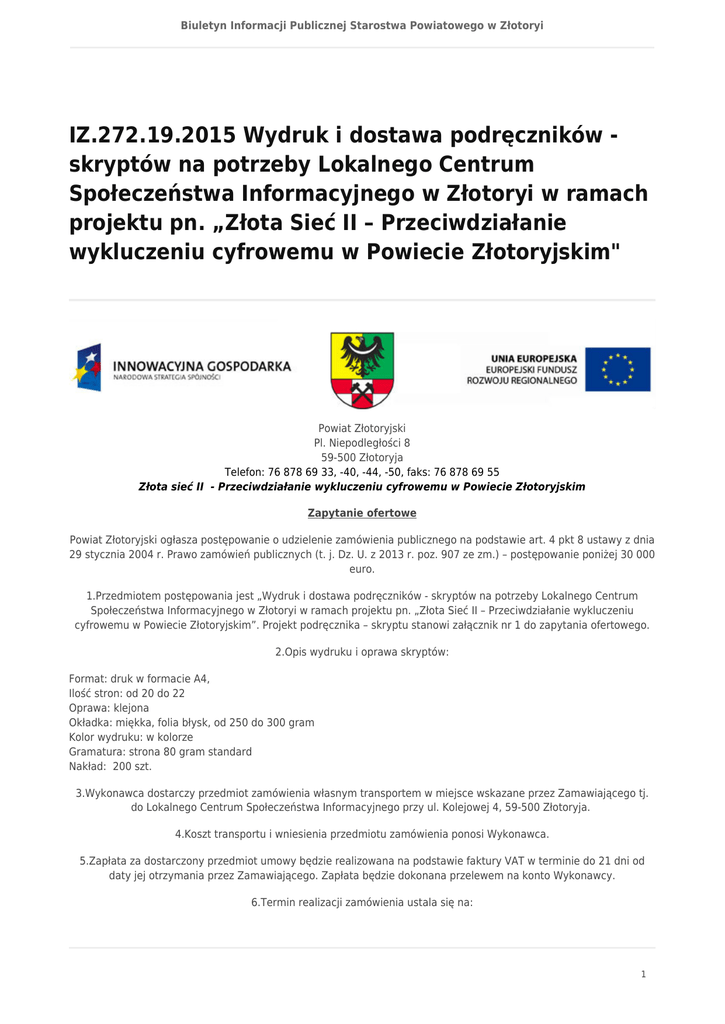 Biuletyn Informacji Publicznej Starostwa Powiatowego w Złotoryi IZ.272.19.2015 Wydruk i dostawa podręczników skryptów na potrzeby Lokalnego Centrum Społeczeństwa Informacyjnego w Złotoryi w ramach projektu pn. „Złota Sieć II – Przeciwdziałanie wykluczeniu cyfrowemu w Powiecie Złotoryjskim" Powiat Złotoryjski Pl. Niepodległości 8 59-500 Złotoryja Telefon: 76 878 69 33, -40, -44, -50, faks: 76 878 69 55 Złota sieć II - Przeciwdziałanie wykluczeniu cyfrowemu w Powiecie Złotoryjskim Zapytanie ofertowe Powiat Złotoryjski ogłasza postępowanie o udzielenie zamówienia publicznego na podstawie art. 4 pkt 8 ustawy z dnia 29 stycznia 2004 r. Prawo zamówień publicznych (t. j. Dz. U. z 2013 r. poz. 907 ze zm.) – postępowanie poniżej 30 000 euro. 1.Przedmiotem postępowania jest „Wydruk i dostawa podręczników - skryptów na potrzeby Lokalnego Centrum Społeczeństwa Informacyjnego w Złotoryi w ramach projektu pn. „Złota Sieć II – Przeciwdziałanie wykluczeniu cyfrowemu w Powiecie Złotoryjskim”. Projekt podręcznika – skryptu stanowi załącznik nr 1 do zapytania ofertowego. 2.Opis wydruku i oprawa skryptów: Format: druk w formacie A4, Ilość stron: od 20 do 22 Oprawa: klejona Okładka: miękka, folia błysk, od 250 do 300 gram Kolor wydruku: w kolorze Gramatura: strona 80 gram standard Nakład: 200 szt. 3.Wykonawca dostarczy przedmiot zamówienia własnym transportem w miejsce wskazane przez Zamawiającego tj. do Lokalnego Centrum Społeczeństwa Informacyjnego przy ul. Kolejowej 4, 59-500 Złotoryja. 4.Koszt transportu i wniesienia przedmiotu zamówienia ponosi Wykonawca. 5.Zapłata za dostarczony przedmiot umowy będzie realizowana na podstawie faktury VAT w terminie do 21 dni od daty jej otrzymania przez Zamawiającego. Zapłata będzie dokonana przelewem na konto Wykonawcy. 6.Termin realizacji zamówienia ustala się na: 1 Biuletyn Informacji Publicznej Starostwa Powiatowego w Złotoryi - rozpoczęcie: od dnia podpisania umowy; - zakończenie: do 20 dni od podpisania umowy. 7.Jedynym kryterium oceny oferty jakie Zamawiający przyjął w tym postępowaniu jest cena. Ma ona znaczenie w 100%. 8.Opis sposobu oceniania oferty: W kryterium tym Zamawiającemu obliczenia punktów zależy aby oferty przedstawiały jak najniższy wskaźnik ceny. Do zostanie zastosowany następujący wzór arytmetyczny: cena: (cena najkorzystniejsza : cena badana) X 100 max ilość punktów możliwych do otrzymania 9.Zamawiający zastosuje zaokrąglenie każdego wyniku do dwóch miejsc po przecinku. 10.Zamawiający wybierze ofertę najkorzystniejszą spośród ofert spełniających wymagania Zamawiającego, przez co należy rozumieć ofertę z najniższą ceną. 11.Jeżeli Zamawiający nie może dokonać wyboru oferty najkorzystniejszej ze względu na to, że zostały złożone oferty o takiej samej cenie, Zamawiający wezwie Wykonawców, którzy złożyli te oferty, do złożenia w terminie określonym przez Zamawiającego ofert dodatkowych. 12.Wykonawcy składający oferty dodatkowe nie mogą zaoferować cen wyższych niż zaoferowane w złożonych ofertach. 13.Opis sposobu obliczania ceny: Wykonawca oblicza cenę oferty zawierającą podatek od towarów i usług. Cena oferty musi być wyrażona w złotych polskich. 14.Powiat Złotoryjski udzieli zamówienia Wykonawcy, który złoży ofertę z najniższą ceną brutto za wykonanie całości zamówienia. 15.Zamawiający ustalił termin składania ofert cenowych Wykonawców do dnia 08.05.2015 r. Oferty należy złożyć w formie pisemnej w Starostwie Powiatowym w Złotoryi, Pl. Niepodległości 8, pokój 101 – sekretariat w zamkniętej kopercie z dopiskiem: Oferta na postępowanie pn. „Wydruk podręczników - skryptów na potrzeby Lokalnego Centrum Społeczeństwa Informacyjnego w Złotoryi w ramach projektu pn. „Złota Sieć II – Przeciwdziałanie wykluczeniu cyfrowemu w Powiecie Złotoryjskim”. 16.Zamawiający prosi o złożenie oferty na druku załączonym do niniejszego zapytania pn. „Wzór oferty cenowej”. (załącznik Nr 2 do zapytania ofertowego). 17.Z Wykonawcą, który zaproponuje najniższą cenę zostanie podpisana umowa w sprawie zamówienia publicznego, zgodnie ze wzorem stanowiącym Załącznik Nr 3 do niniejszego zapytania. 18.Zamawiający zastrzega sobie możliwość unieważnienia postępowania bez podania przyczyny. Modyfikacja zapytania ofertowego Złotoryja, 05.05.2015 r. IZ.272.19.2015 Powiat Złotoryjski – Zamawiający w postępowaniu pn.” Wydruk i dostawa podręczników - skryptów na potrzeby Lokalnego Centrum Społeczeństwa Informacyjnego w Złotoryi w ramach projektu pn. „Złota Sieć II – Przeciwdziałanie 2 Biuletyn Informacji Publicznej Starostwa Powiatowego w Złotoryi wykluczeniu cyfrowemu w Powiecie Złotoryjskim” informuje, że dokonano modyfikacji opisu przedmiotu zamówienia następujący sposób: Było: Format: druk w formacie A4, Ilość stron: od 20 do 22 Oprawa: klejona Okładka: miękka, folia błysk, od 250 do 300 gram Kolor wydruku: w kolorze Gramatura: strona 80 gram standard Nakład: 200 szt. Zmieniono na: Format: druk w formacie A4, Ilość stron: od 20 do 22 Oprawa: szycie zszywkami-płaskie pionowe Okładka: kreda błysk 250g foliowana Kolor wydruku: w kolorze Środek: kreda błysk 130g Nakład: 200 szt. 3