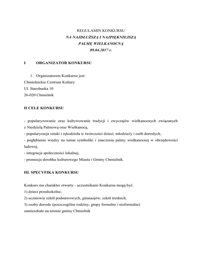 REGULAMIN KONKURSU NA NAJDŁUŻSZĄ I NAJPIĘKNIEJSZĄ PALMĘ WIELKANOCNĄ 09.04.2017 r. I ORGANIZATOR KONKURSU 1. Organizatorem Konkursu jest: Chmielnickie Centrum Kultury Ul. Starobuska 10 26-020 Chmielnik II CELE KONKURSU - popularyzowanie oraz kultywowanie tradycji i zwyczajów wielkanocnych związanych z Niedzielą Palmową oraz Wielkanocą, - popularyzacja sztuki i rękodzieła w twórczości dzieci, młodzieży i osób dorosłych, - pogłębienie wiedzy na temat symboliki i znaczenia palmy wielkanocnej w obrzędowości ludowej, - integracja społeczności lokalnej, - promocja dorobku kulturowego Miasta i Gminy Chmielnik. III. SPECYFIKA KONKURSU Konkurs ma charakter otwarty - uczestnikami Konkursu mogą być: 1) dzieci przedszkolne, 2) uczniowie szkół podstawowych, gimnazjów, szkół średnich, 3) osoby dorosłe (poszczególne rodziny, grupy formalne i nieformalne) zamieszkałe na terenie gminy Chmielnik IV. WARUNKI UCZESTNICTWA W KONKURSIE 1) warunkiem uczestnictwa w Konkursie jest wykonanie tradycyjnej palmy wielkanocnej w technice: - materiały naturalne (żarnowiec, bukszpan, bazie, suche kwiaty, wydmuszki, wstążki, krepina, bibuła itp.) Uwaga: fabrycznie wyprodukowane, gotowe palmy oraz palmy zawierające większość sztucznych elementów nie będą brane pod uwagę, przy ocenie w ramach Konkursu; - wysokość palmy musi wynosić minimum 100 cm. 2) palma może być wykonana samodzielnie – przez jedną osobę lub w ramach pracy zespołowej, np. dziecko ze swoją rodziną, grupa osób – np. KGW, klasa szkolna itp. 3) każda palma zgłoszona do Konkursu musi być oznaczona trwałą „wizytówką”, mocno przytwierdzoną do palmy, zawierającą następujące informacje: imię i nazwiska twórcy lub reprezentanta grupy twórców, jak również wiek i adres zamieszkania tej osoby oraz nr telefonu do kontaktu. 4) prace nie spełniające wymogów niniejszego regulaminu, nie będą brane pod uwagę, przy ocenie w ramach Konkursu. 5) Prezentacja palm oraz rozstrzygnięcie konkursu odbędzie się na Rynku w Chmielniku w dniu 09 kwietnia 2017 r. o godzinie 14:00 V. OCENA PRAC KONKURSOWYCH I NAGRODY 1.Oceny prac zgłoszonych do Konkursu dokona Komisja powołana przez Organizatorów Konkursu, w dwóch kategoriach: NAJPIĘKNIEJSZA PALMA, NAJDŁUŻSZA PALMA. 2. Kryteria oceny prac konkursowych, którymi będzie kierować się Komisja Konkursowa: - ogólne wrażenie artystyczne - estetyka i staranność wykonania pracy - pomysłowość i oryginalność pracy (forma, technika, kompozycja, instalacja) - trwałość pracy, różnorodność, skala i bogactwo użytych materiałów -wielkość pracy. 3.Autorzy najlepszych prac- po jednej z każdej kategorii podlegającej ocenie, otrzymają atrakcyjne nagrody rzeczowe. 4.Organizatorzy dopuszczają możliwość przyznania dodatkowych wyróżnień od indywidualnych darczyńców. VI. POSTANOWIENIA KOŃCOWE 1. Organizator zastrzega sobie prawo do zmiany Regulaminu w trakcie trwania konkursu bez podania przyczyny. 2. Zgłoszenie do udziału w konkursie jest równoznaczne z akceptacją niniejszego Regulaminu 3. Organizator nie ponosi odpowiedzialności za szkody /zarówno majątkowe, jak i niemajątkowe/ poniesione przez uczestnika konkursu bądź przez osoby trzecie, w związku z uczestnictwem w konkursie. 4. W kwestiach spornych decyduje Komisja Konkursowa. 5. Niniejszy regulamin podlega ogłoszeniu z możliwością pobrania i wydruku na stronie internetowej Chmielnickiego Centrum Kultury. 6. W sprawach nieuregulowanych niniejszym Regulaminem zastosowanie mają przepisy Kodeksu Cywilnego. 7. W sprawach merytorycznych i formalnych osobą odpowiedzialną za kontakt z uczestnikami jest: Alicja Adach-Białowąs, tel. 41 354 23 97 lub 600 633 290, od poniedziałku do piątku w godzinach 8:00-15:00 e-mail: [email protected]