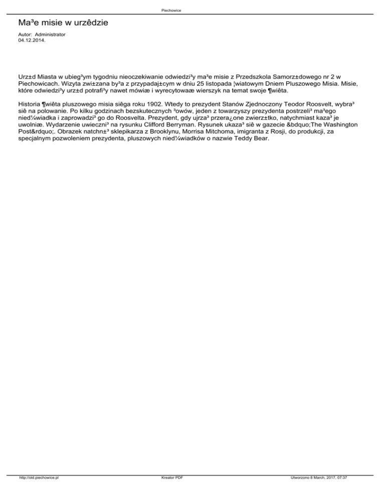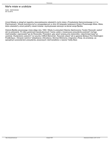 Piechowice Ma³e misie w urzêdzie Autor: Administrator 04.12.2014. Urz±d Miasta w ubieg³ym tygodniu nieoczekiwanie odwiedzi³y ma³e misie z Przedszkola Samorz±dowego nr 2 w Piechowicach. Wizyta zwi±zana by³a z przypadaj±cym w dniu 25 listopada ¦wiatowym Dniem Pluszowego Misia. Misie, które odwiedzi³y urz±d potrafi³y nawet mówiæ i wyrecytowaæ wierszyk na temat swoje ¶wiêta. Historia ¶wiêta pluszowego misia siêga roku 1902. Wtedy to prezydent Stanów Zjednoczony Teodor Roosvelt, wybra³ siê na polowanie. Po kilku godzinach bezskutecznych ³owów, jeden z towarzyszy prezydenta postrzeli³ ma³ego nied¼wiadka i zaprowadzi³ go do Roosvelta. Prezydent, gdy ujrza³ przera¿one zwierz±tko, natychmiast kaza³ je uwolniæ. Wydarzenie uwieczni³ na rysunku Clifford Berryman. Rysunek ukaza³ siê w gazecie „The Washington Post”. Obrazek natchn±³ sklepikarza z Brooklynu, Morrisa Mitchoma, imigranta z Rosji, do produkcji, za specjalnym pozwoleniem prezydenta, pluszowych nied¼wiadków o nazwie Teddy Bear. http://old.piechowice.pl Kreator PDF Utworzono 8 March, 2017, 07:37