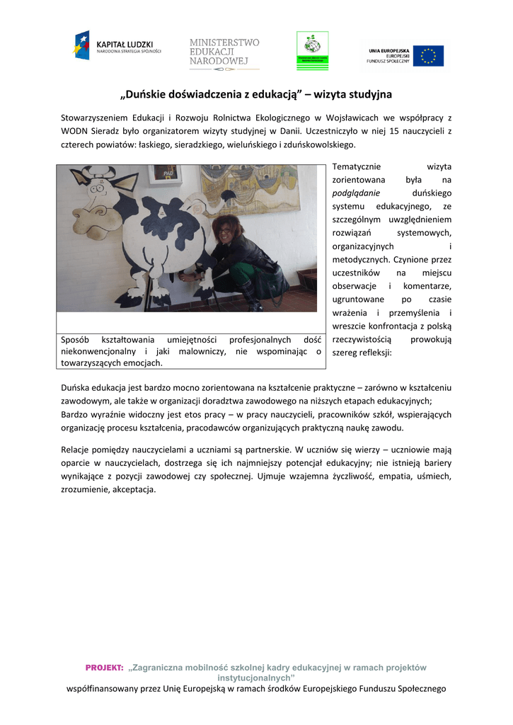 „Duńskie doświadczenia z edukacją” – wizyta studyjna Stowarzyszeniem Edukacji i Rozwoju Rolnictwa Ekologicznego w Wojsławicach we współpracy z WODN Sieradz było organizatorem wizyty studyjnej w Danii. Uczestniczyło w niej 15 nauczycieli z czterech powiatów: łaskiego, sieradzkiego, wieluńskiego i zduńskowolskiego. Sposób kształtowania umiejętności profesjonalnych dość niekonwencjonalny i jaki malowniczy, nie wspominając o towarzyszących emocjach. Tematycznie wizyta zorientowana była na podglądanie duńskiego systemu edukacyjnego, ze szczególnym uwzględnieniem rozwiązań systemowych, organizacyjnych i metodycznych. Czynione przez uczestników na miejscu obserwacje i komentarze, ugruntowane po czasie wrażenia i przemyślenia i wreszcie konfrontacja z polską rzeczywistością prowokują szereg refleksji: Duńska edukacja jest bardzo mocno zorientowana na kształcenie praktyczne – zarówno w kształceniu zawodowym, ale także w organizacji doradztwa zawodowego na niższych etapach edukacyjnych; Bardzo wyraźnie widoczny jest etos pracy – w pracy nauczycieli, pracowników szkół, wspierających organizację procesu kształcenia, pracodawców organizujących praktyczną naukę zawodu. Relacje pomiędzy nauczycielami a uczniami są partnerskie. W uczniów się wierzy – uczniowie mają oparcie w nauczycielach, dostrzega się ich najmniejszy potencjał edukacyjny; nie istnieją bariery wynikające z pozycji zawodowej czy społecznej. Ujmuje wzajemna życzliwość, empatia, uśmiech, zrozumienie, akceptacja. PROJEKT: „Zagraniczna mobilność szkolnej kadry edukacyjnej w ramach projektów instytucjonalnych” współfinansowany przez Unię Europejską w ramach środków Europejskiego Funduszu Społecznego Codzienność w duńskim Collage w Beder – lekcja bynajmniej nie pokazowa. Naturalność – nikt nie maluje „trawy na zielono” na przyjazd polskiej delegacji. Przewidywalność, normalność i właśnie naturalność – to cechy duńskiej szkoły. Nie ma akcyjności – uczniowie i nauczyciele realizują wspólnie przyjęty harmonogram działań i są w swoich poczynaniach pewni, spokojni, zrównoważeni i otwarci na każdą propozycję - merytoryczną. „Siła spokoju” – to widoczna cecha w pracy nauczycieli. Nauczyciele zorientowani są na pracę z uczniem. Nie udziela im się obsesja „papierowej” edukacji. W poczynaniach, w deklaracjach, w efektach oraz w wsparciu systemu widoczny jest profesjonalizm. Nauczyciel jest partnerem ucznia, wierzy w niego; nie wzmacnia swojej oceny deprecjonowaniem innych. Skandynawska powściągliwość i protestancka kultura pracy zdają się być bezcennym kapitałem i cnotą. Tak wygląda miejsce do samodzielnej pracy grup uczniowskich, które nie mogą się skupić w większej klasie, gdzie pracuje kilka grup. Interesujące również postępowanie z krzesłami po zakończonej pracy Fot. Ewa Ruszkowska PROJEKT: „Zagraniczna mobilność szkolnej kadry edukacyjnej w ramach projektów instytucjonalnych” współfinansowany przez Unię Europejską w ramach środków Europejskiego Funduszu Społecznego A co Państwo na taką czytelnię? Duńska szkoła i opieka przedszkolna nie wydają się być „zniewolone” przez instytucje typu: zewnętrzny nadzór pedagogiczny, sanepid, i innej maści organy kontrolno-monitorująconadzorująco-kontrolne. Bliskość życia z naturą, funkcjonalność rozwiązań i działań, wewnętrzna odpowiedzialność, kult zdrowotności, witalność, społeczny utylitaryzm – wszystkie te elementy sprawiają, że szkoła jest wolna, autonomiczna i samoodpowiedzialna. Bezpieczna i rozwijająca. PROJEKT: „Zagraniczna mobilność szkolnej kadry edukacyjnej w ramach projektów instytucjonalnych” współfinansowany przez Unię Europejską w ramach środków Europejskiego Funduszu Społecznego Baza techno-dydaktyczna jest bardzo zróżnicowana. Dedykowana edukacji zawodowej jest najnowocześniejsza z nowoczesnych. Tu na pewno wyznacza się standardy światowe. W edukacji ogólnokształcącej baza jest „zwyczajna”, w myśl polskich standardów – uboga. Znakomicie jednak spełniająca swój cel, fenomenalnie zaangażowana do funkcjonalnej edukacji. U góry jedna z pracowni ćwiczeń praktycznych (hala maszyn, spawalnia, warsztat naprawczy, pracownia obróbki drewna i metalu) w Agricollage w Aalborgu widziana z platformy widokowej, która jest jednocześnie miejscem wypoczynku dla uczniów. U dołu lekcja teoretyczna o hodowli norek PROJEKT: „Zagraniczna mobilność szkolnej kadry edukacyjnej w ramach projektów instytucjonalnych” współfinansowany przez Unię Europejską w ramach środków Europejskiego Funduszu Społecznego Duński model zarządzania szkołą jest płaski. Dyrektor korzysta z wiedzy i doświadczenia wszystkich pracowników szkoły. Nauczyciele znakomicie włączają się w zarządzanie. Dyrektor jest jednym z wielu. Genialne! Szczegółowa analiza duńskiego systemu edukacji i wskazywanie miejsca Agricollage Aalborg w tym systemie. Porównywaliśmy również duński system edukacji do polskiego i dzieliliśmy się doświadczeniami. Duński system edukacji powszechnej ściśle współpracuje ze światem akademickim, z instytucjami badawczymi, placówkami wdrożeniowymi, z pracodawcami. Uczenie się jest przyjemnością poznawania, doświadczania, sprawdzania się. PROJEKT: „Zagraniczna mobilność szkolnej kadry edukacyjnej w ramach projektów instytucjonalnych” współfinansowany przez Unię Europejską w ramach środków Europejskiego Funduszu Społecznego