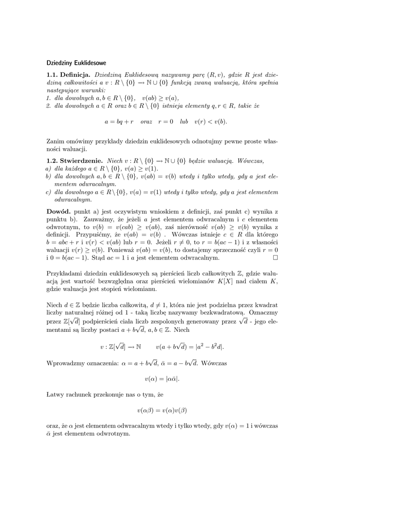 1.1. Definicja. Dziedzina, Euklidesowa, nazywamy pare, (R, v), gdzie R jest dziedzina, caÃlkowitości a v : R \ {0} −
